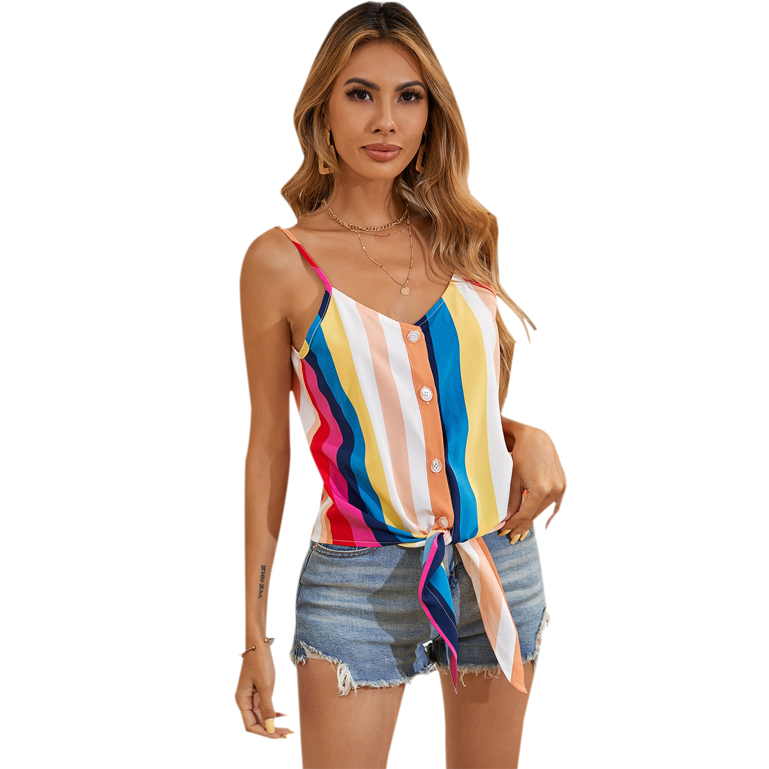 51195 # 유럽 및 미국 스타일 레저 쉬폰 캐미솔 여성용 새로운 스트라이프 여성용 민소매 V 넥 셔츠