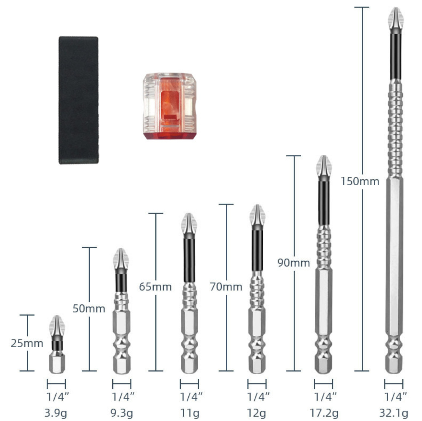 • 6개입 도금 (25/50/65/70/90/150) + 투명 레드 자화기 1개 + 6구 받침대 1개 [비닐 포장] 99g