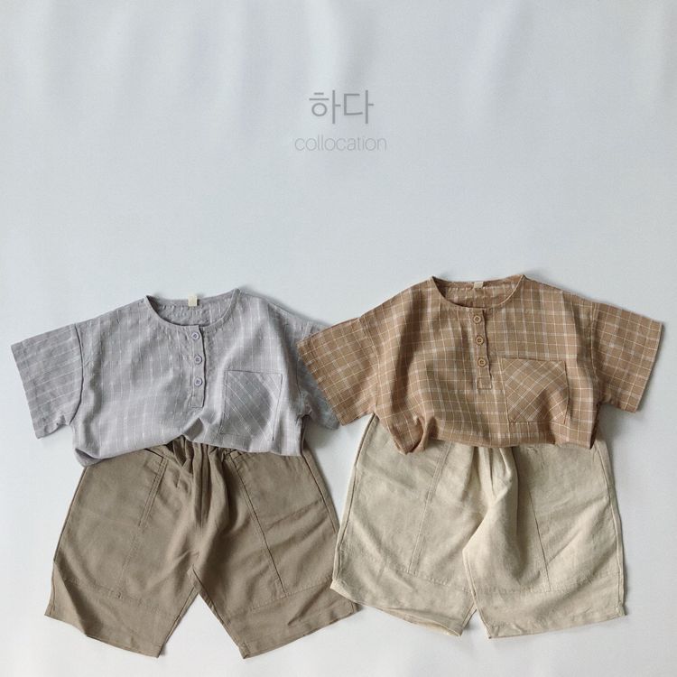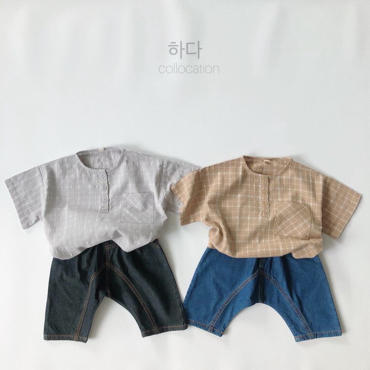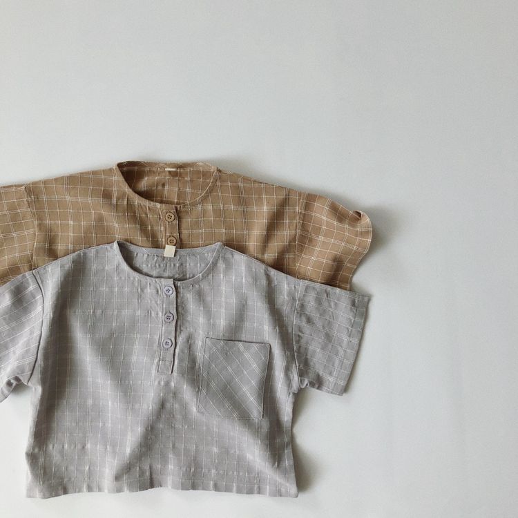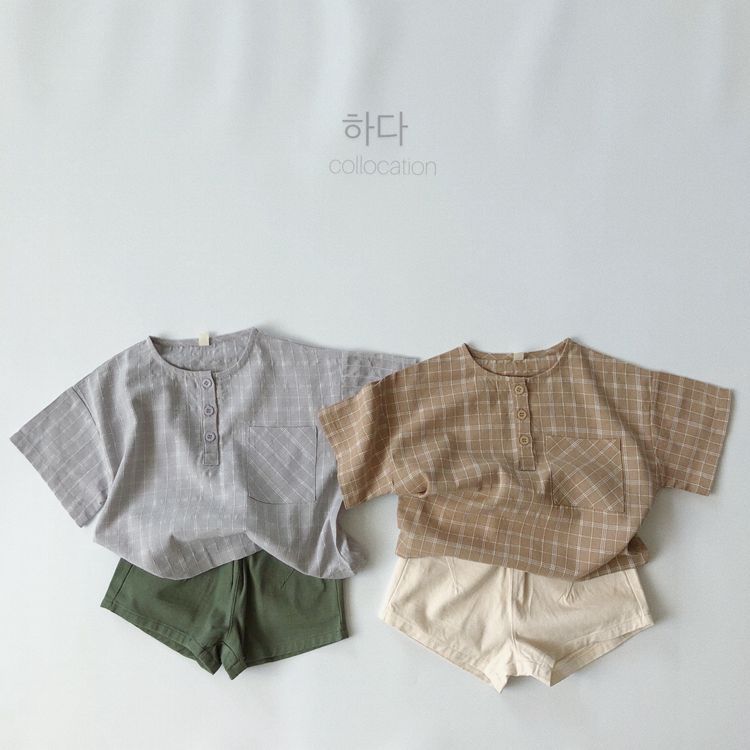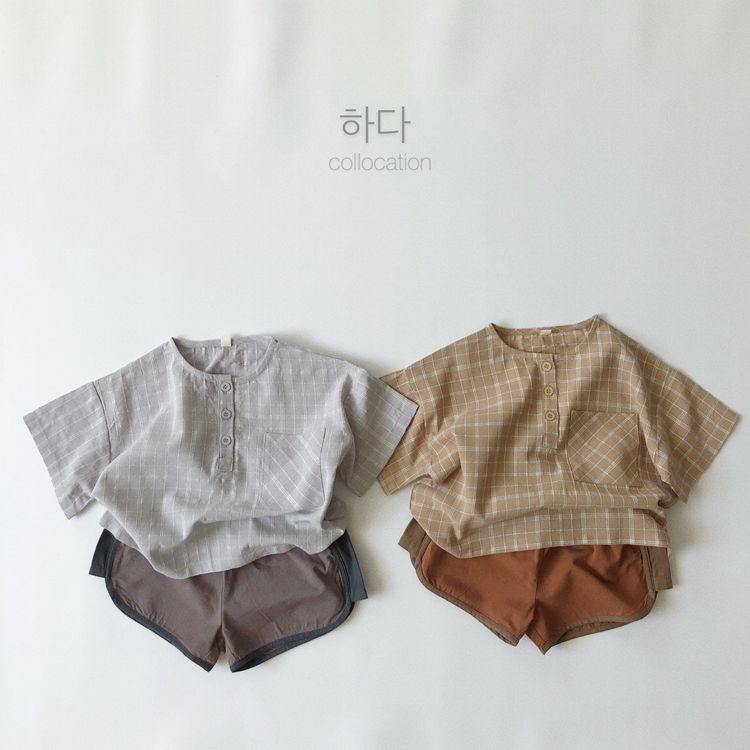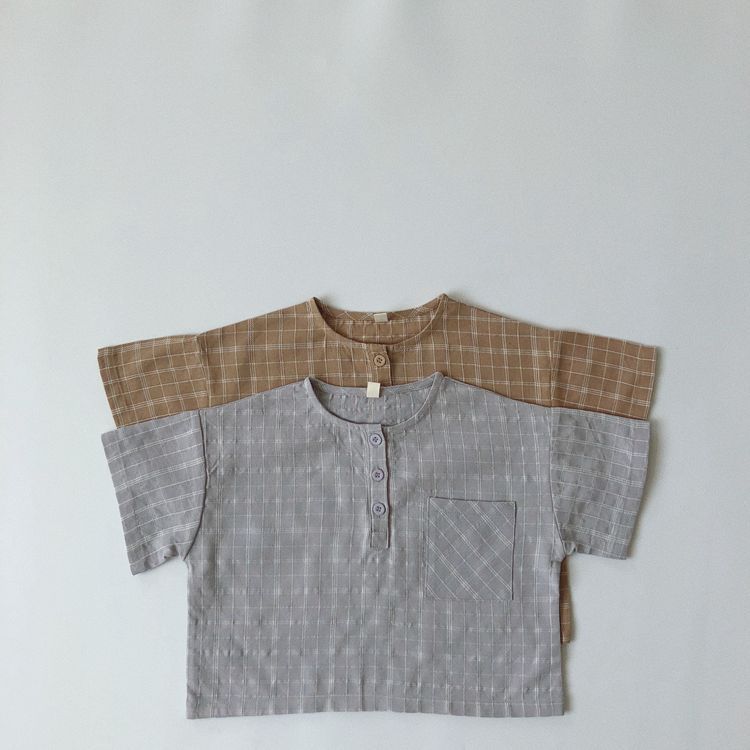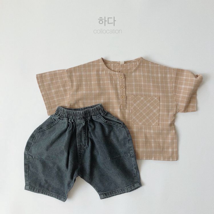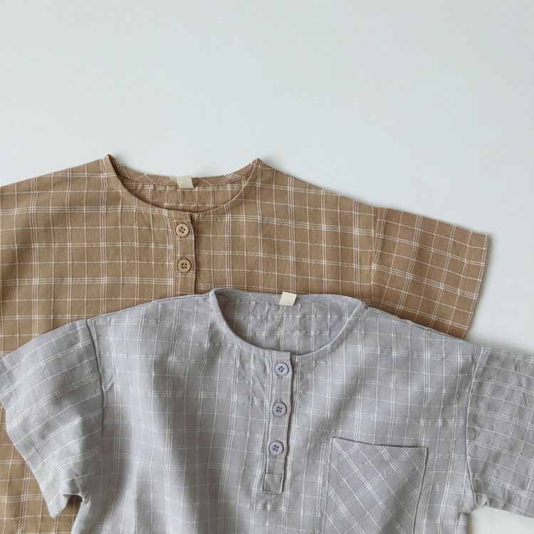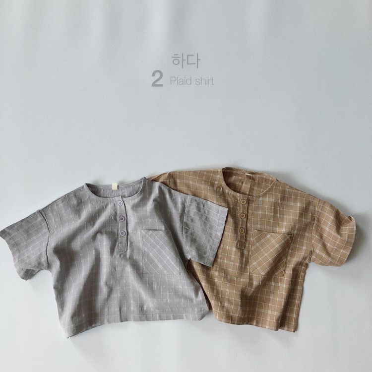 한국 어린이 문학 스타일 격자 무늬 셔츠 여름 소년과 소녀 가벼운 블라우스 티셔츠 라운드 넥 짧은 소매 탑스토어 가기