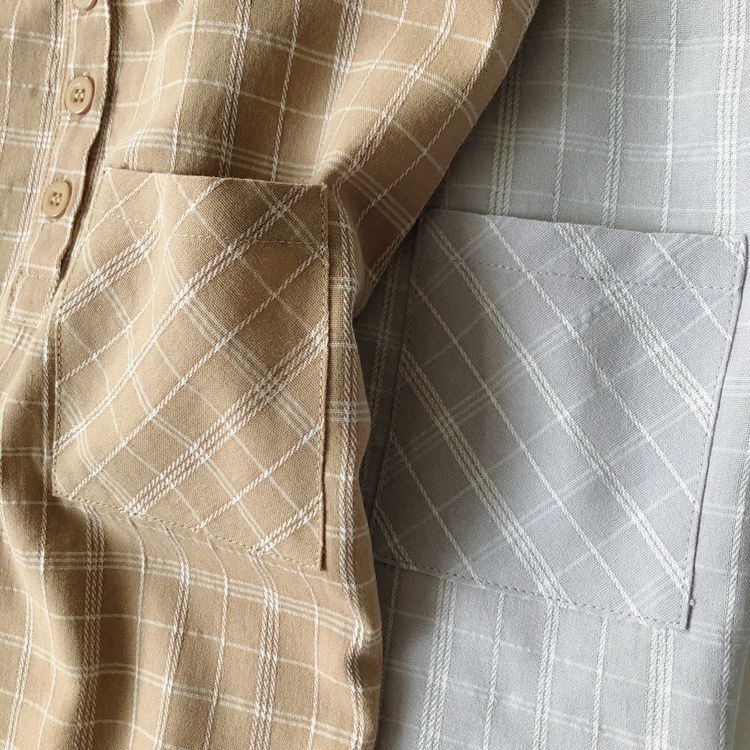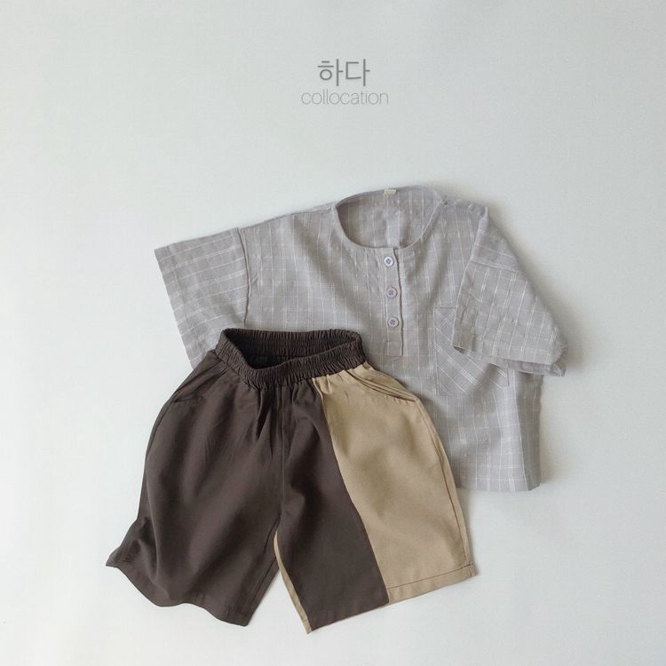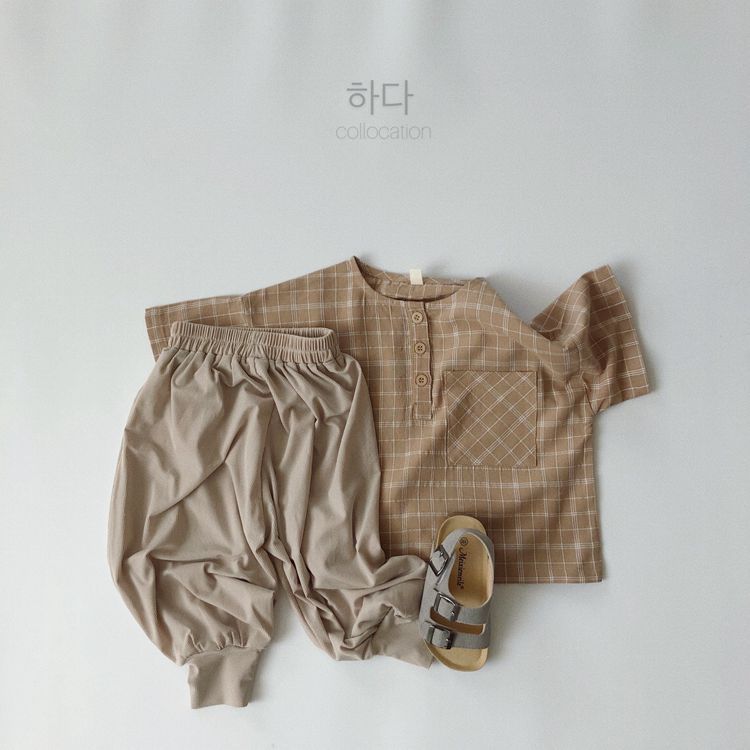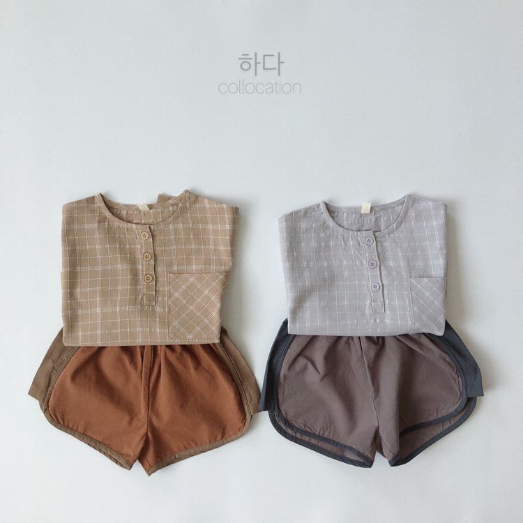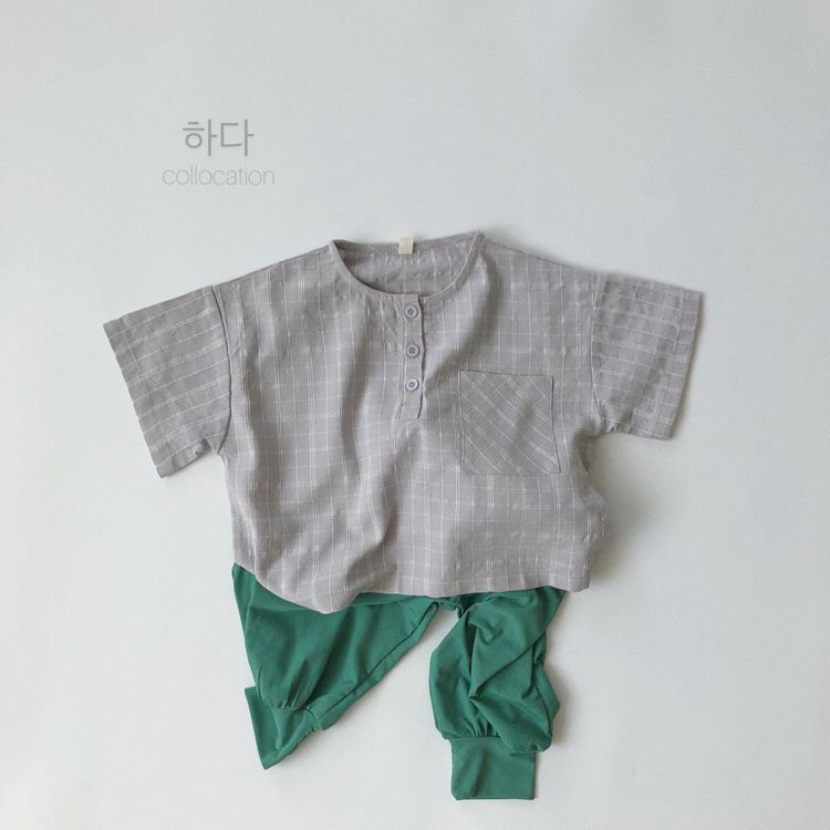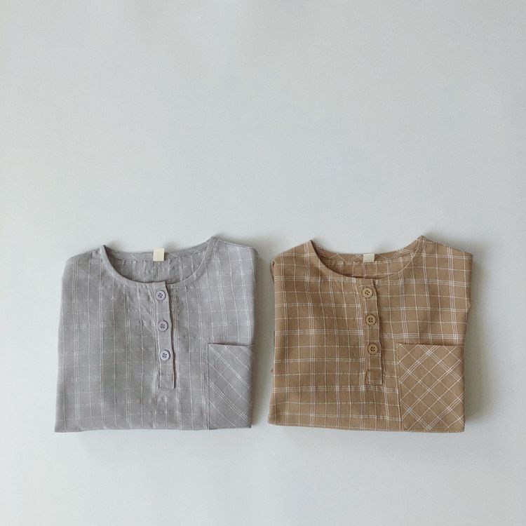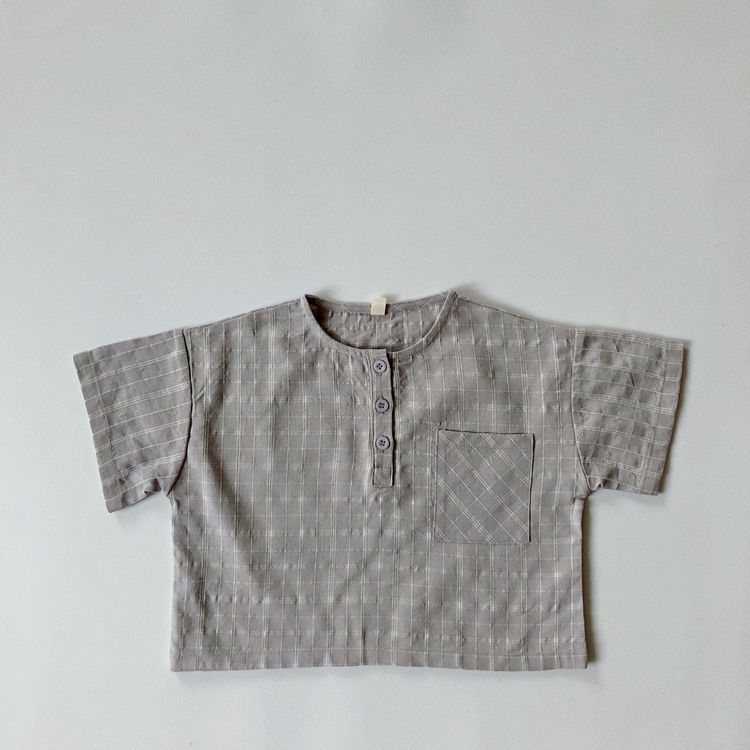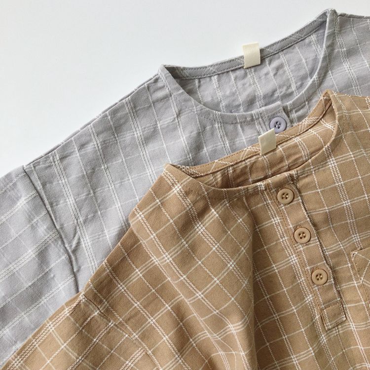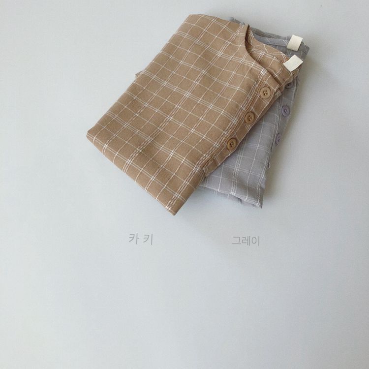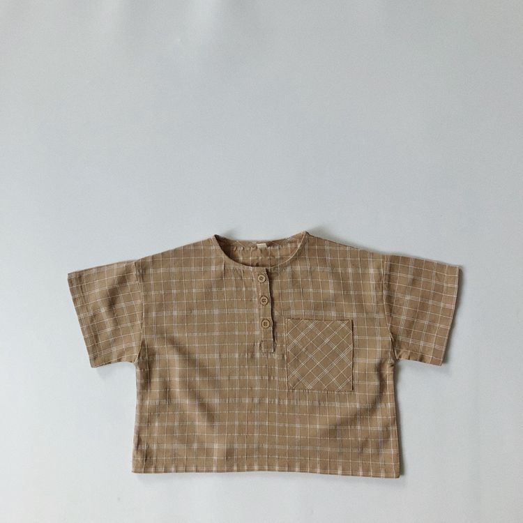 한국 어린이 문학 스타일 격자 무늬 셔츠 여름 소년과 소녀 가벼운 블라우스 티셔츠 라운드 넥 짧은 소매 탑스토어 가기