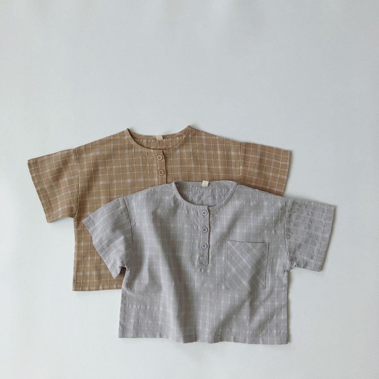 한국 어린이 문학 스타일 격자 무늬 셔츠 여름 소년과 소녀 가벼운 블라우스 티셔츠 라운드 넥 짧은 소매 탑