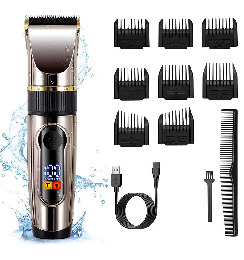 产品卖点:LED液晶数显 、IPX6级水洗 、锂电池 、大功率理发器、 2档加速功能、充插两用、三档旋转微调刀头(0.8/1.4/2MM)、低噪音、R型刀头圆角防护设计。线长1M
