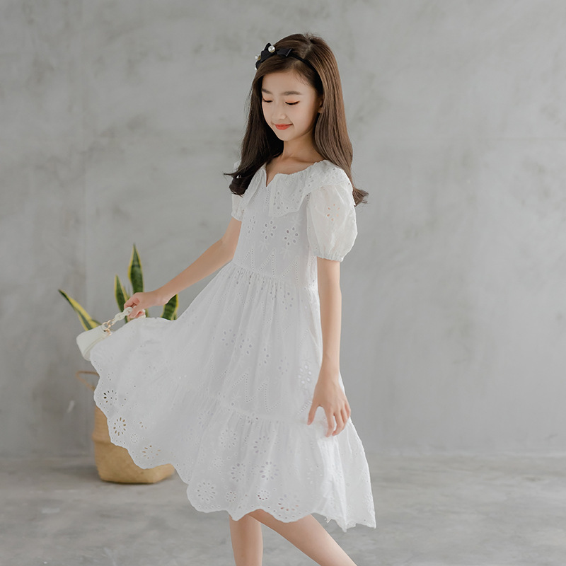 2023 한국 스타일 화이트 자수 레이스 V-넥 여아 원피스 세련된 인터넷 연예인 귀여운 어린이 공주 원피스스토어 가기