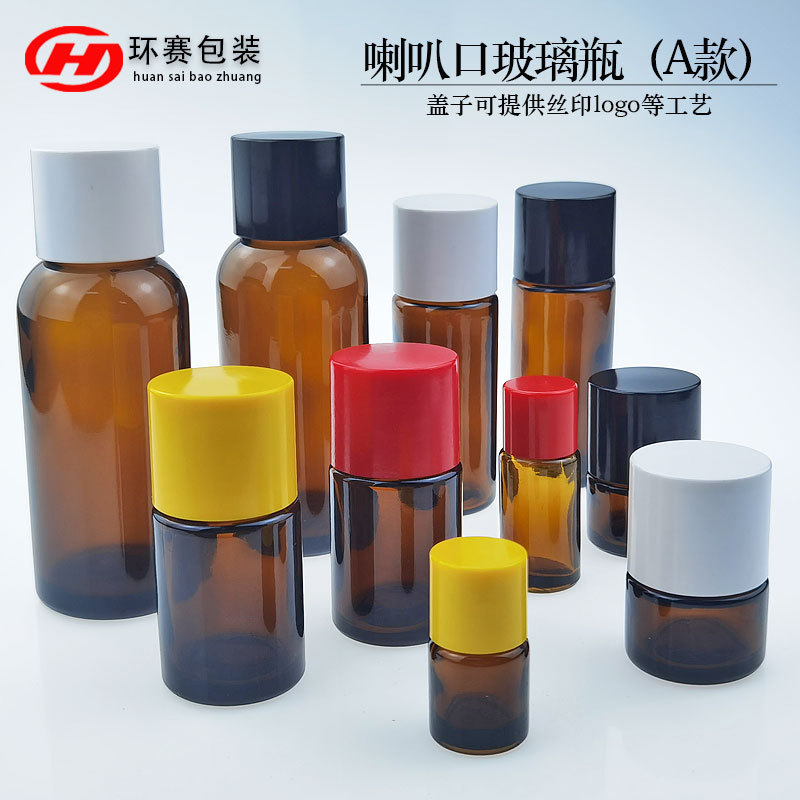재고 5-125ml 다크 브라운 에센셜 오일 병 벨 입 기름 약 병 페놀 커버 유리 필수 액체 병 로고스토어 가기