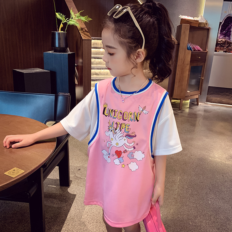 여자 반팔 티셔츠 스커트 2025 새로운 느슨한 스포츠 드레스 어린이 중간 길이 여름 드레스 유행 아동 의류