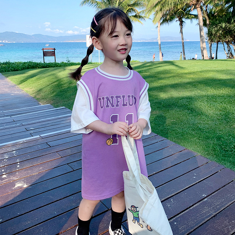 여자 반팔 티셔츠 스커트 2025 새로운 느슨한 스포츠 드레스 어린이 중간 길이 여름 드레스 유행 아동 의류스토어 가기