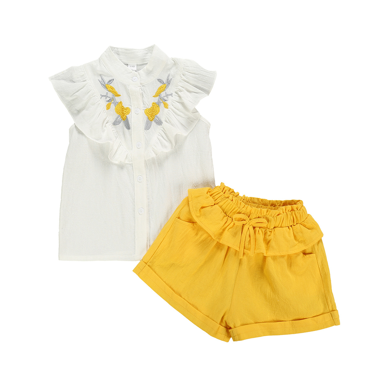 국경 간 여름 소녀 세트 도매 중국 스타일 자수 플라잉 슬리브 코튼 탑 세척 코튼 반바지 2 피스 세트