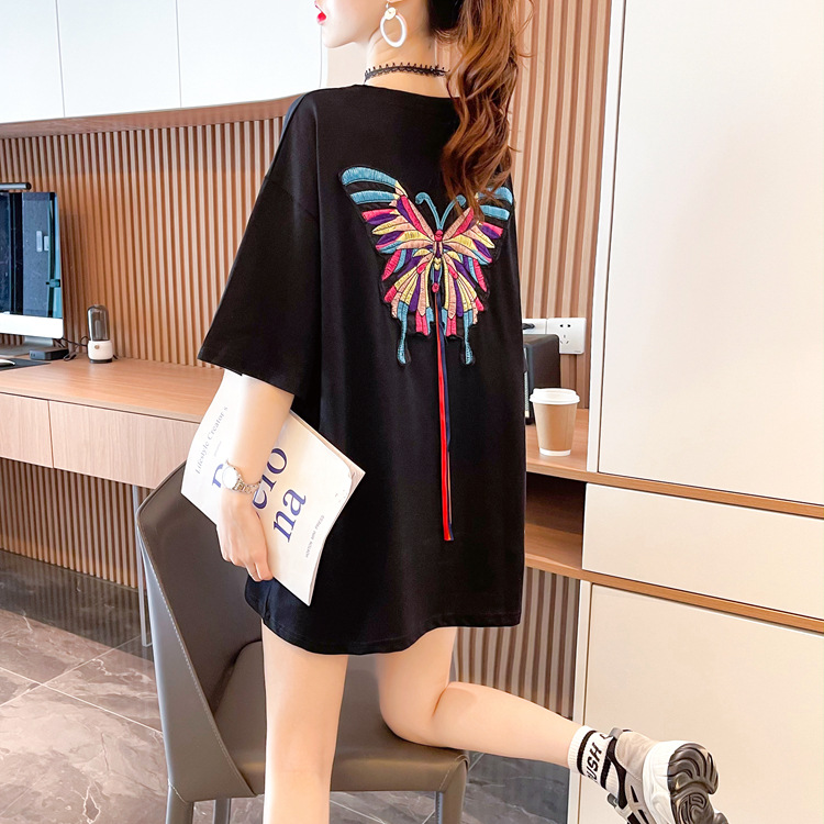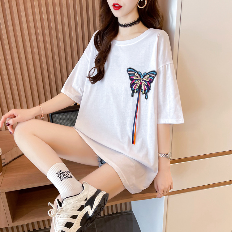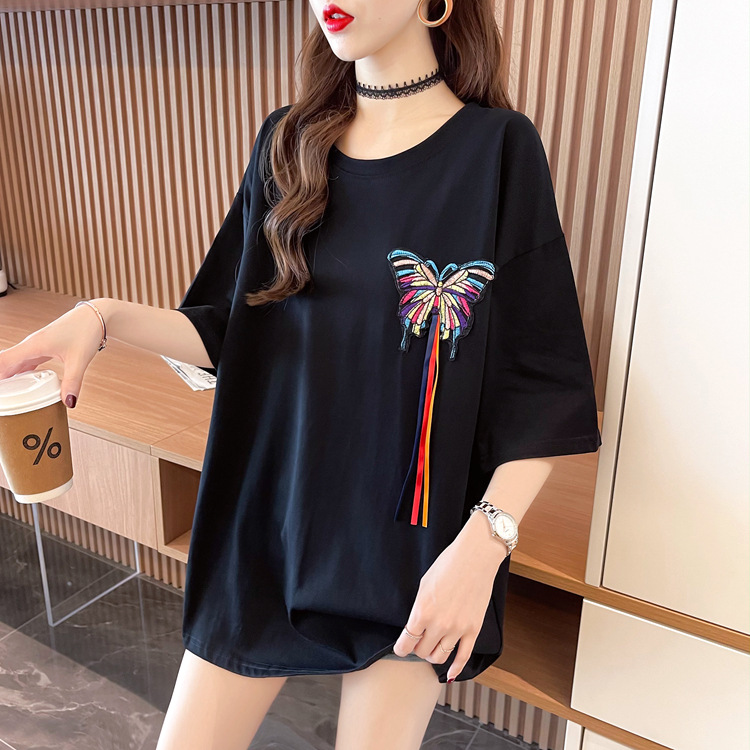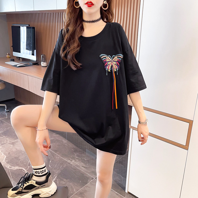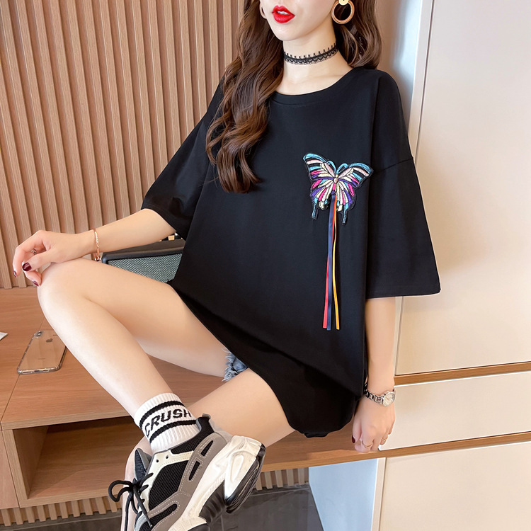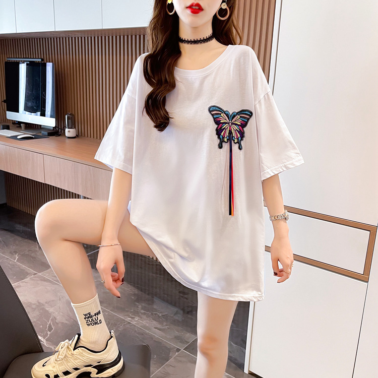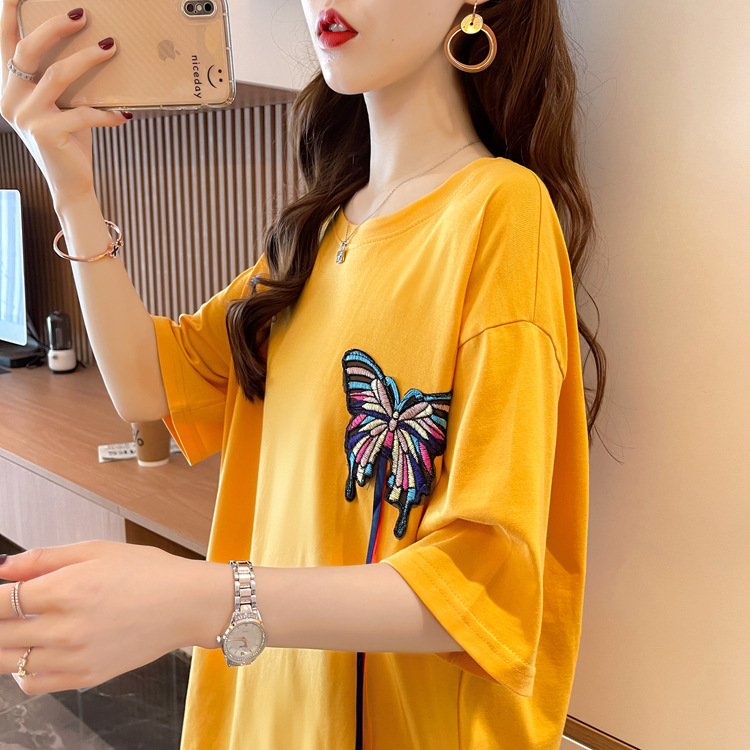 새로운 국경 2025 여름 디자인 인터넷 연예인 자수 반팔 티셔츠 여성 한국 스타일 패션 중간 길이 여성 의류 트렌드