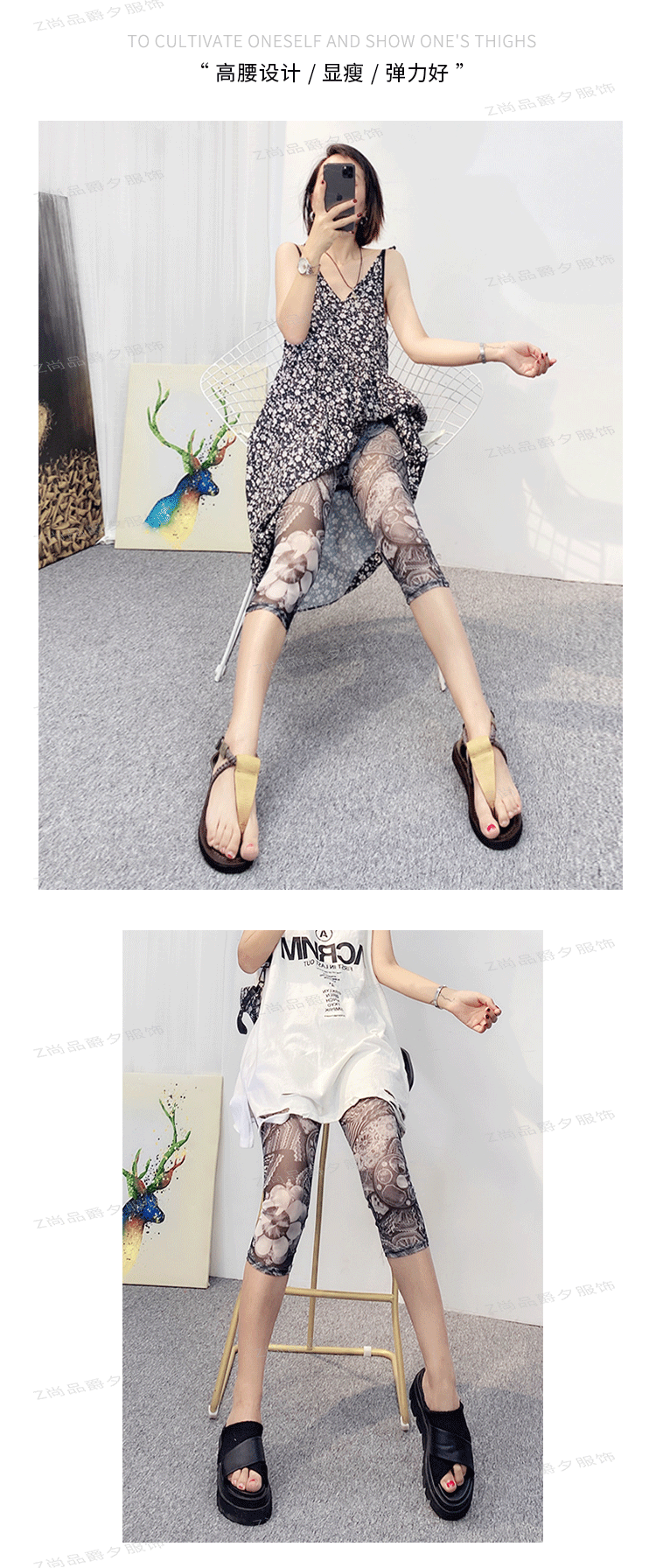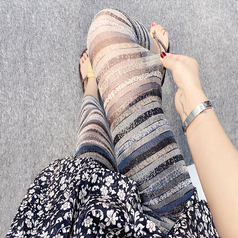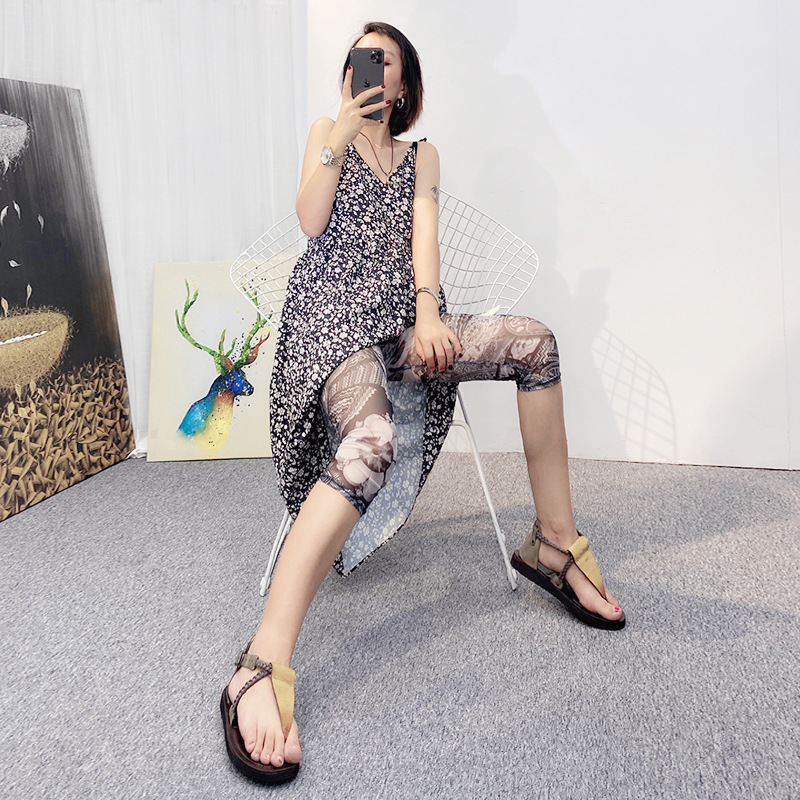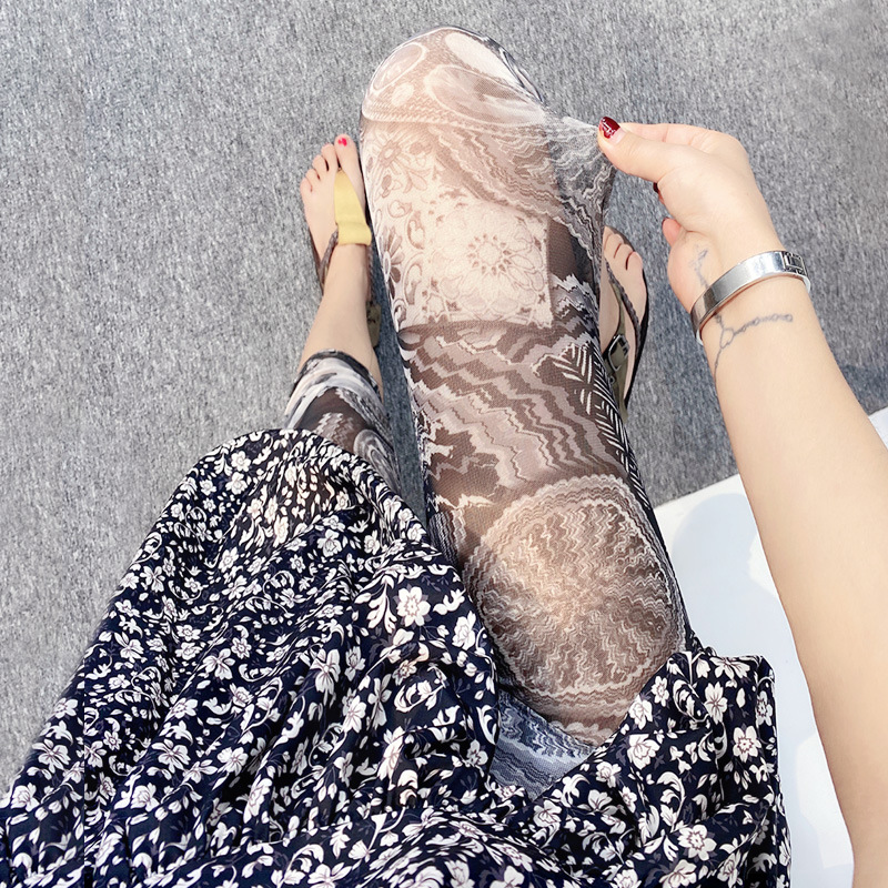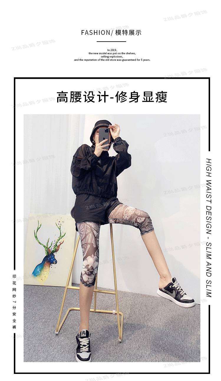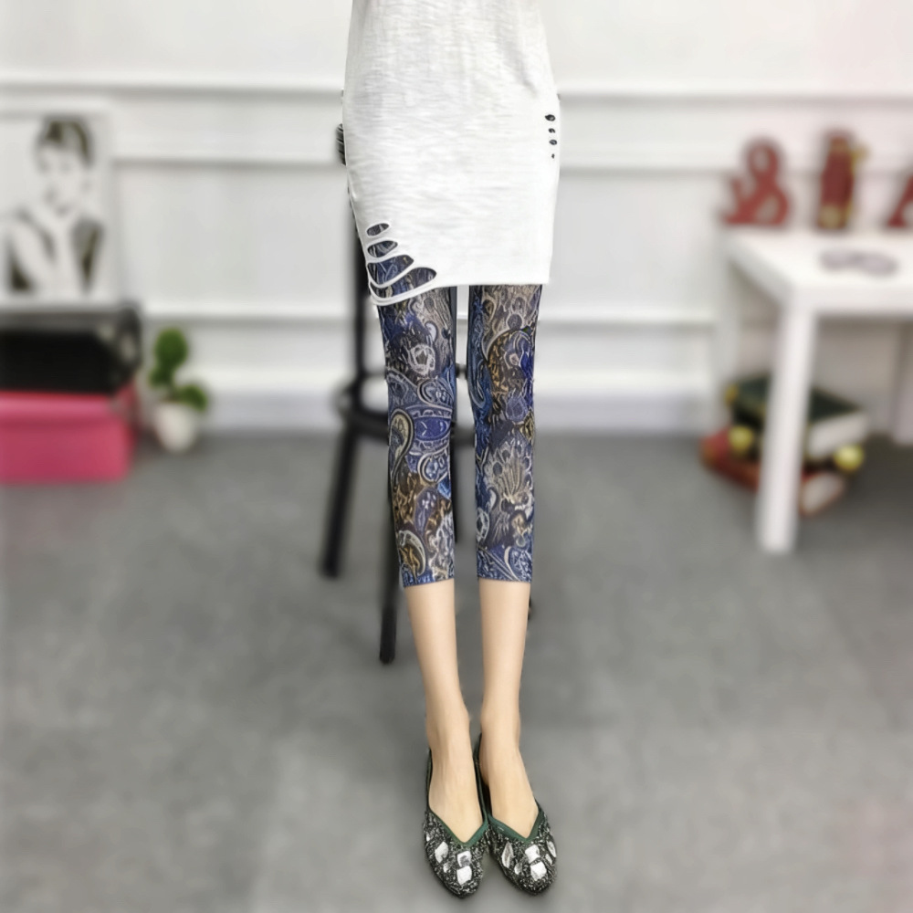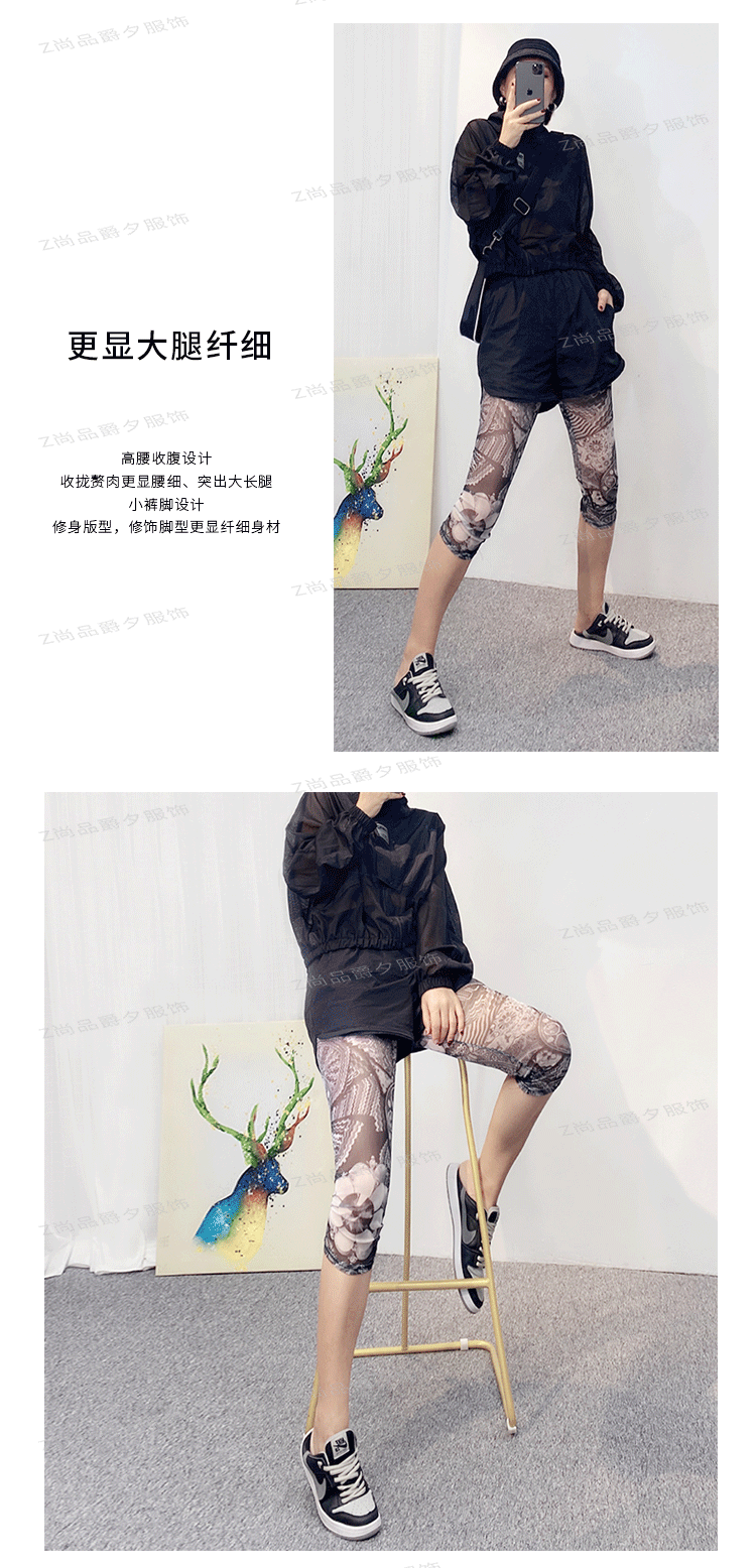 메쉬 레깅스 여성용 여름 얇은 프린트 하이웨이스트 신축성 있는 꽃무늬 팬츠 타이트 팬츠 8부/9부 바지스토어 가기