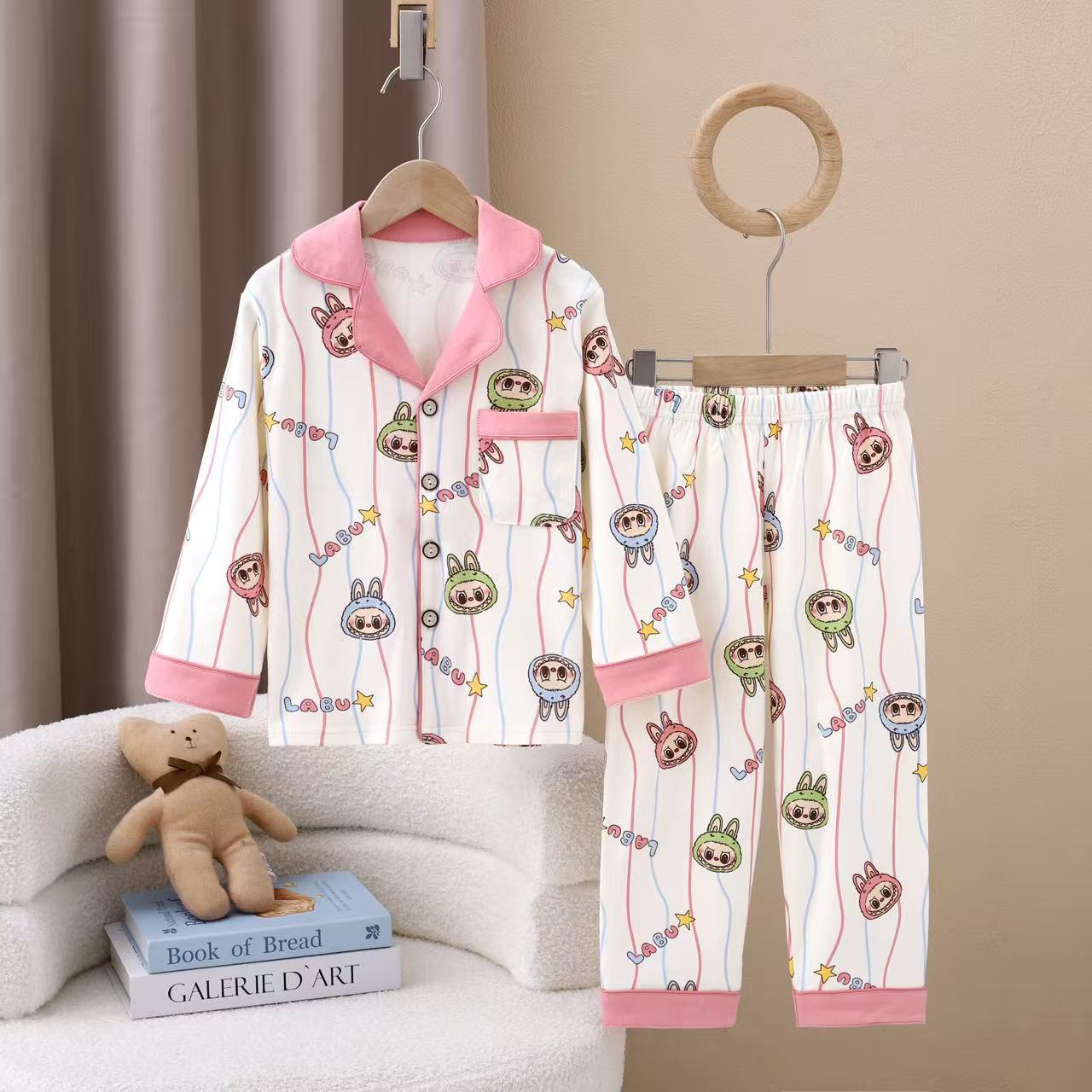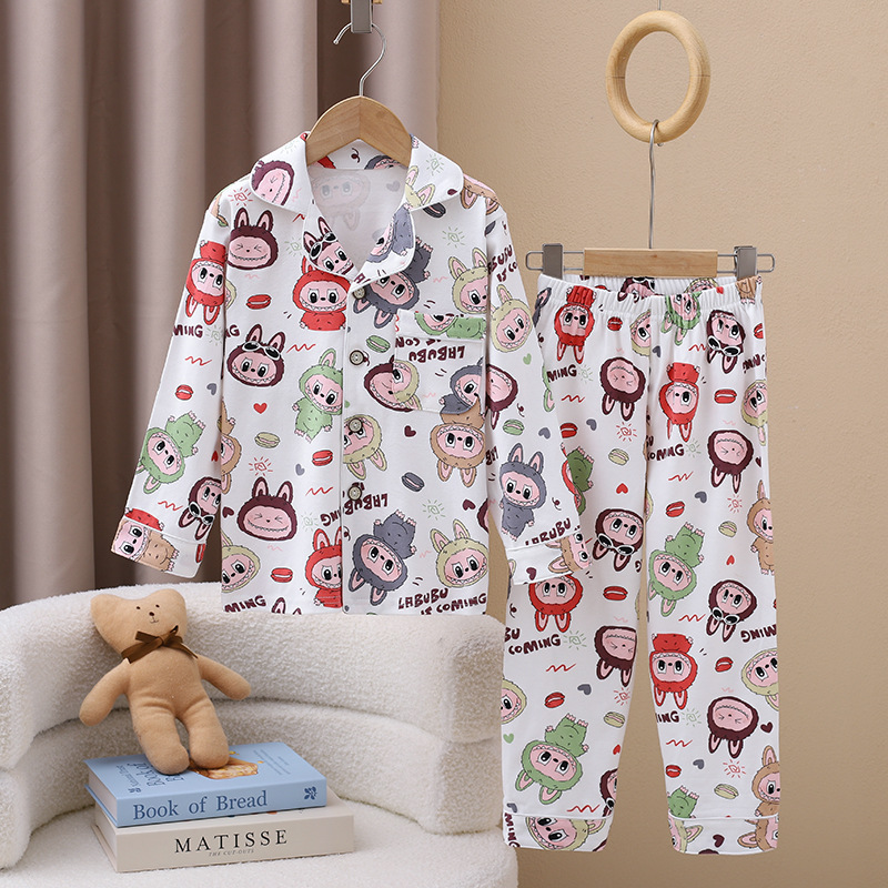 어린이 잠옷 봄과 가을 면 가정 옷 세트 어린이 옷깃 가디건 긴 소매 만화 인쇄스토어 가기