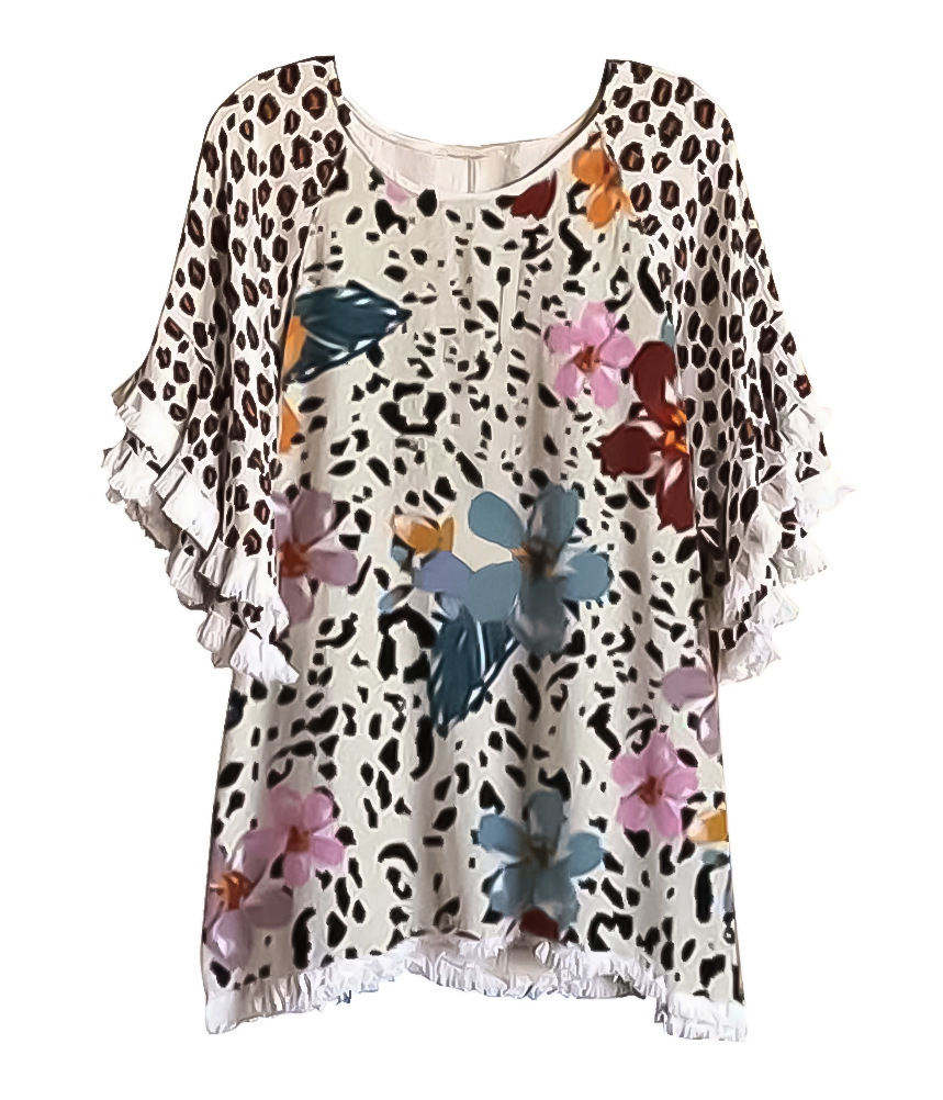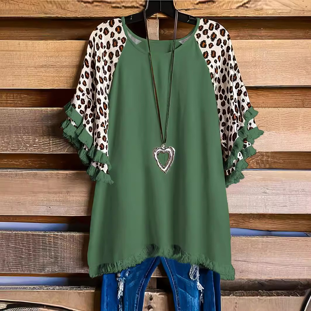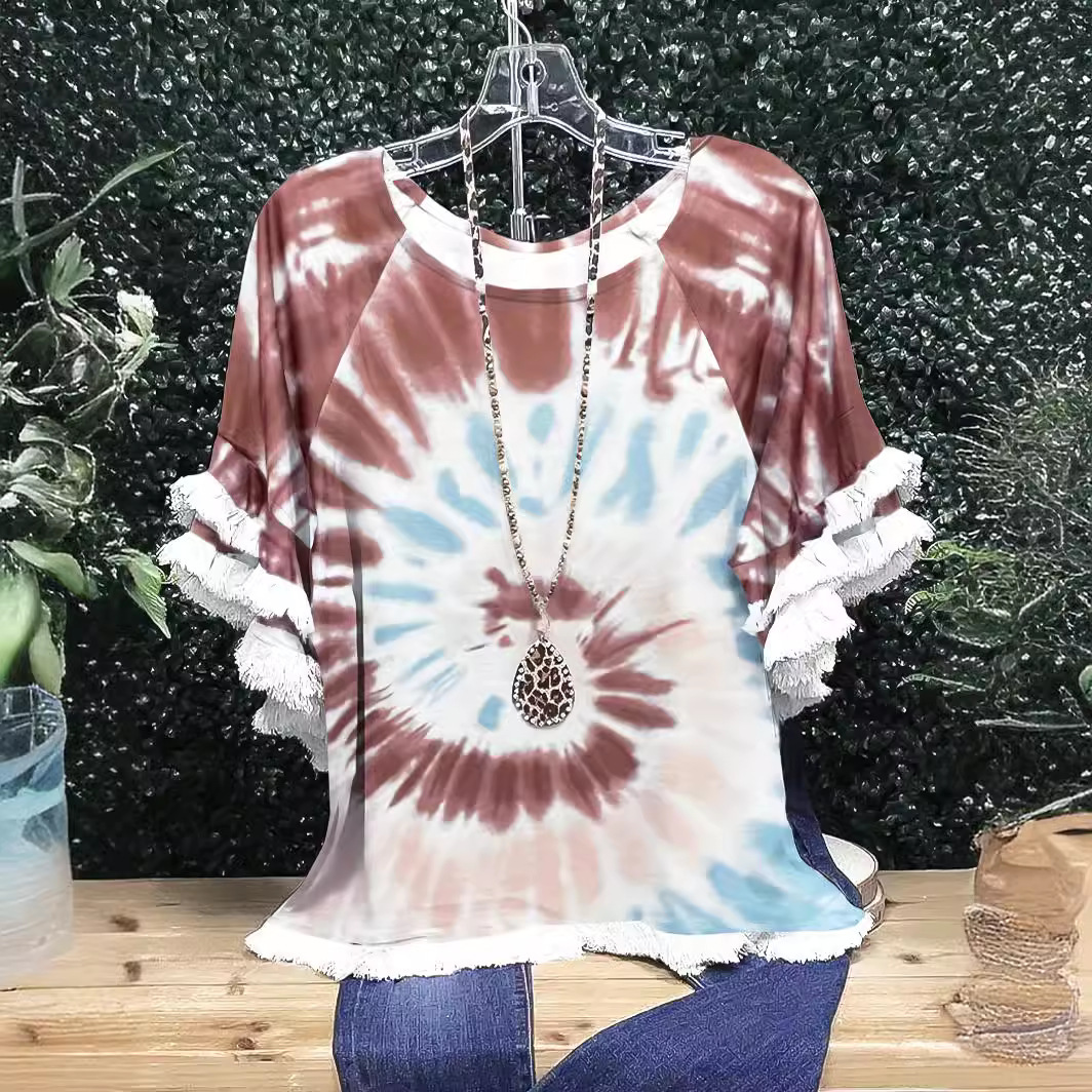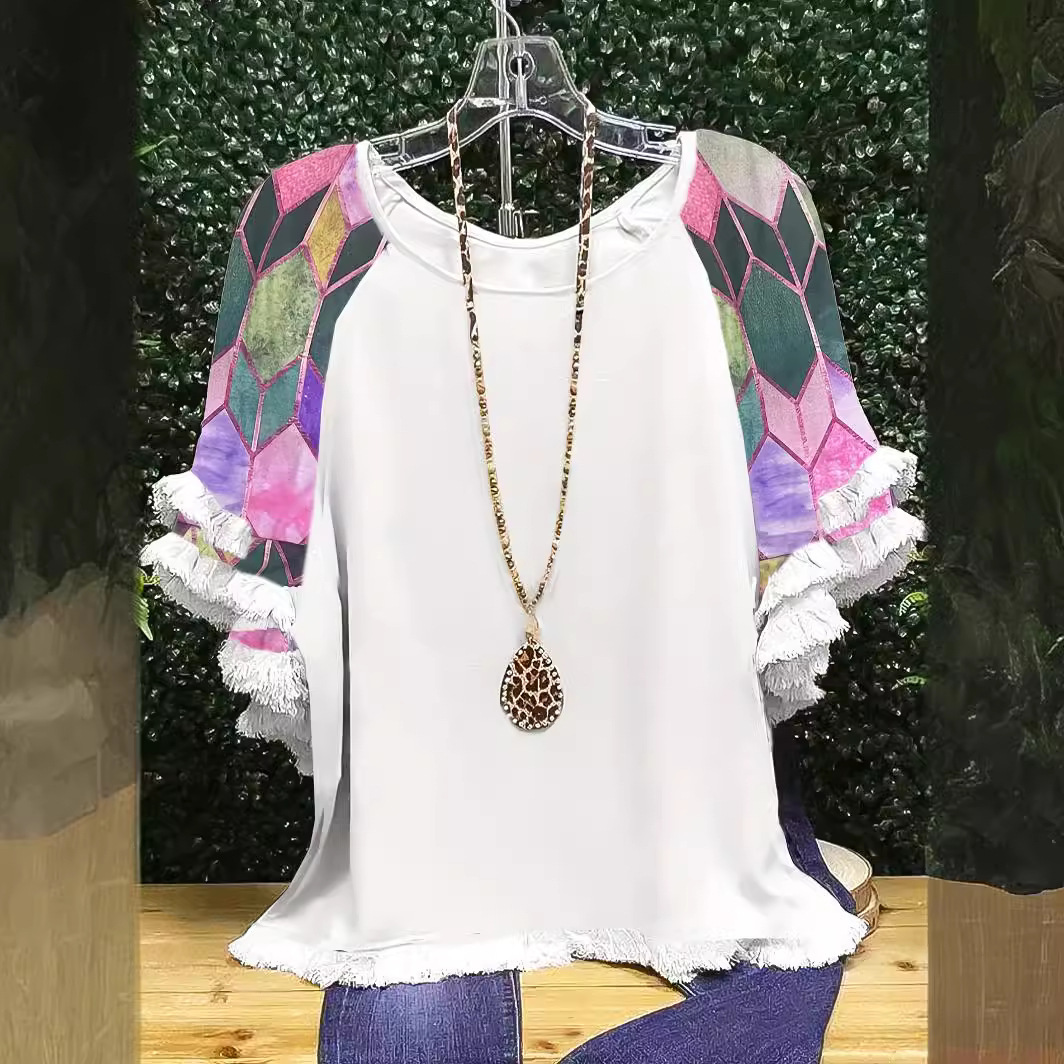 유럽과 미국의 국경 2025 아마존 여름 새 스타일 레이스 연꽃 잎 소매 라운드 넥 인쇄 컬러 매칭 여성 루즈 티셔츠