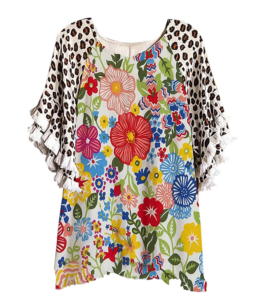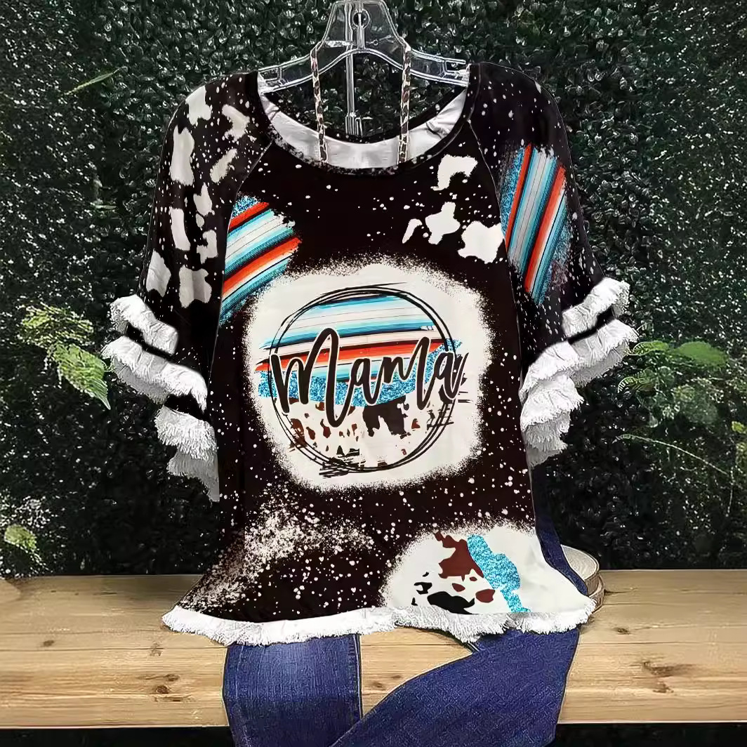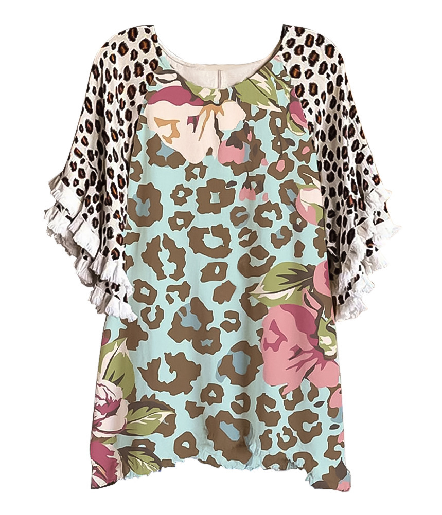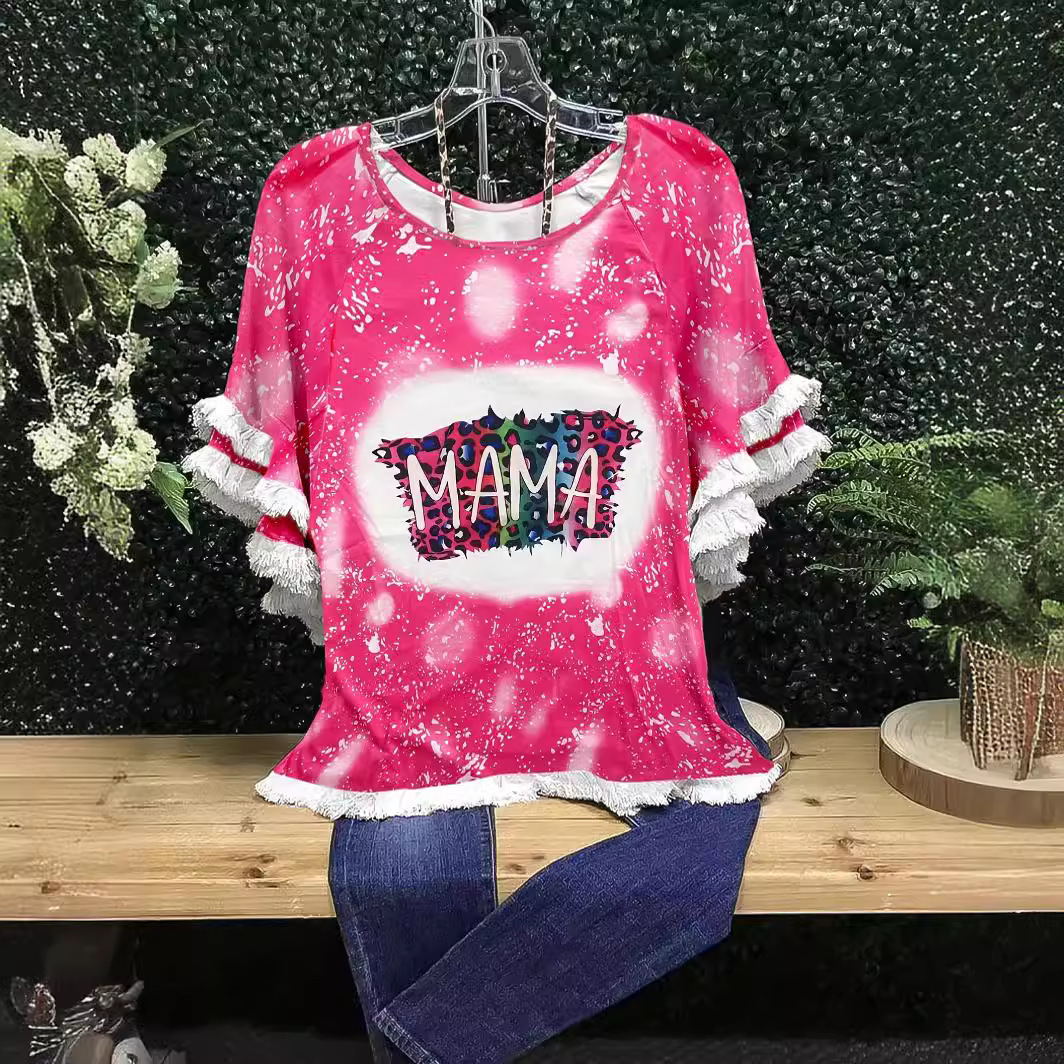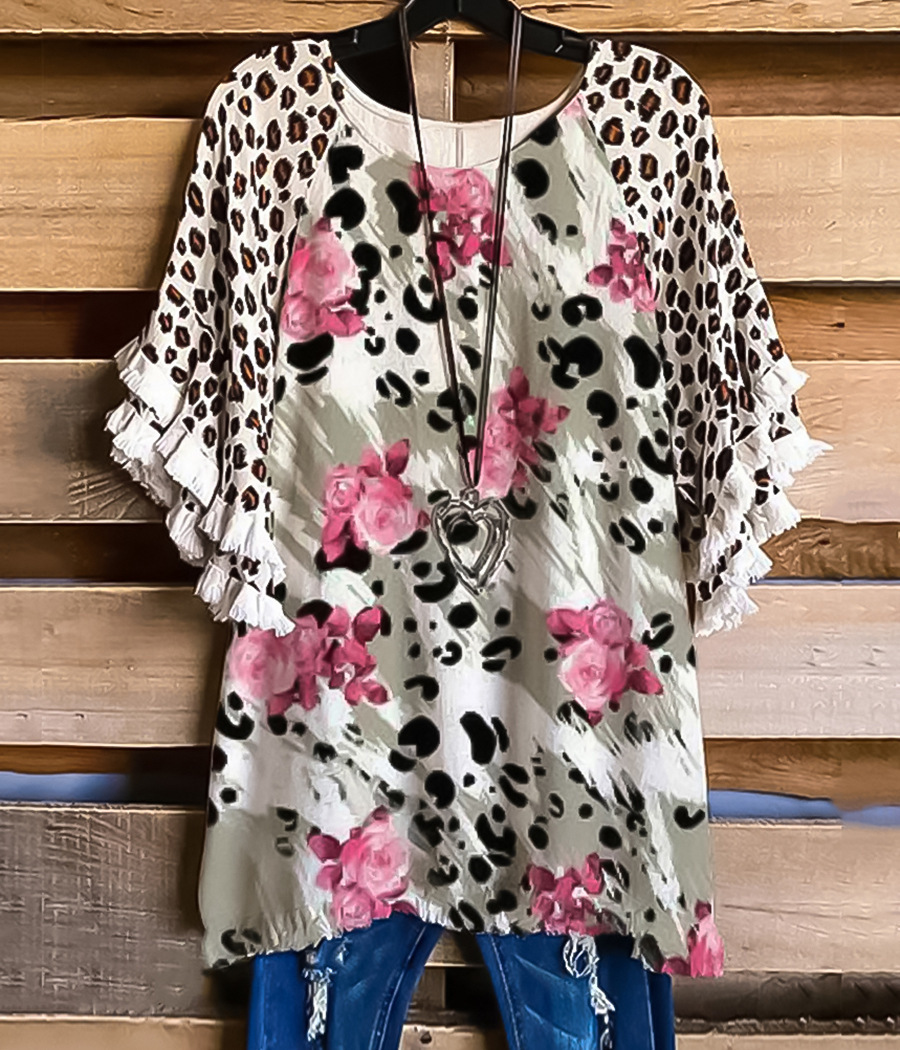 유럽과 미국의 국경 2025 아마존 여름 새 스타일 레이스 연꽃 잎 소매 라운드 넥 인쇄 컬러 매칭 여성 루즈 티셔츠