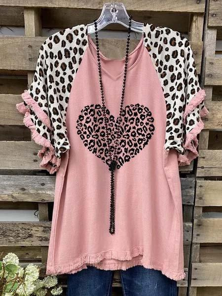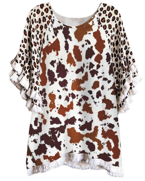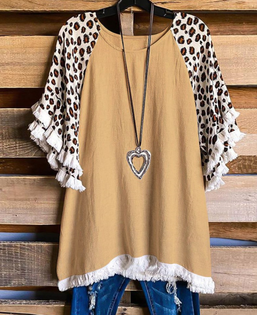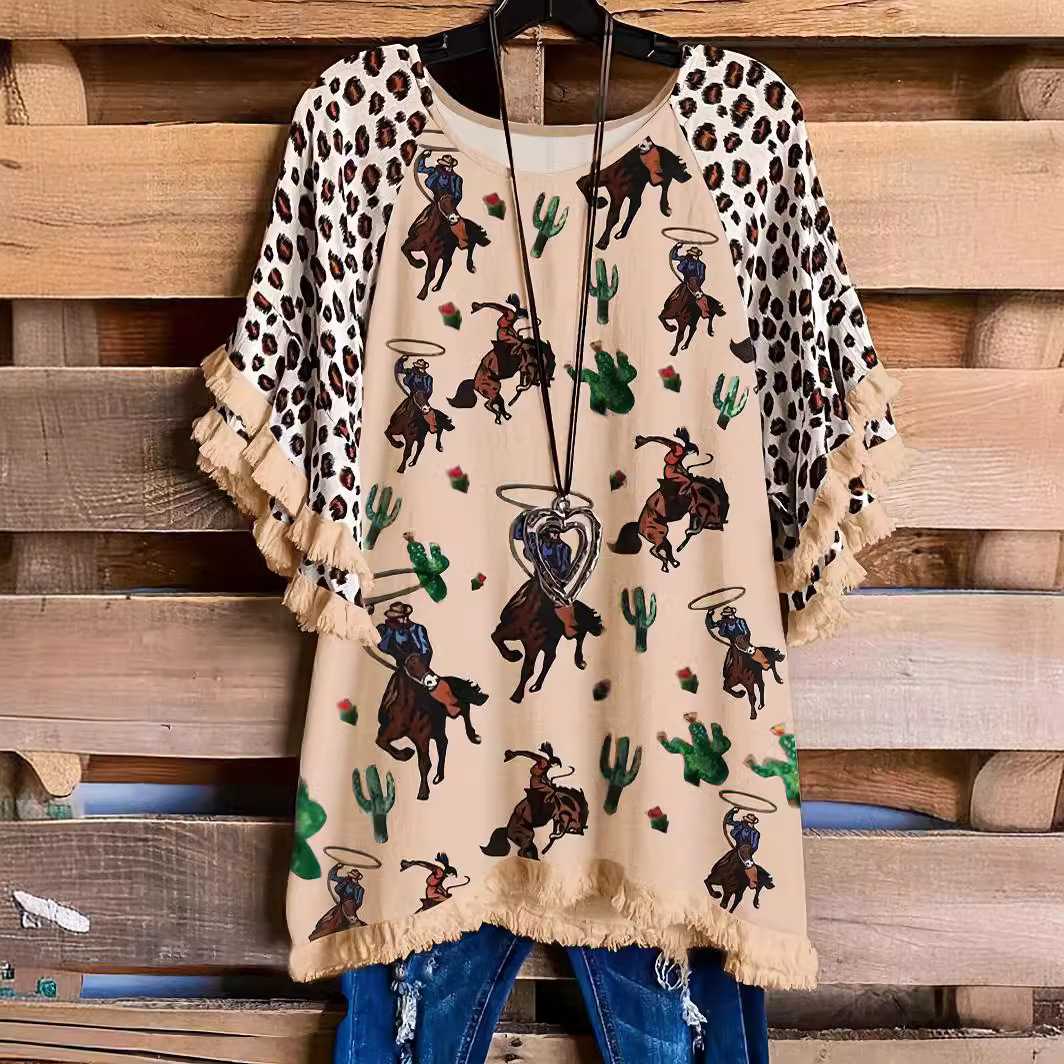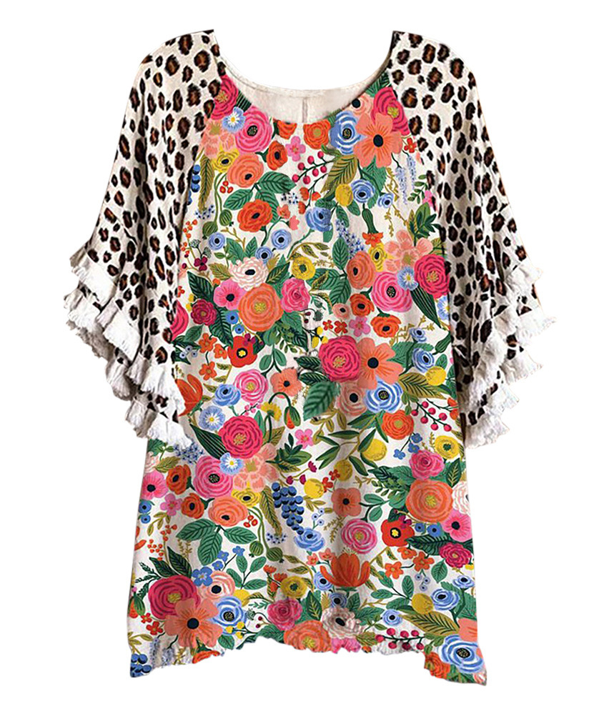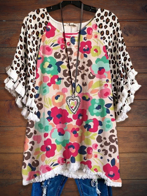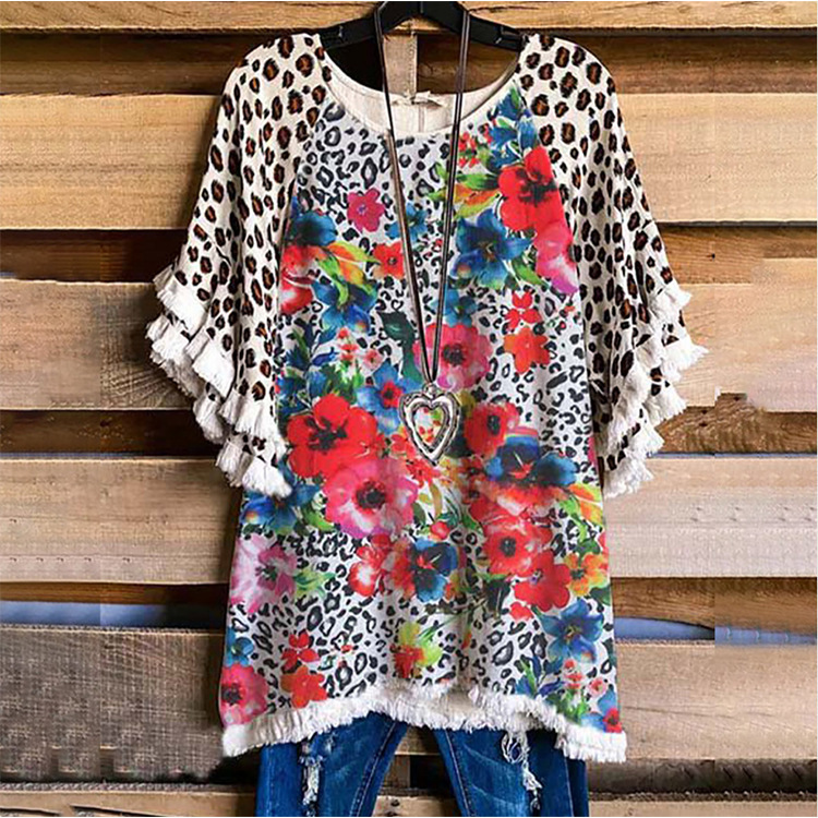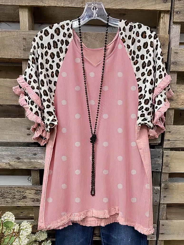 유럽과 미국의 국경 2025 아마존 여름 새 스타일 레이스 연꽃 잎 소매 라운드 넥 인쇄 컬러 매칭 여성 루즈 티셔츠