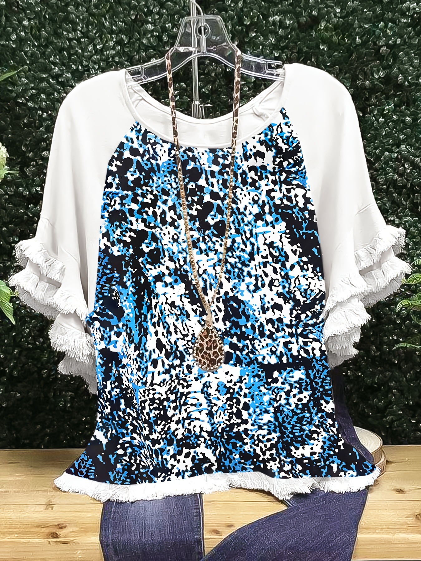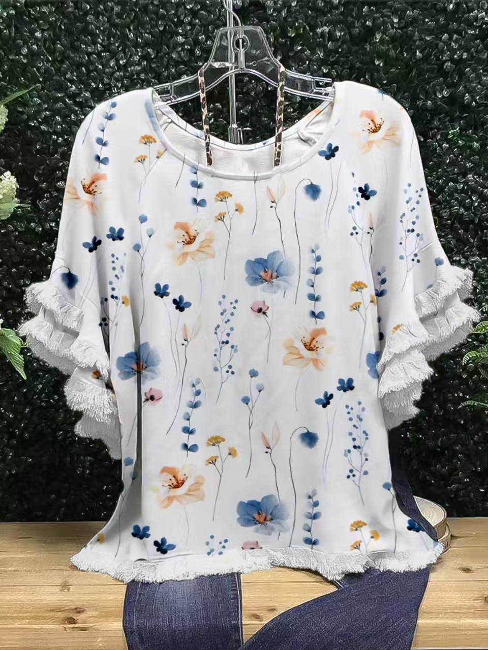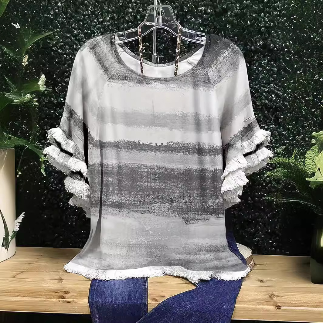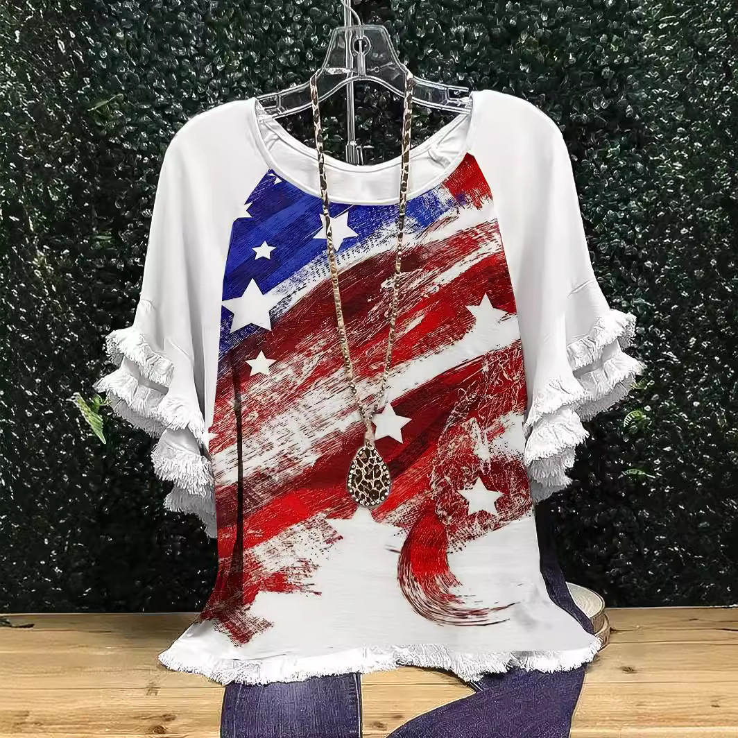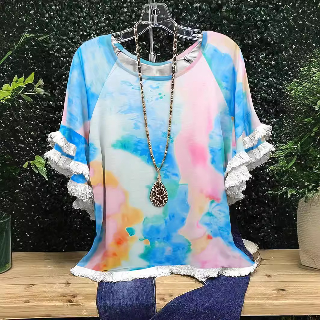 유럽과 미국의 국경 2025 아마존 여름 새 스타일 레이스 연꽃 잎 소매 라운드 넥 인쇄 컬러 매칭 여성 루즈 티셔츠스토어 가기