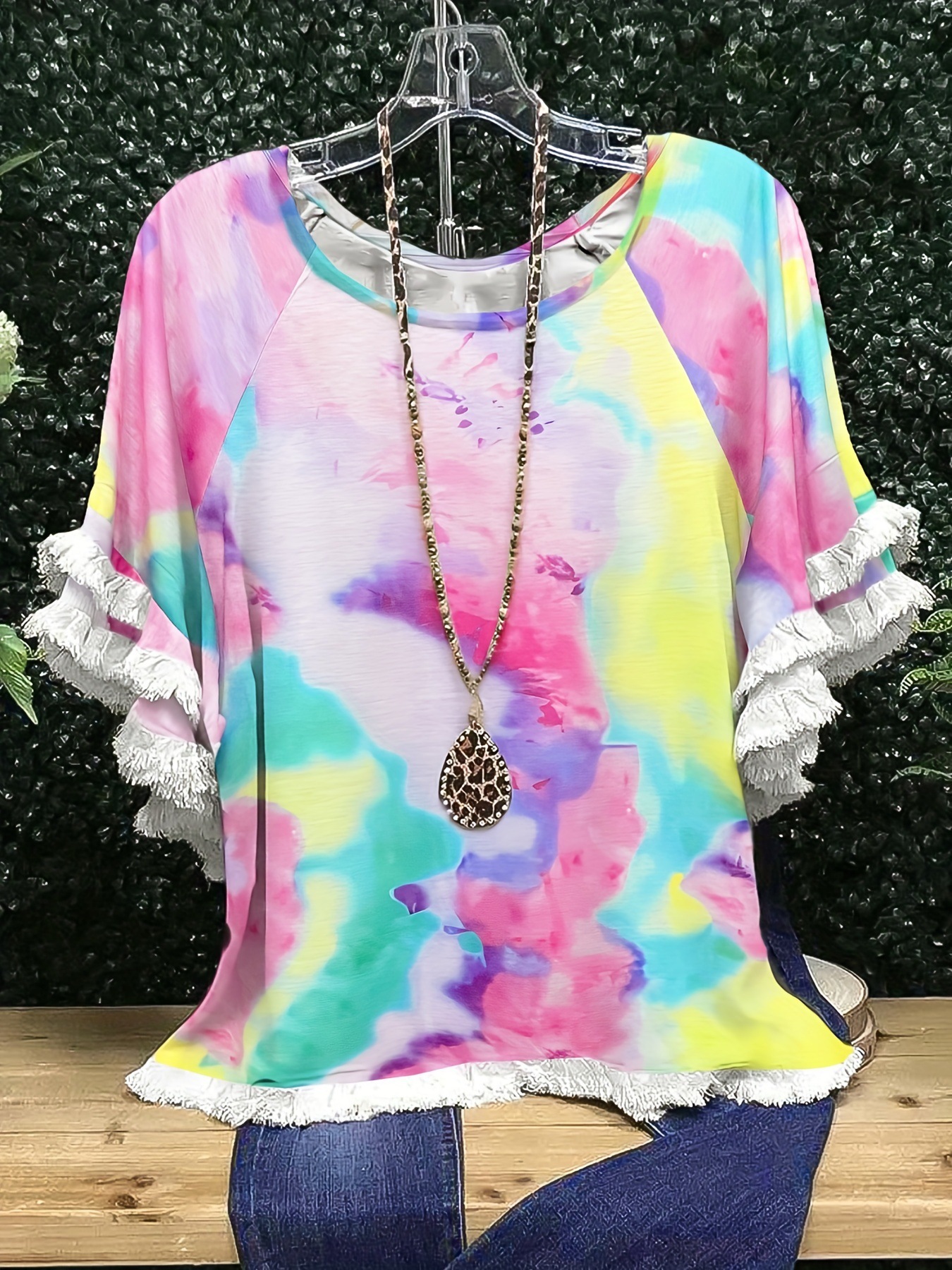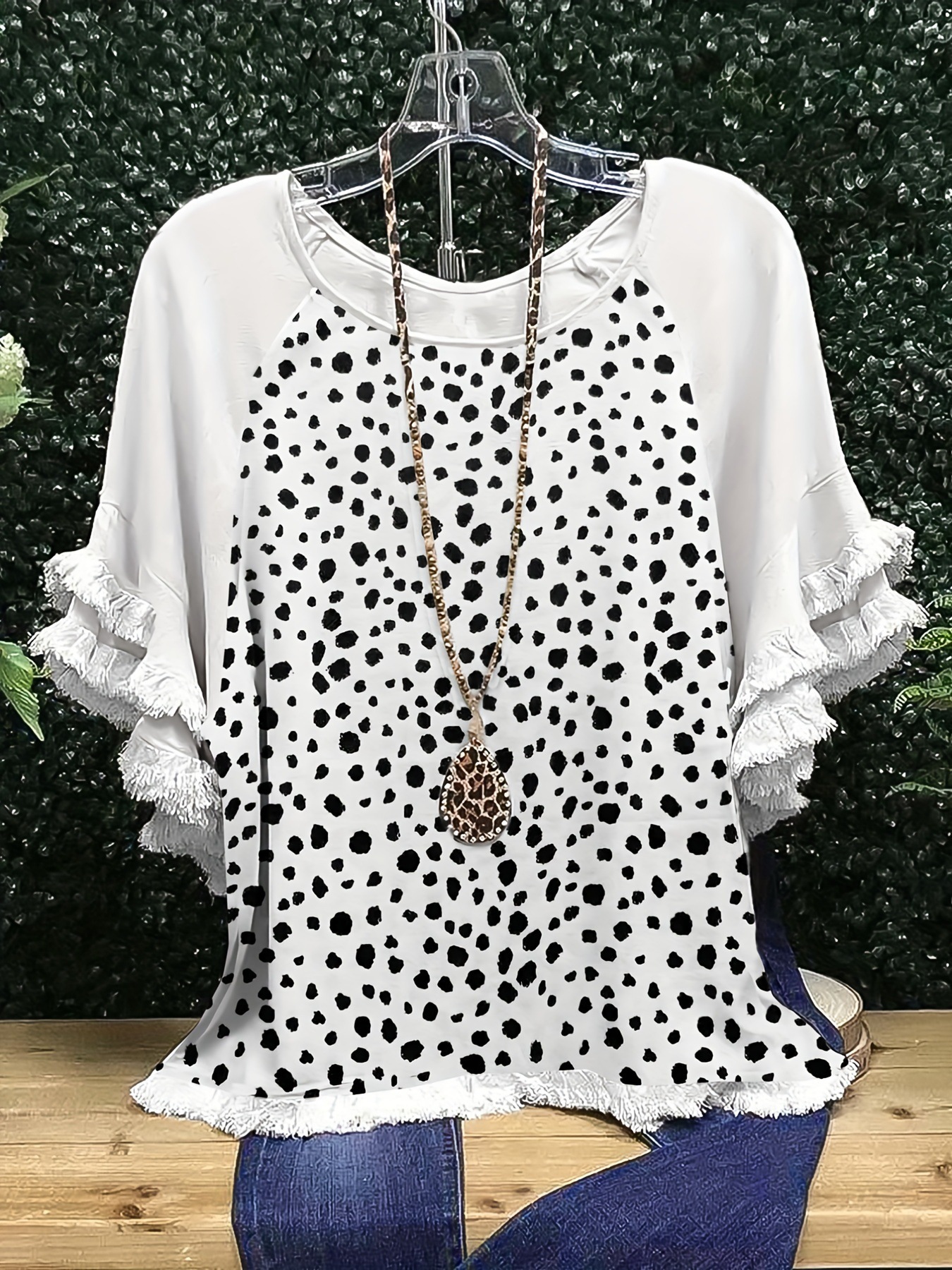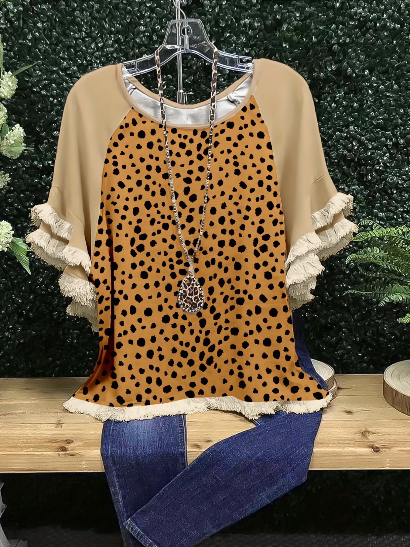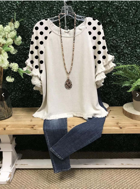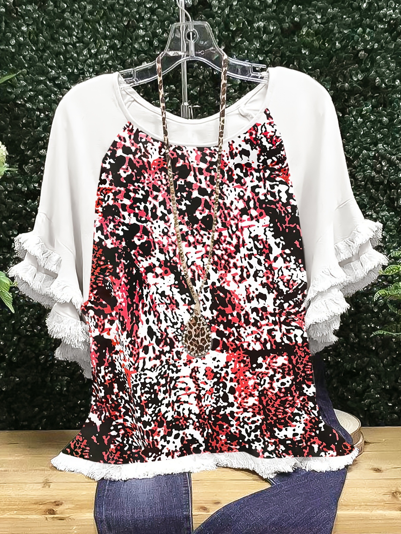 유럽과 미국의 국경 2025 아마존 여름 새 스타일 레이스 연꽃 잎 소매 라운드 넥 인쇄 컬러 매칭 여성 루즈 티셔츠스토어 가기
