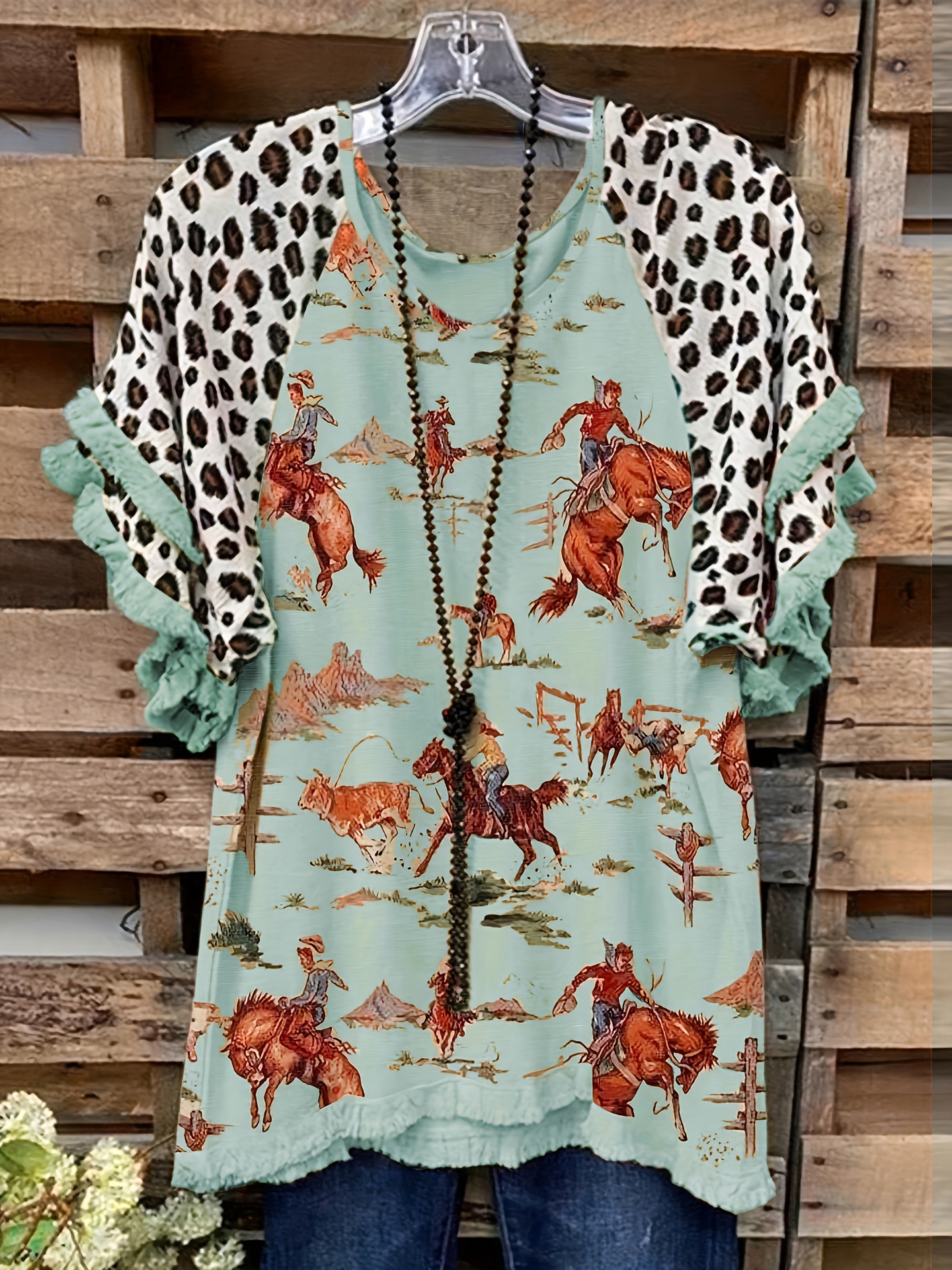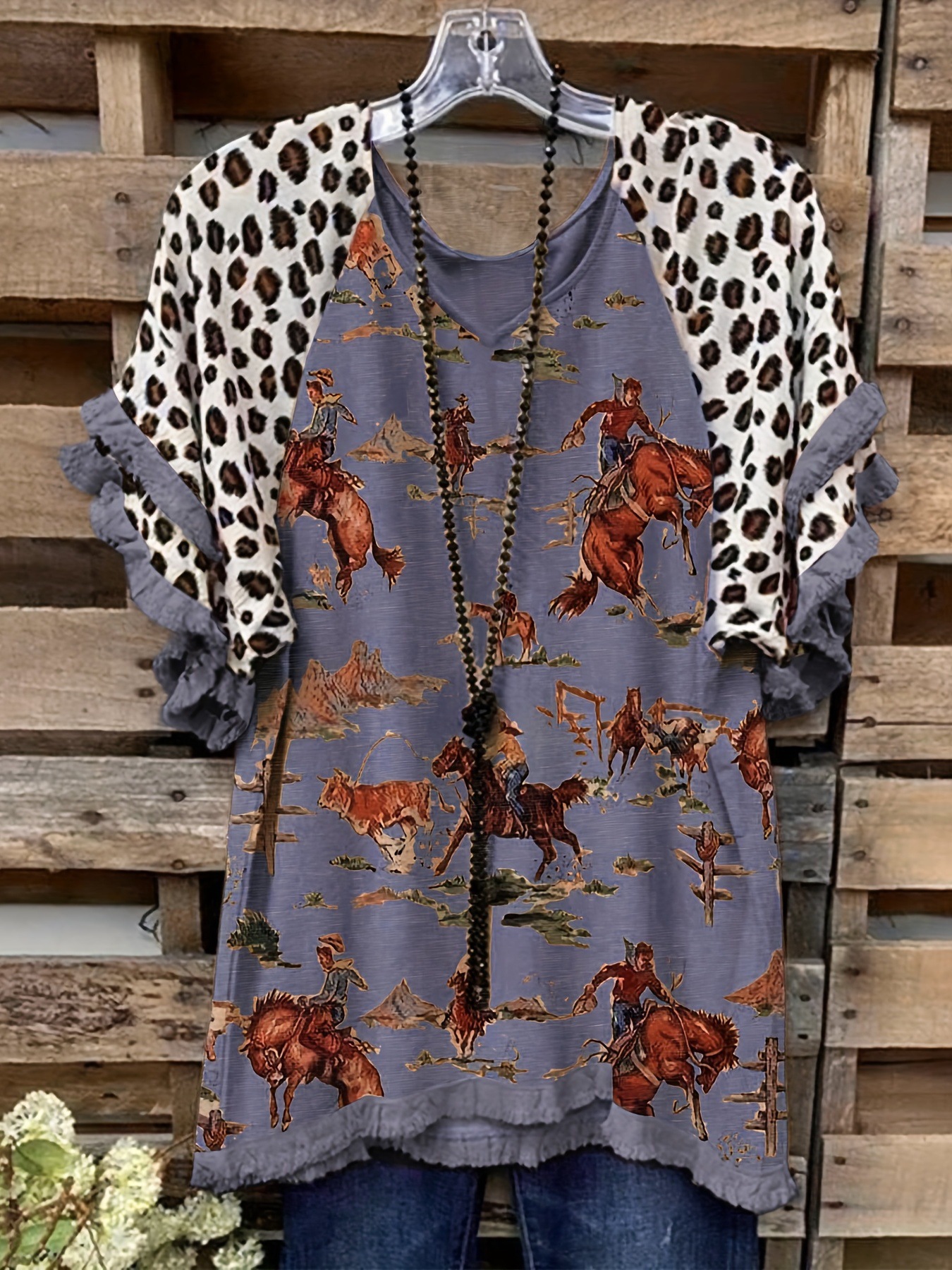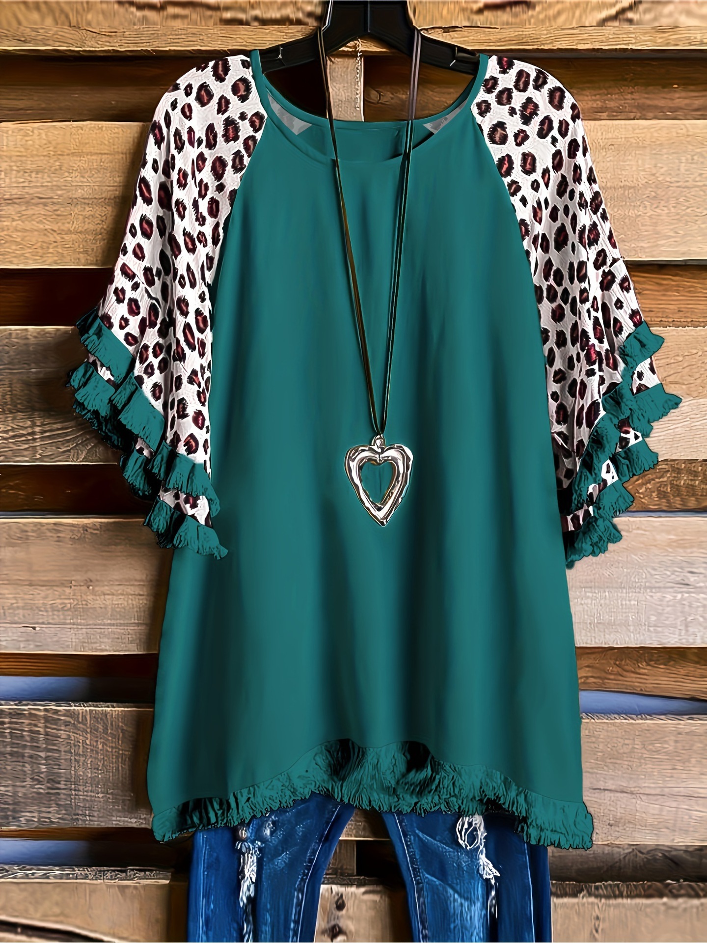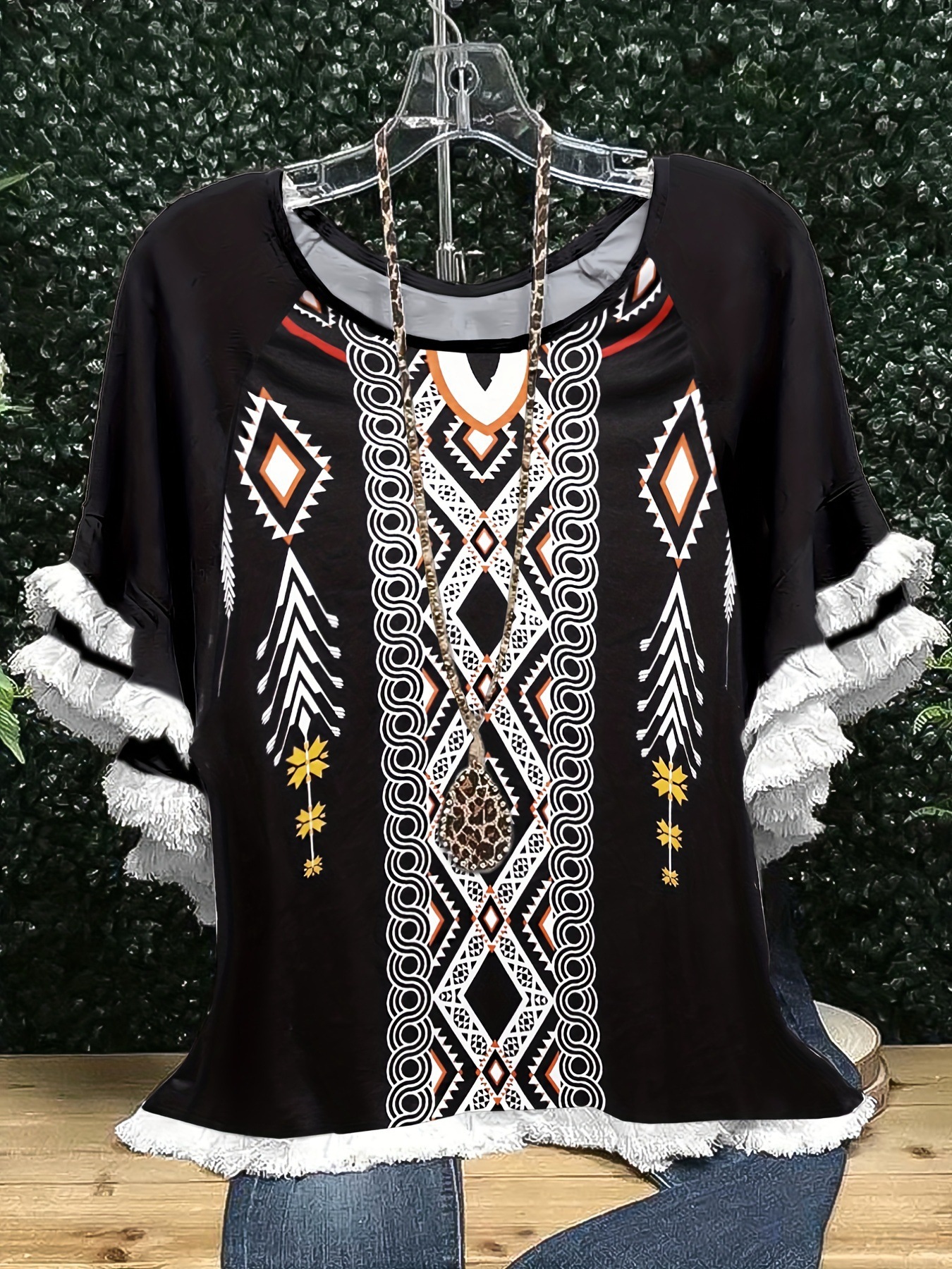유럽과 미국의 국경 2025 아마존 여름 새 스타일 레이스 연꽃 잎 소매 라운드 넥 인쇄 컬러 매칭 여성 루즈 티셔츠스토어 가기