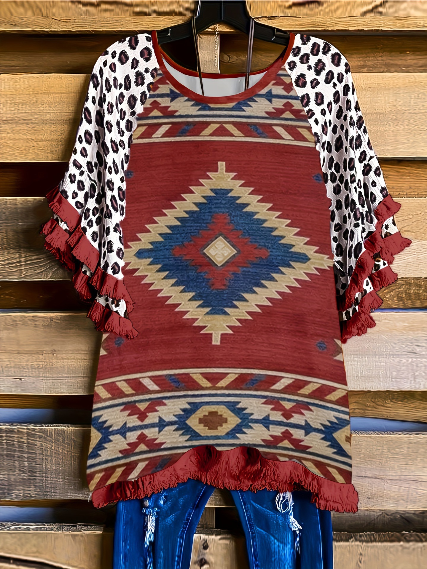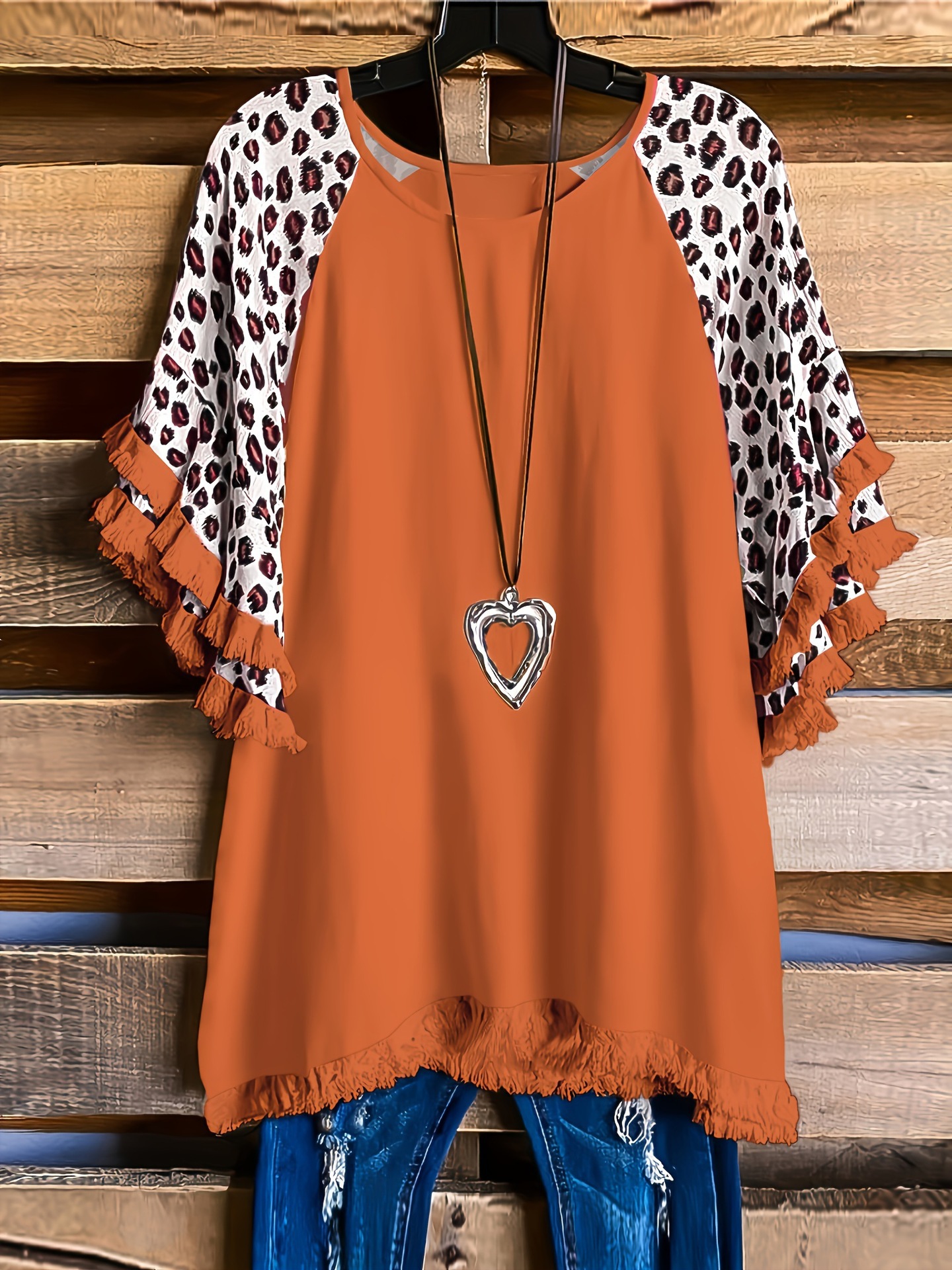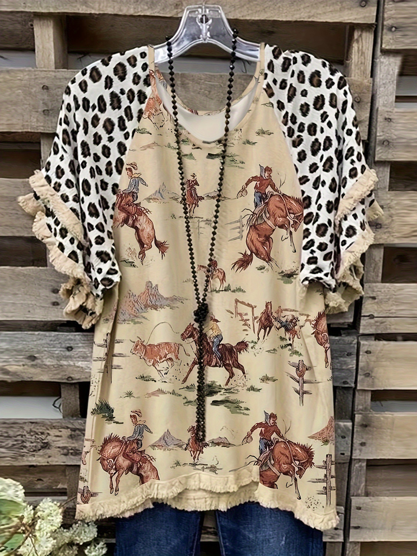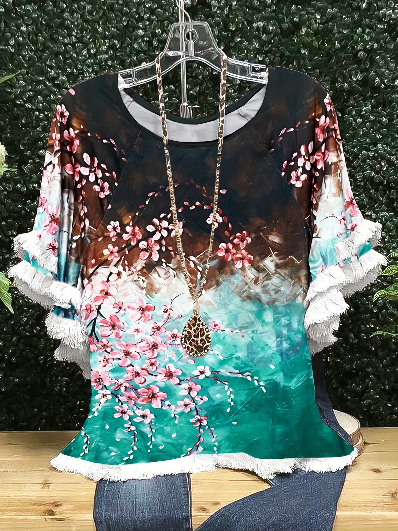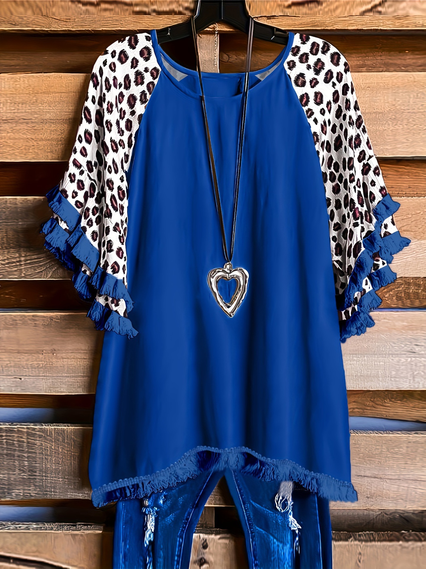 유럽과 미국의 국경 2025 아마존 여름 새 스타일 레이스 연꽃 잎 소매 라운드 넥 인쇄 컬러 매칭 여성 루즈 티셔츠스토어 가기