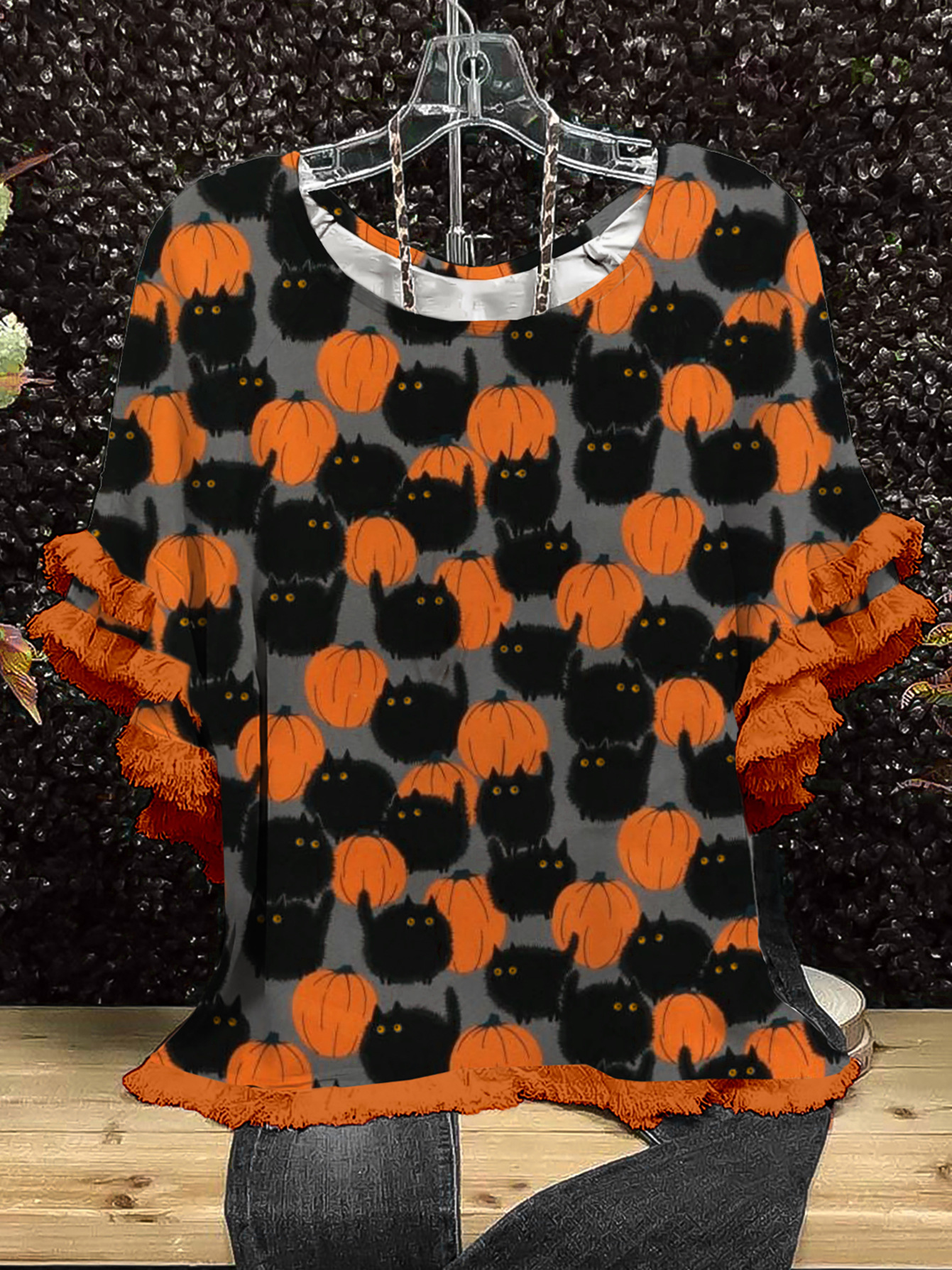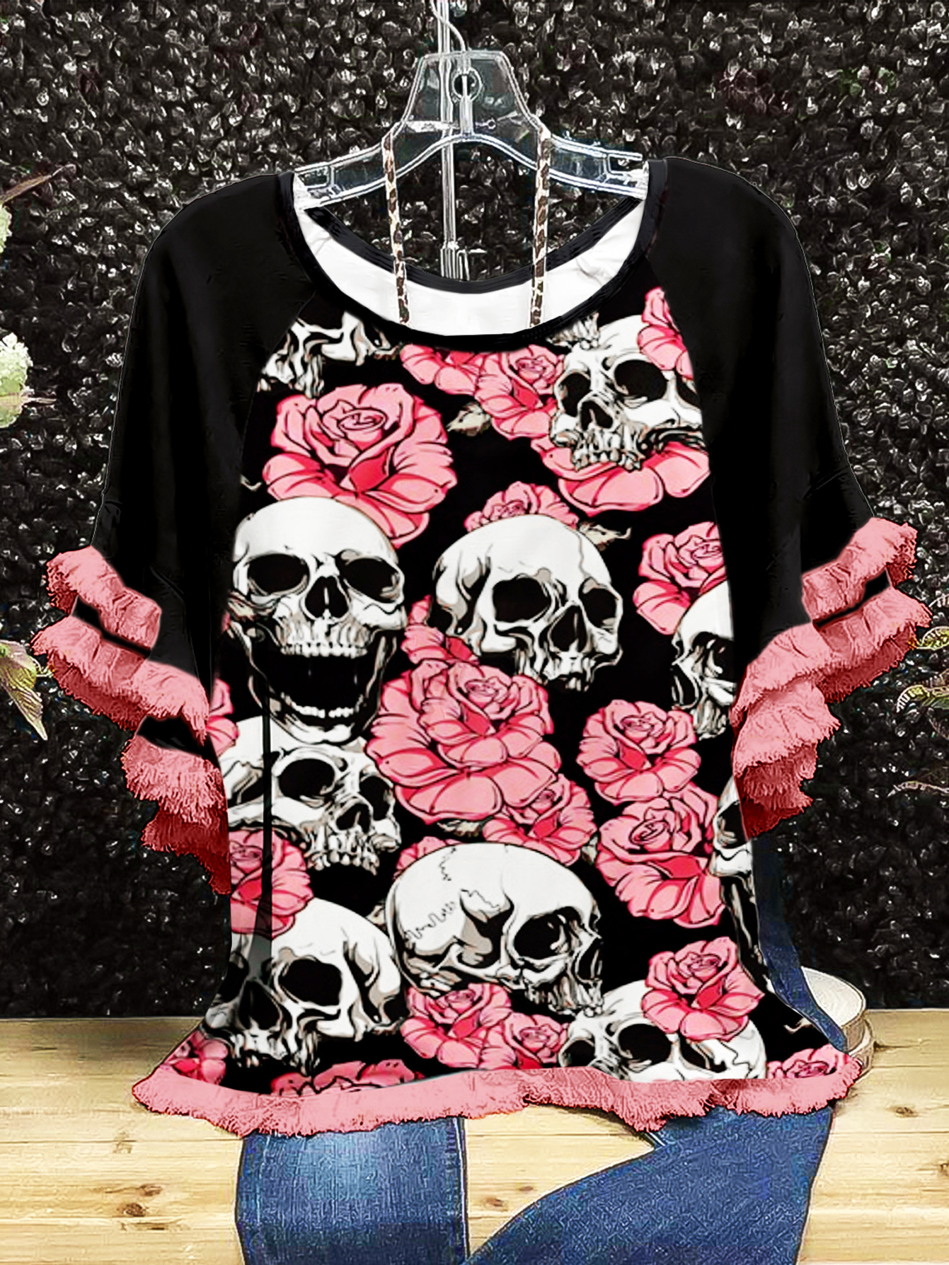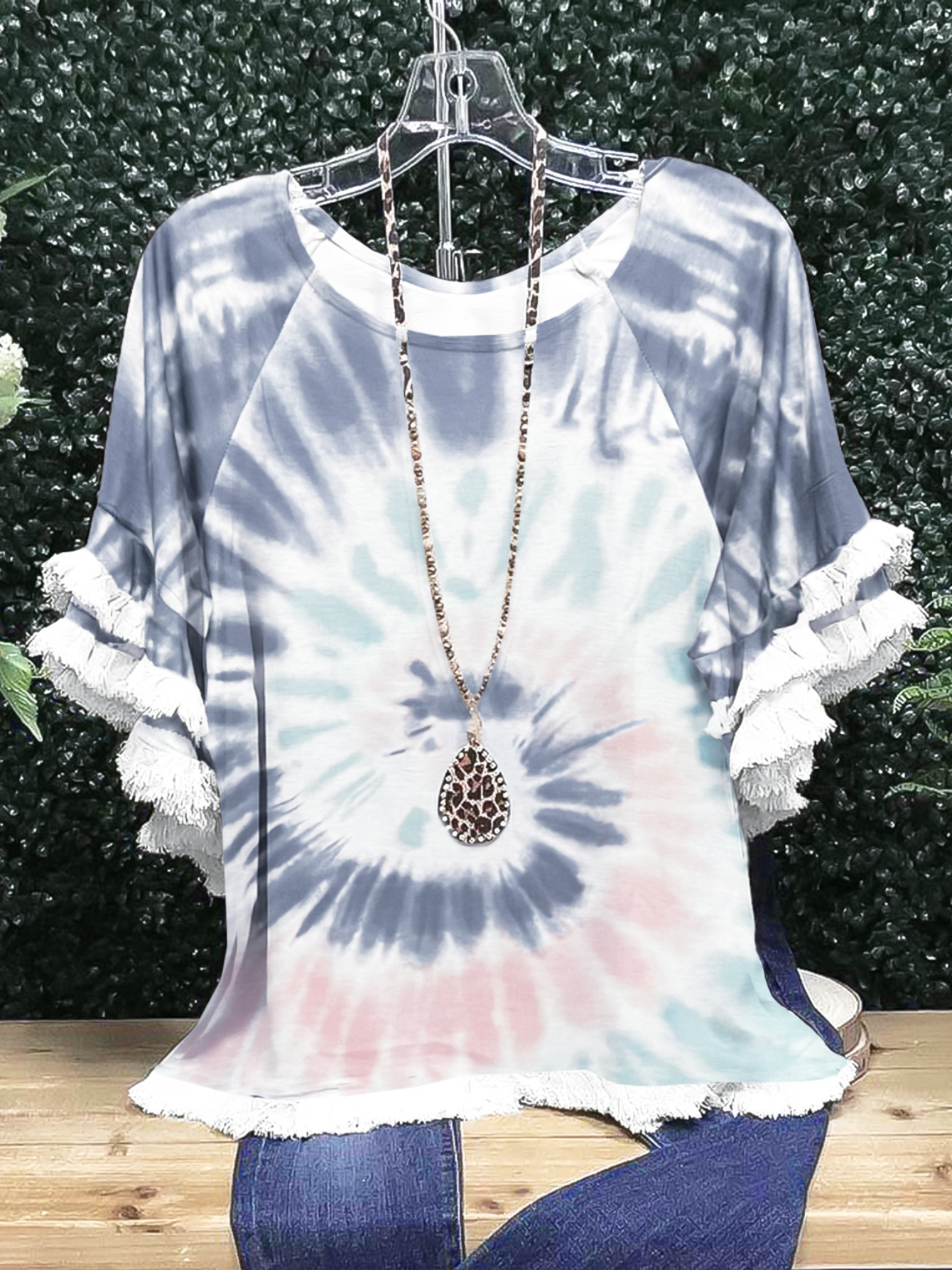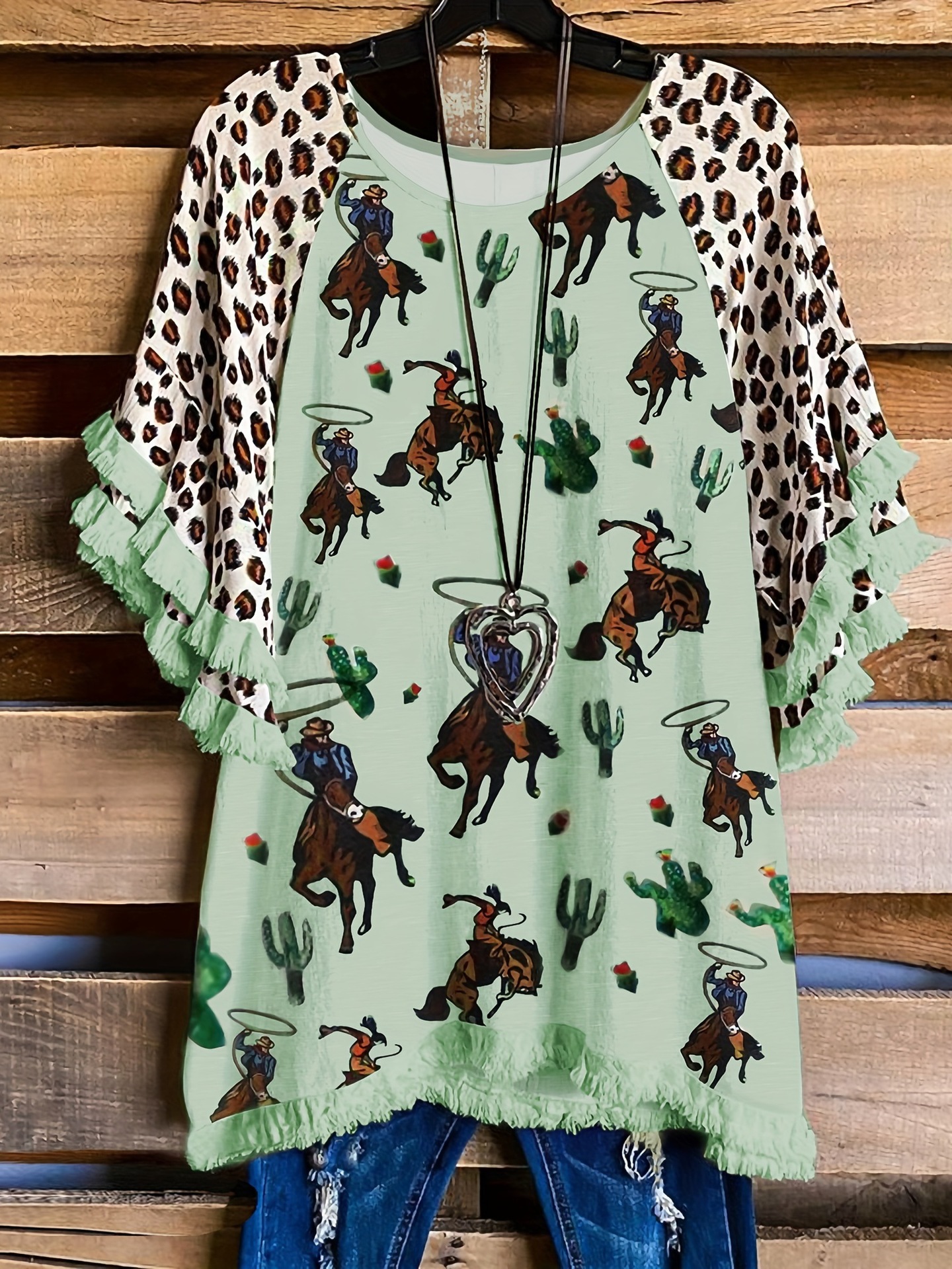 유럽과 미국의 국경 2025 아마존 여름 새 스타일 레이스 연꽃 잎 소매 라운드 넥 인쇄 컬러 매칭 여성 루즈 티셔츠스토어 가기