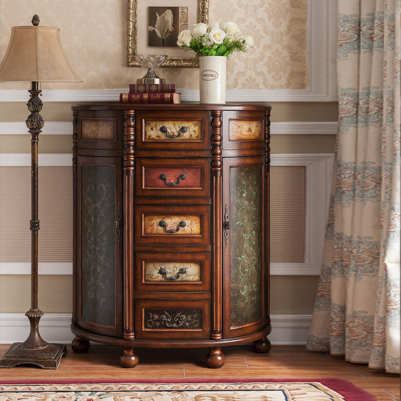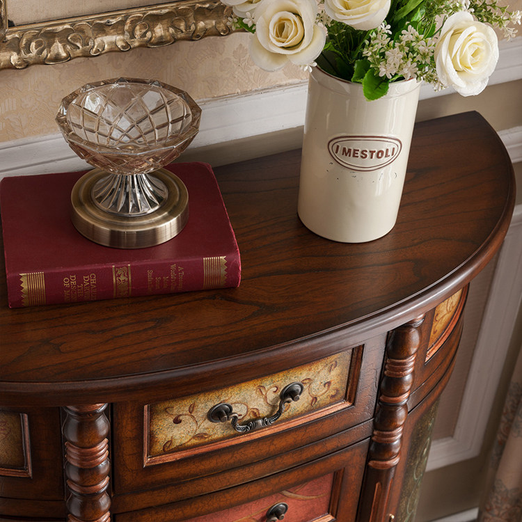 공장 도매 미국 세미 라운드 입구 캐비닛 단단한 나무 빈티지 페인트 입구 테이블 다기능 로커 빌라 버킷 캐비닛