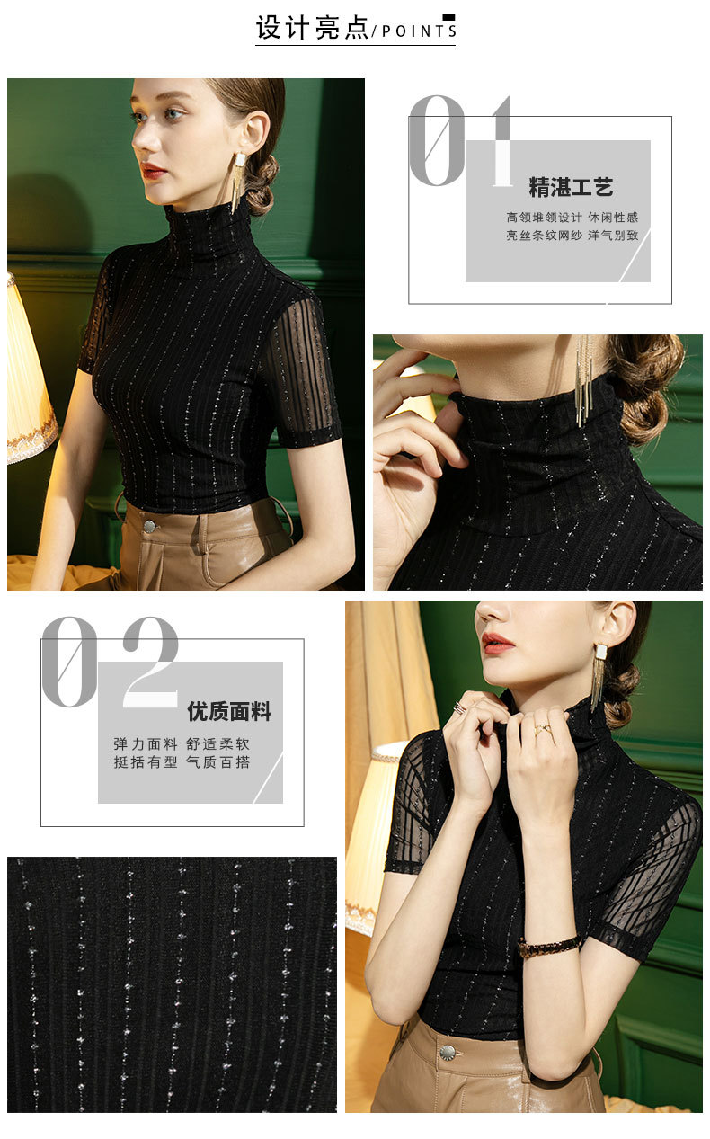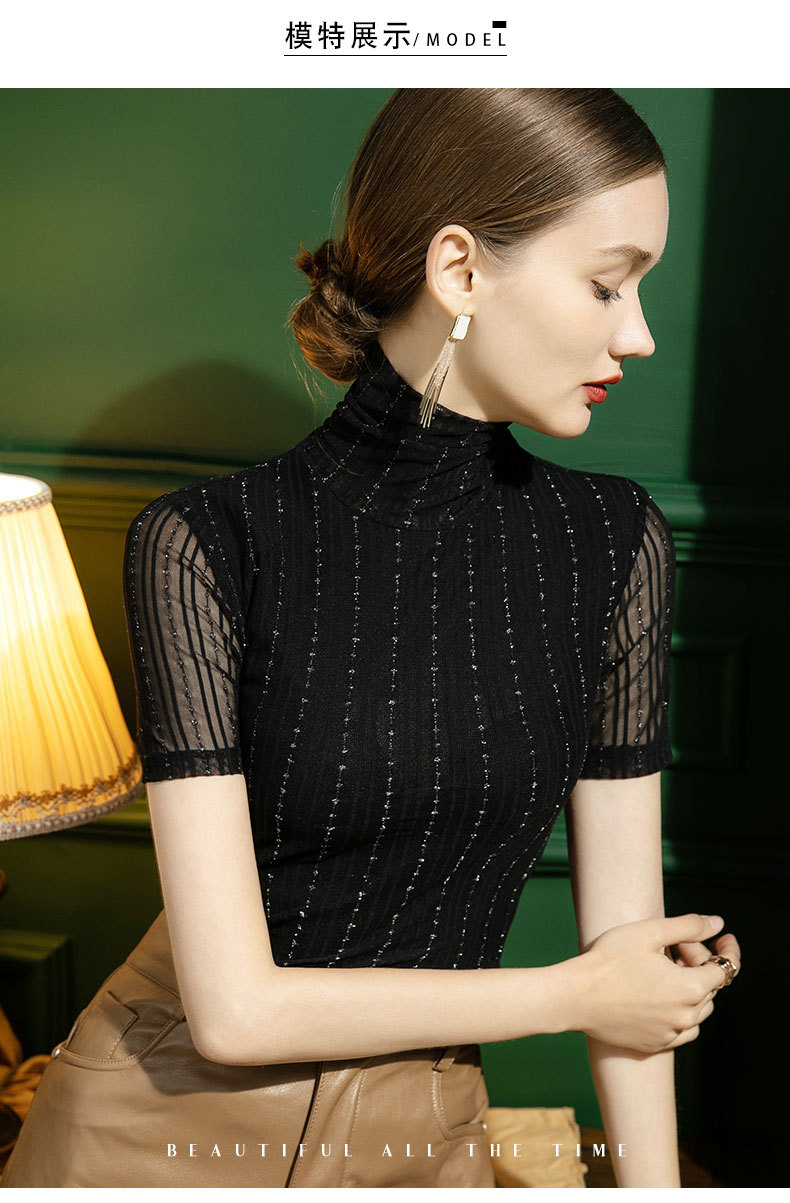 가을 새로운 하이 넥 메쉬 베이스 셔츠 여성용 슬림핏 내부 스트라이프 밝은 실크 반팔 섹시한 블랙 티셔츠스토어 가기