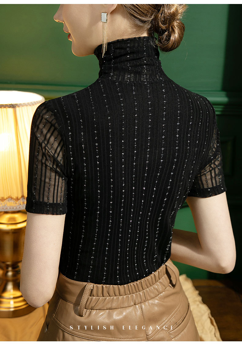 가을 새로운 하이 넥 메쉬 베이스 셔츠 여성용 슬림핏 내부 스트라이프 밝은 실크 반팔 섹시한 블랙 티셔츠