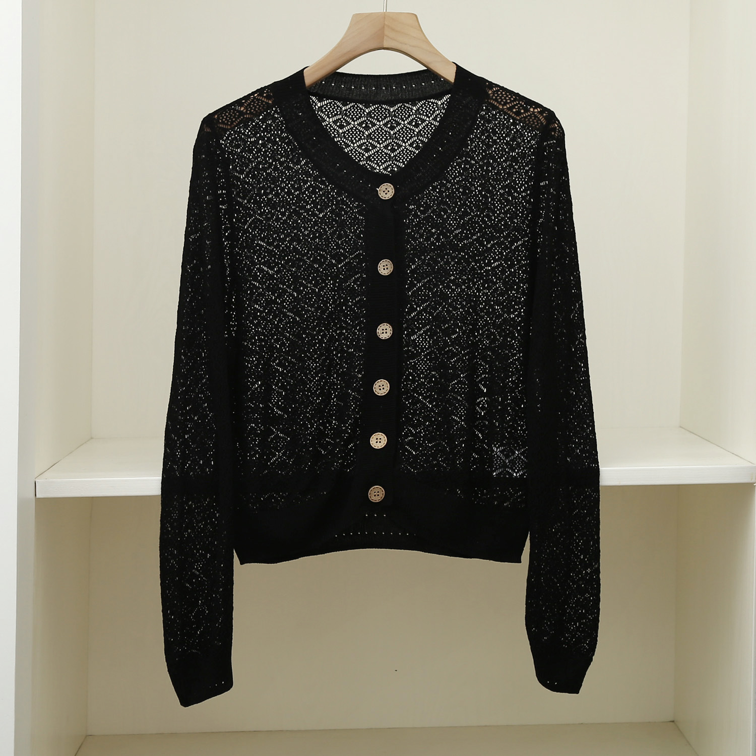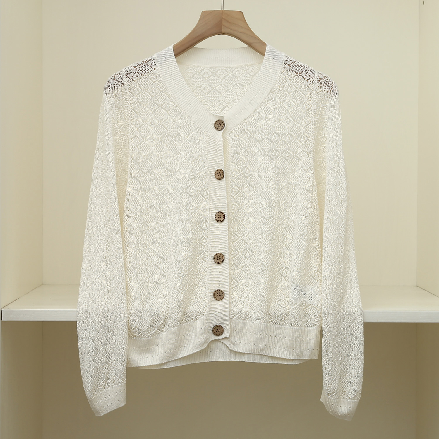 우아한 통근 짧은 니트 실크 슬림핏 가디건 회전 실크 내부 후크 컷 아웃 외부 가디건 에어컨 셔츠
