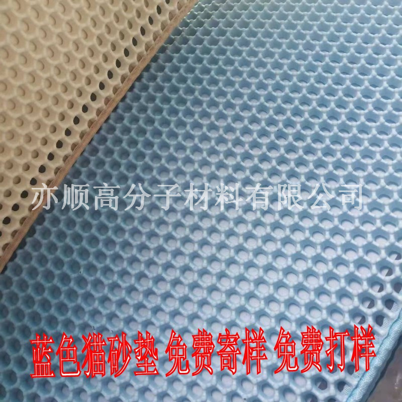颜色:(常规色黑色)白色,灰色,咖啡色,彩色等均可定做:opp袋平铺包装,可那客户要求定制包装,产品功能:适用95%以上种类的猫砂,上层通孔材料,猫砂可轻易通过,下层防水材质,猫砂、小便等脏物可聚集于此。猫砂垫为上下双层设计:上层采用六角形的洞孔凹凸设计,除了让猫砂落入后不再溅出外,圆球型的柔滑触感也可以避免猫咪抓坏,下层垫密封专门存放猫砂,底部设计成规则性的圆孔,有效防滑避免横冲直撞的猫咪滑到受伤。