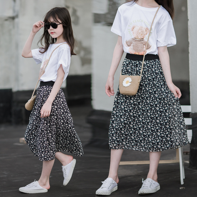 여아 중년 원피스 여아 세트 스커트 여름 서양식 여아 반팔 쉬폰 꽃무늬 하프 길이 스커트 투피스 세트