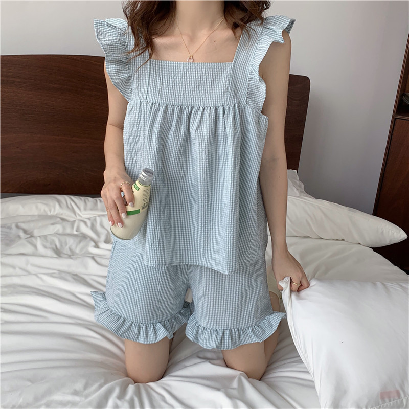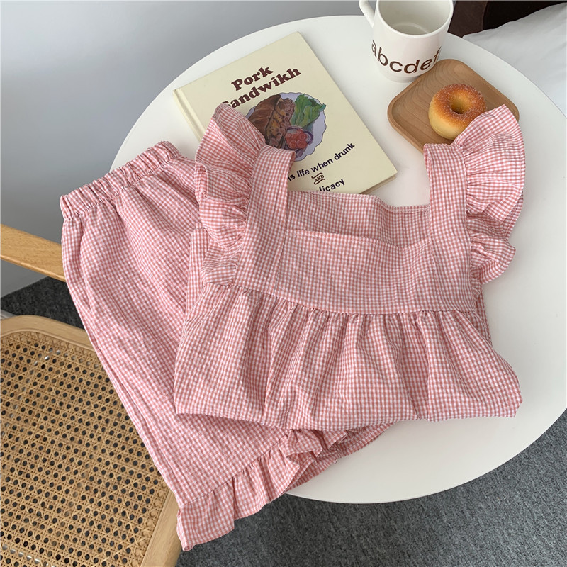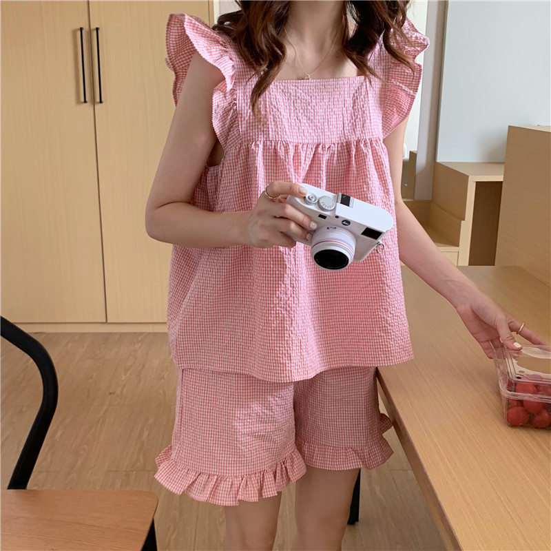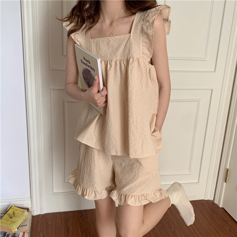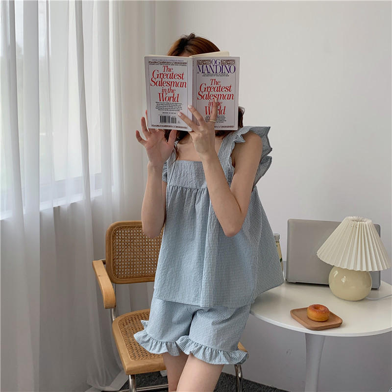 한국 in 여성의 여름 신상품 한국 스타일 신선하고 달콤한 체크 스트랩 세트 파자마 홈 의류 여성용