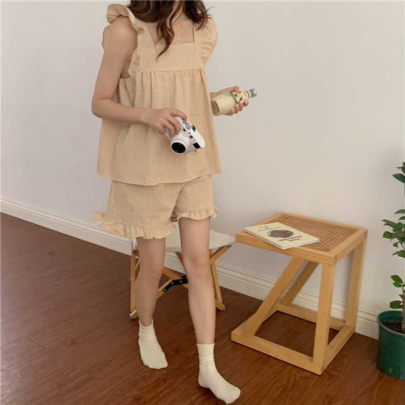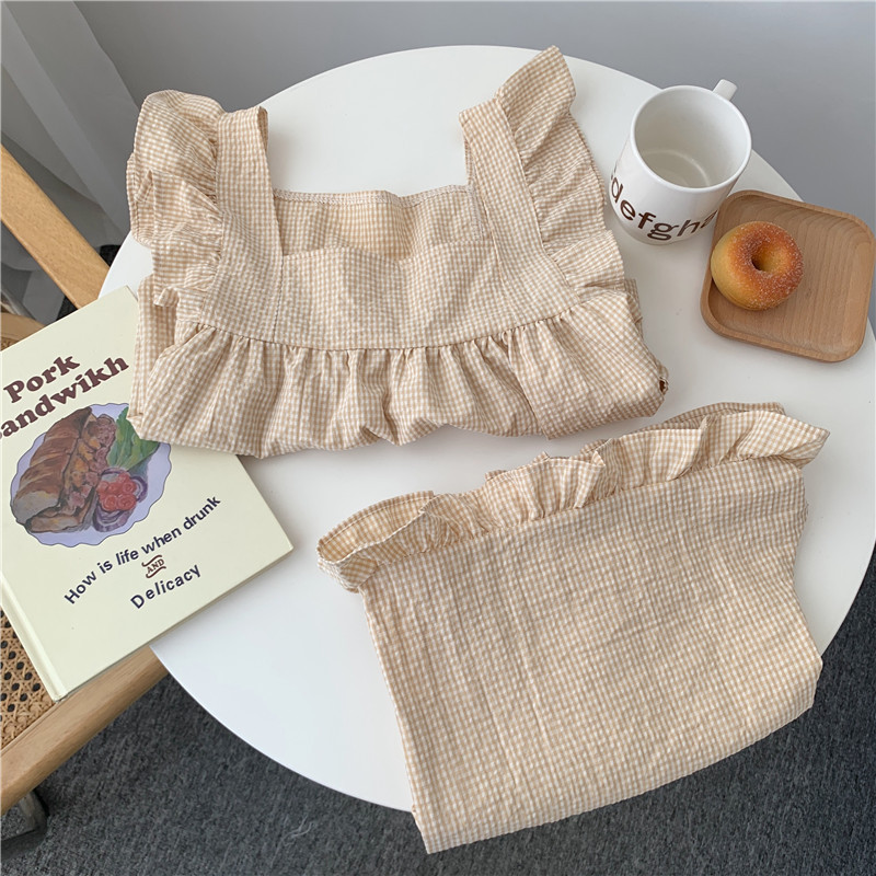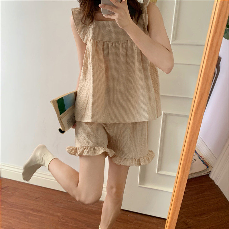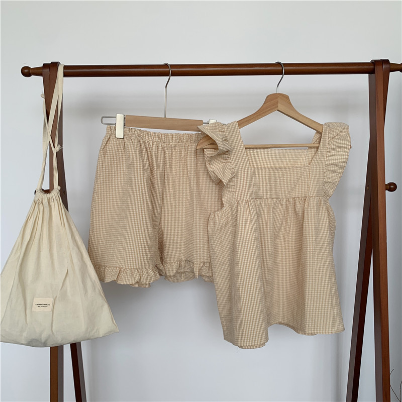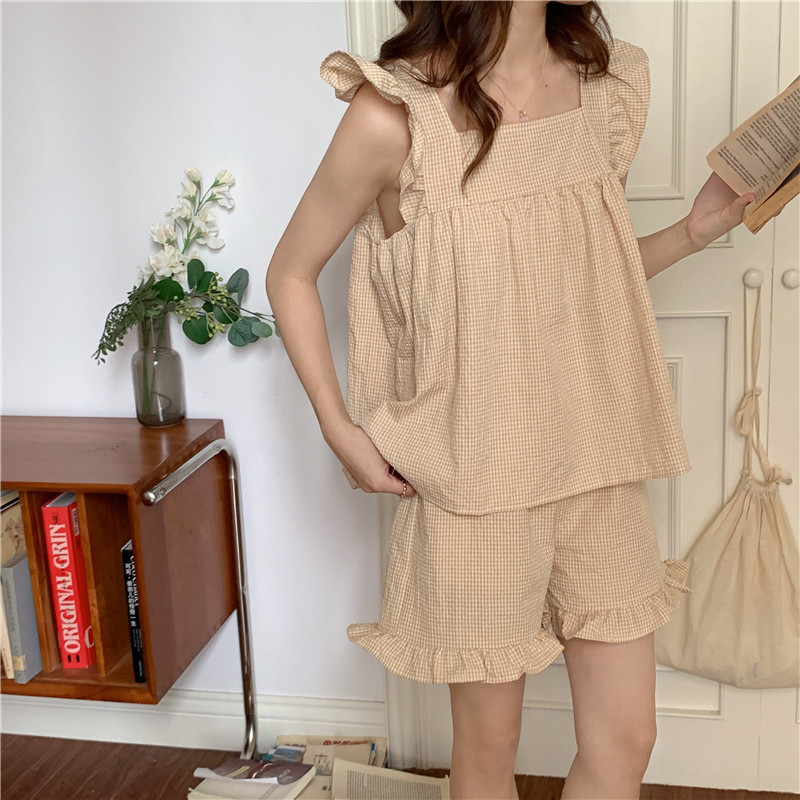 한국 in 여성의 여름 신상품 한국 스타일 신선하고 달콤한 체크 스트랩 세트 파자마 홈 의류 여성용