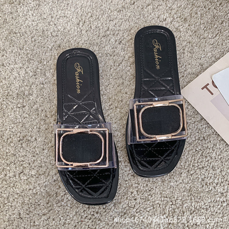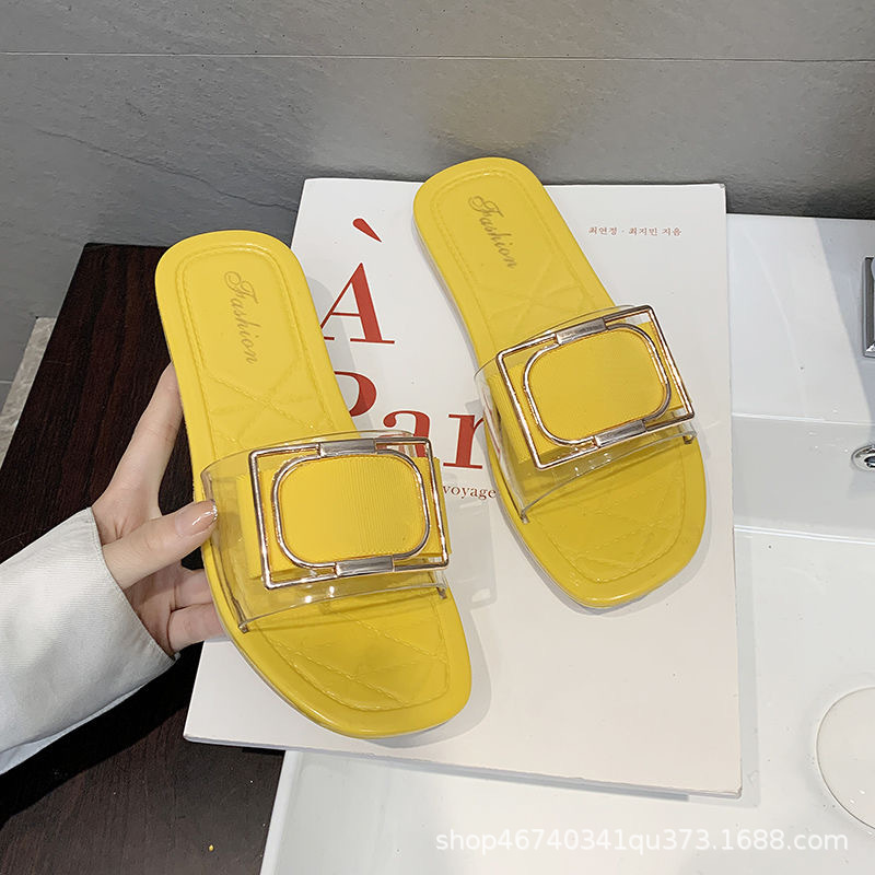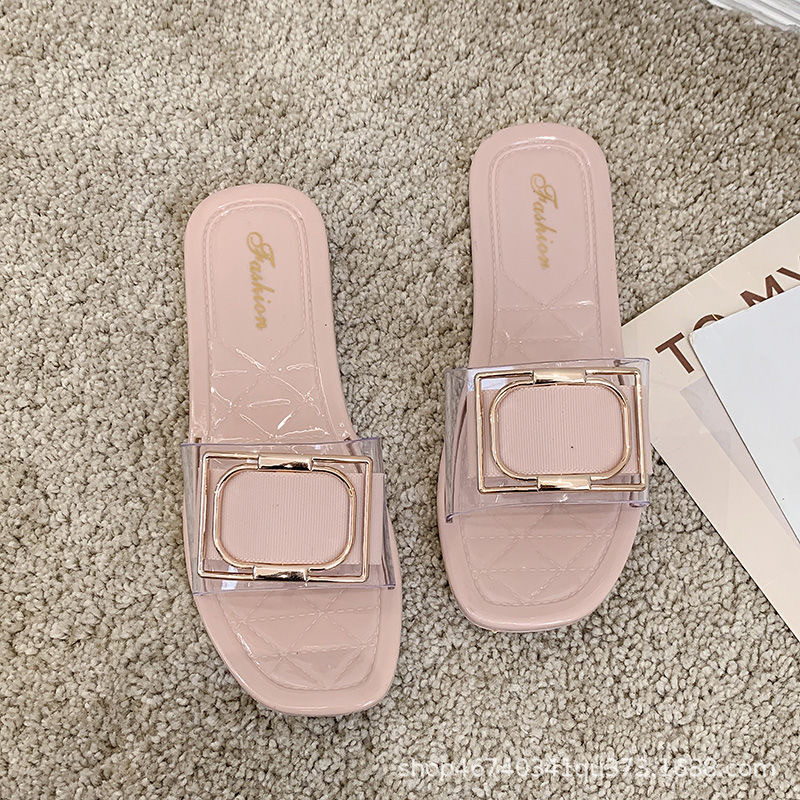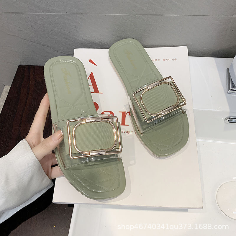 새로운 슬리퍼 여성용 여름 겉옷 사각 버클 투명 젤리 색상 패션 유럽과 미국 스타일 한국 스타일 캐주얼 학생 슬리퍼 도매스토어 가기