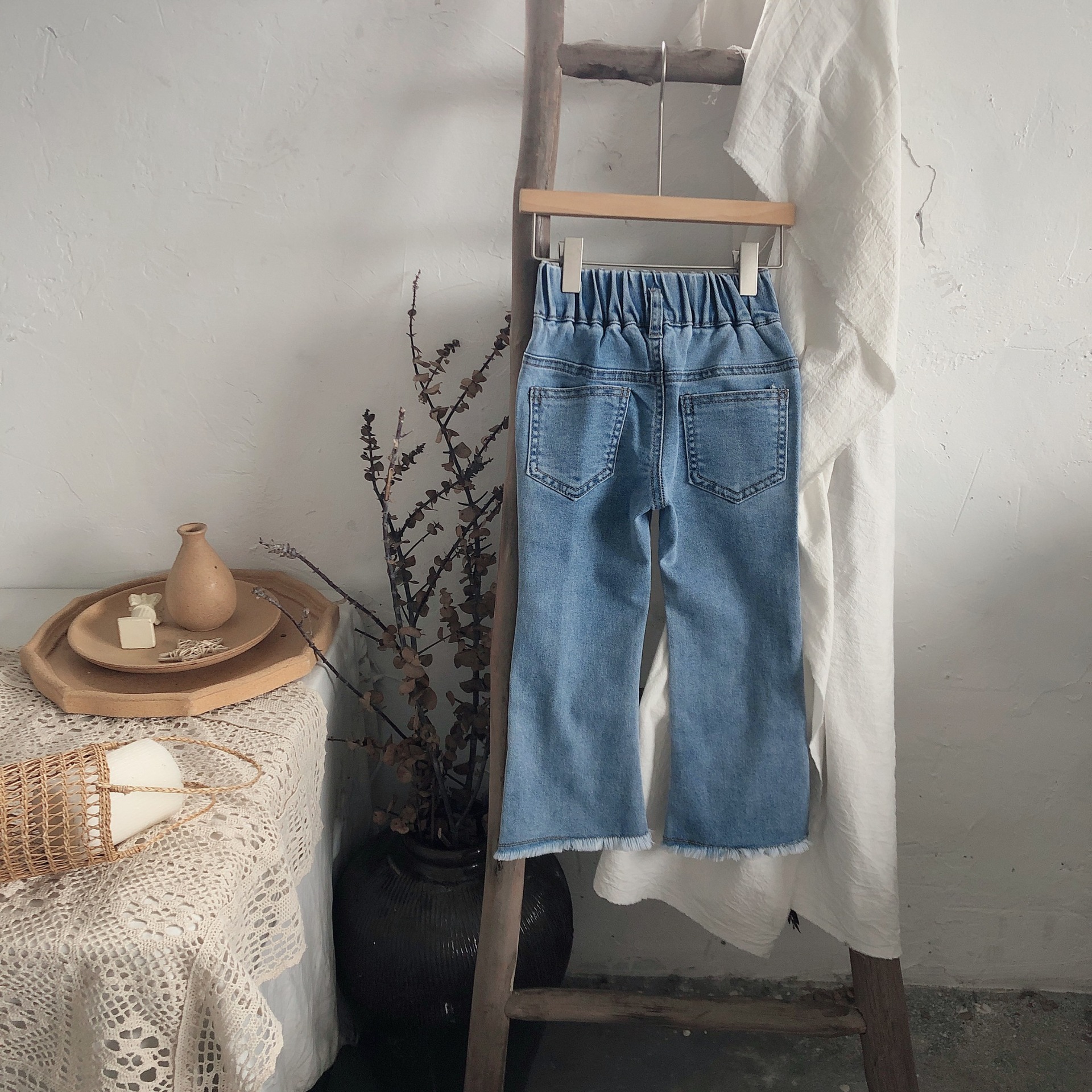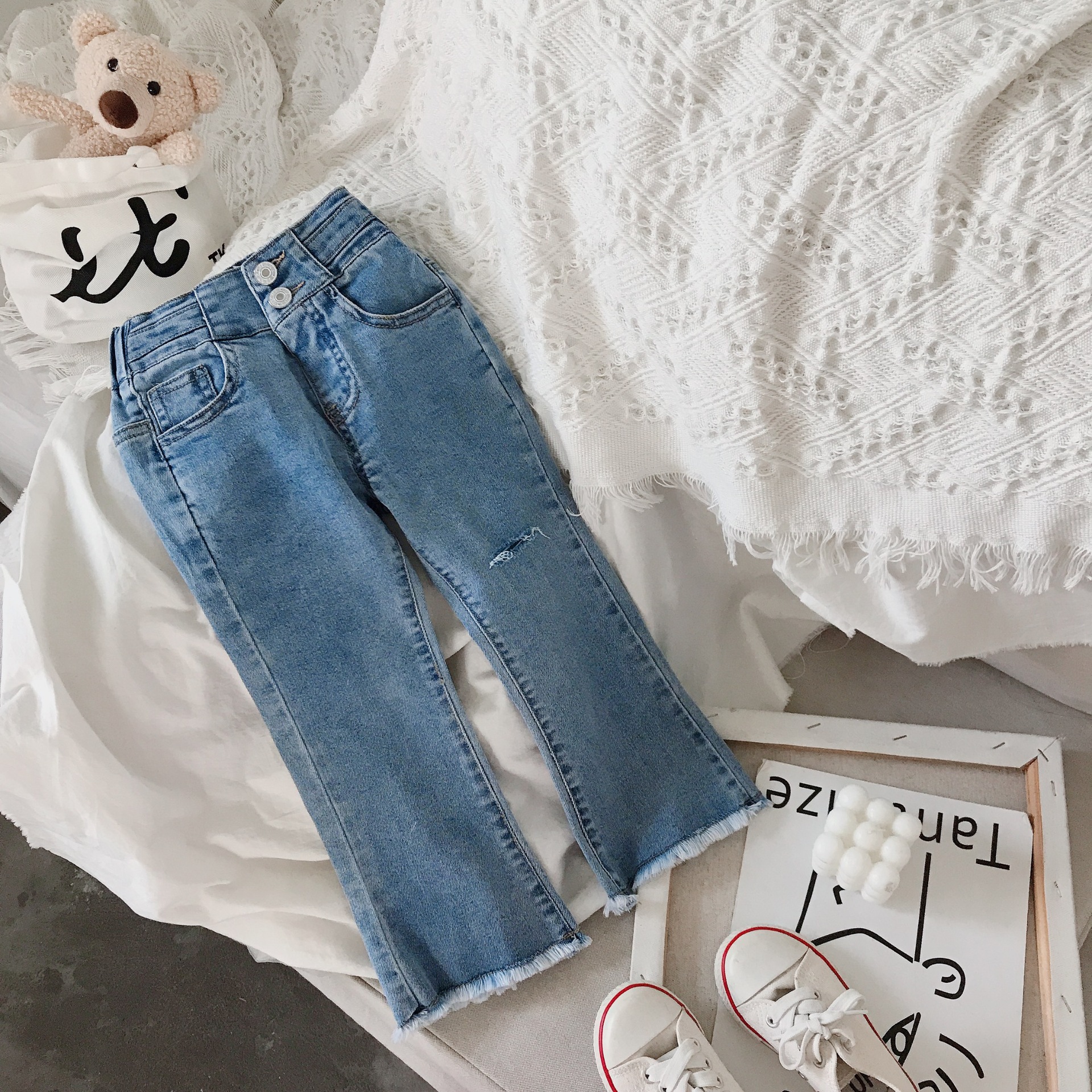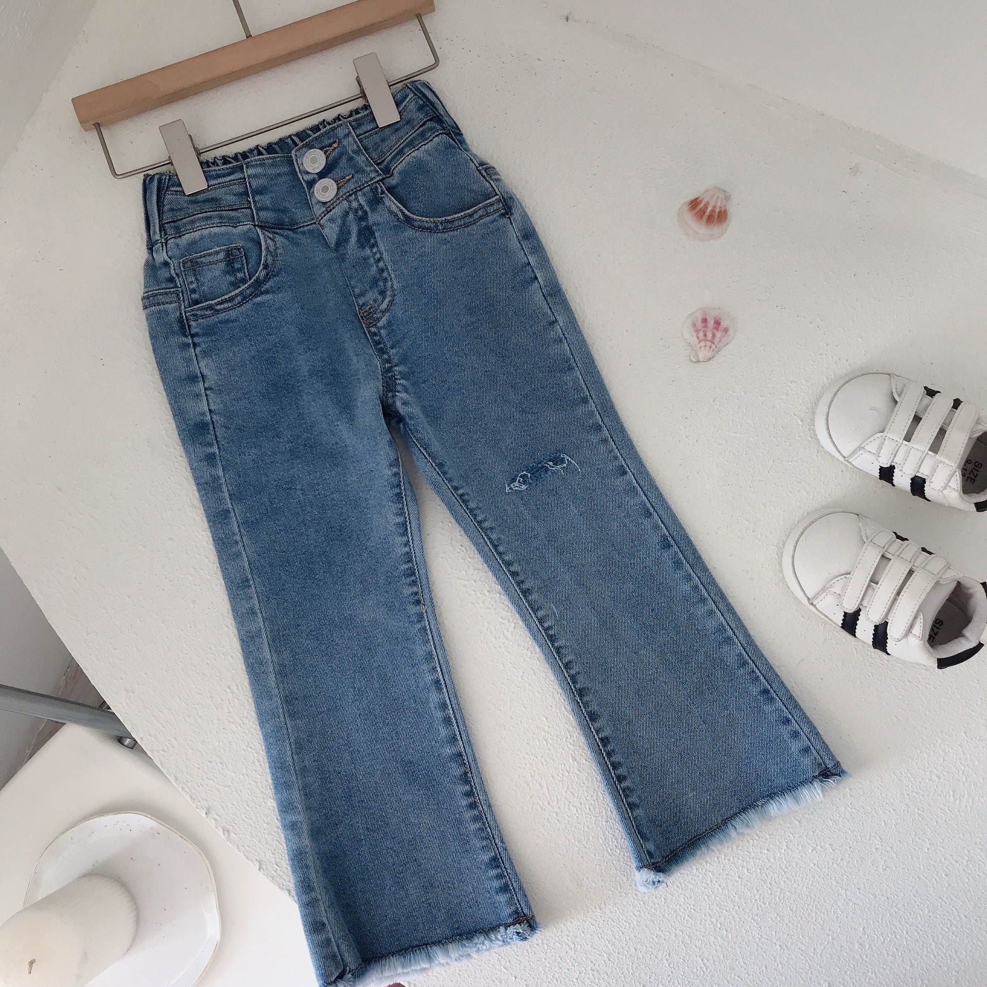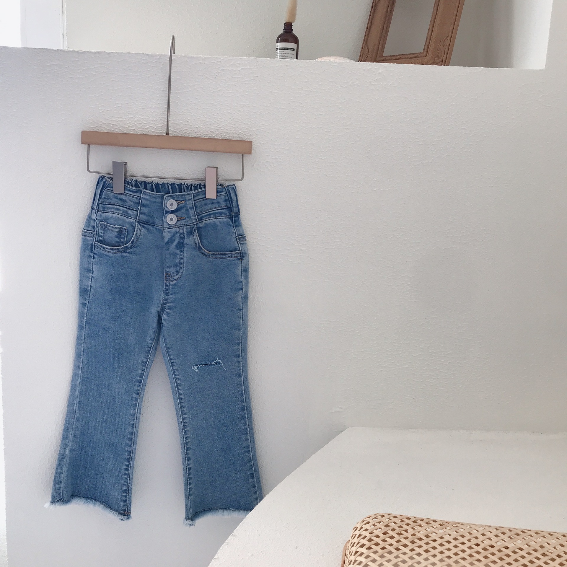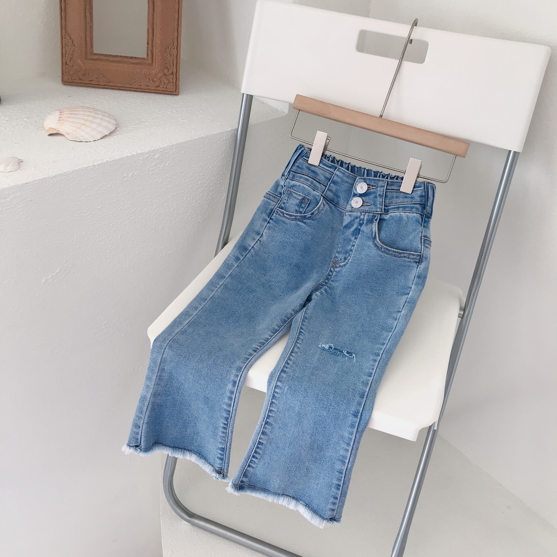 여아용 데님 팬츠 2025 가을 9부 미세 신축성 바지 아기용 찢어진 하이웨이스트 플레어 팬츠 하이웨이스트 슬림핏스토어 가기