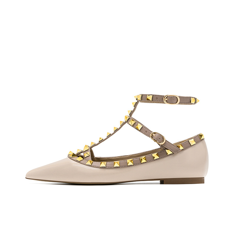 裸色尖头单鞋女2024春季浅口漆皮百搭欧美软底船鞋平底铆钉鞋通勤