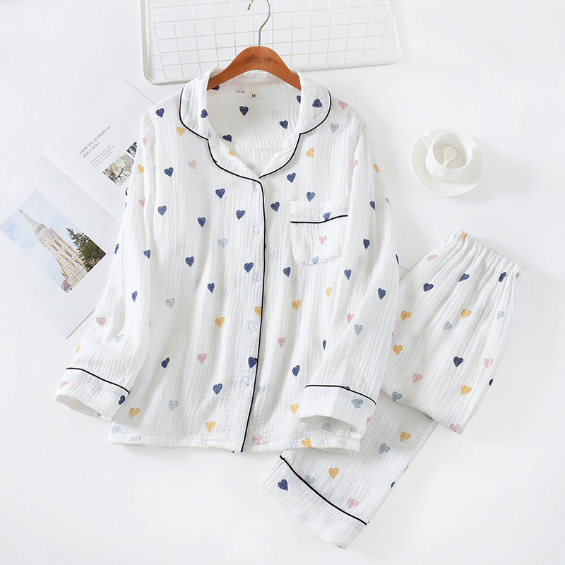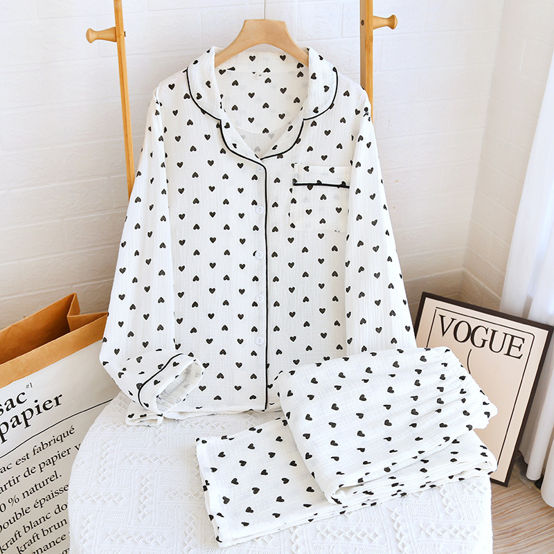 여자의 옷깃 면 씻어 크레이프 잠옷 세트 사계절 얇은 긴 소매 바지 작은 사랑 플러스 사이즈 가정 옷
