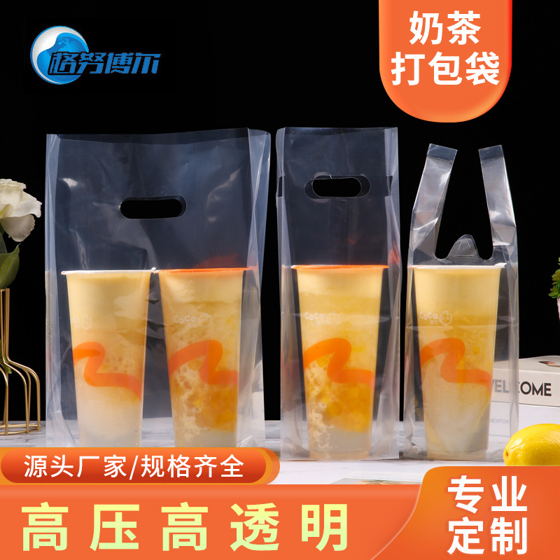 밀크티 컵 일회용 가방 고급 투명 밀크티 포장 가방 맞춤형 싱글/더블 컵 플라스틱 손잡이 주스 가방