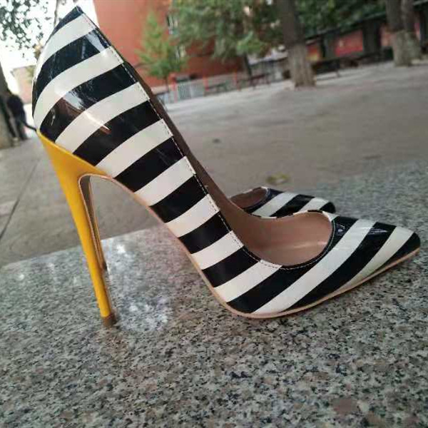 국경 간 대외 무역 도매 스트라이프 하이힐 12cm 뾰족한 스틸레토 힐 얕은 입 신발 패션 부드러운 가죽 색상 일치하는 여성 신발스토어 가기