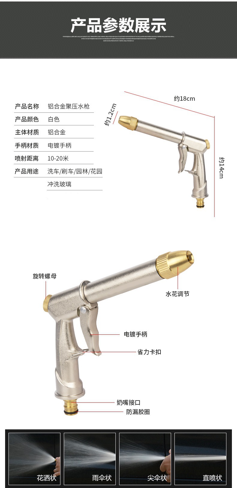 모든 금속 전기 도금 연장 폴리 압력 물총 헤드 가정용 수돗물 세차 브러시 자동차 스프레이 노즐 급수 원예 그랩