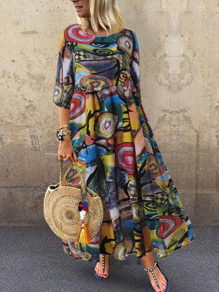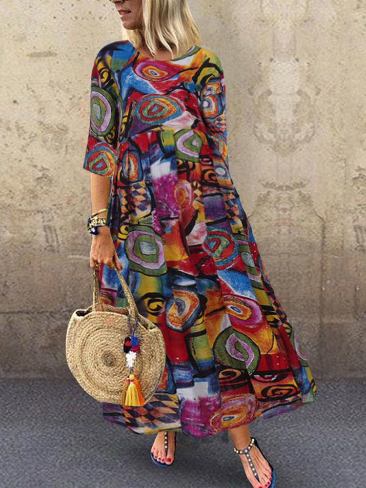 유럽과 미국의 2021 AliExpress 새로운 여성의 긴 레트로 보헤미안 주름 소매 벨트 허리 인쇄 원피스스토어 가기
