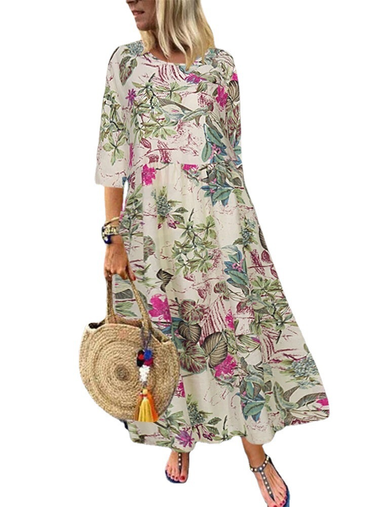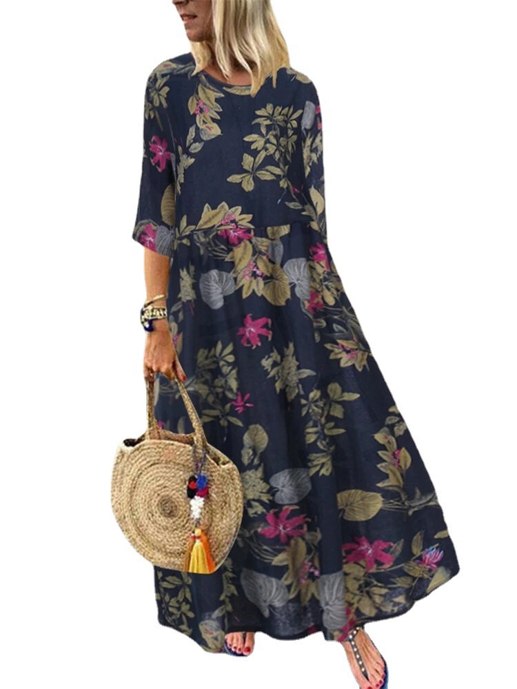 유럽과 미국의 2021 AliExpress 새로운 여성의 긴 레트로 보헤미안 주름 소매 벨트 허리 인쇄 원피스
