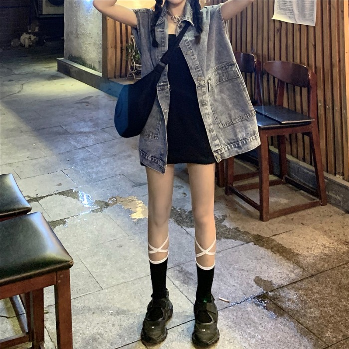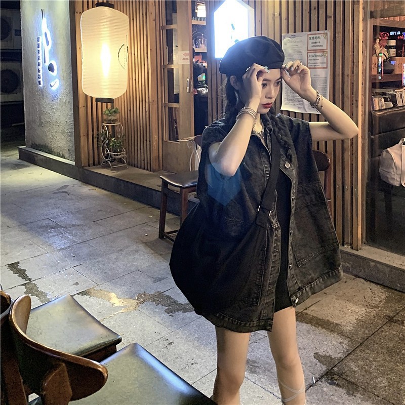 데님 조끼 재킷 여성 봄과 가을 한국식 느슨한 중간 길이 모든 매치 아우터 민소매 조끼스토어 가기