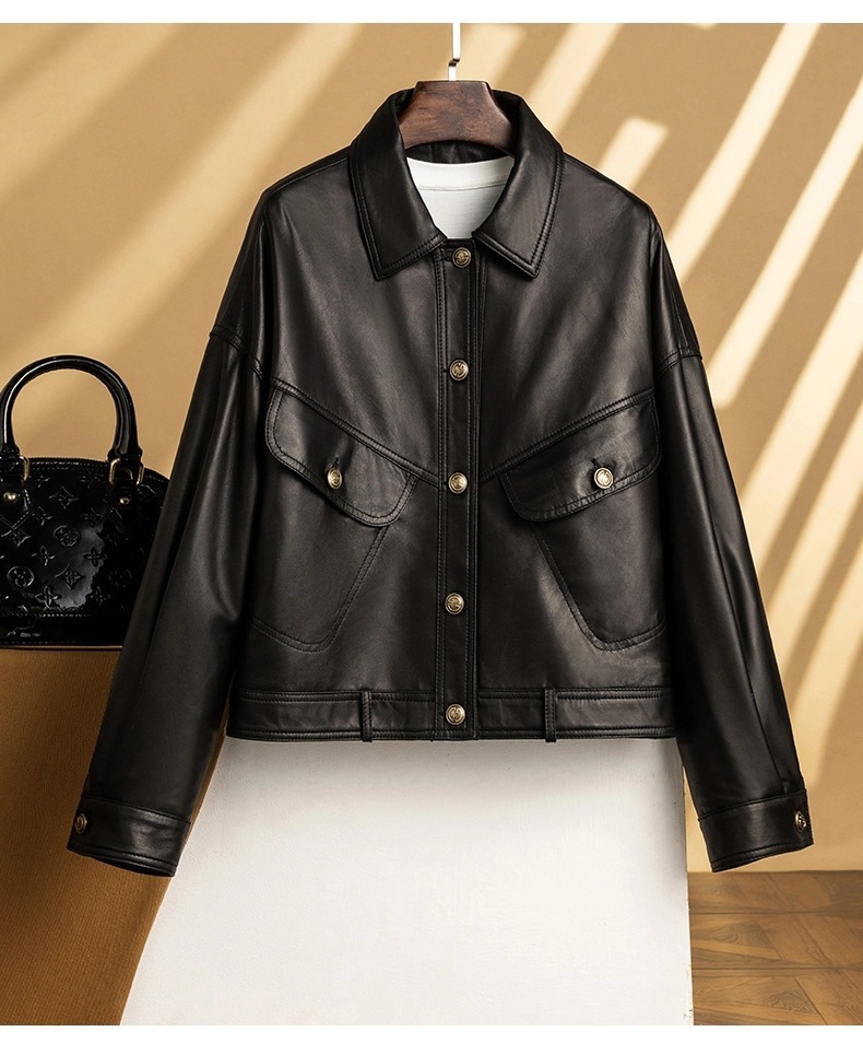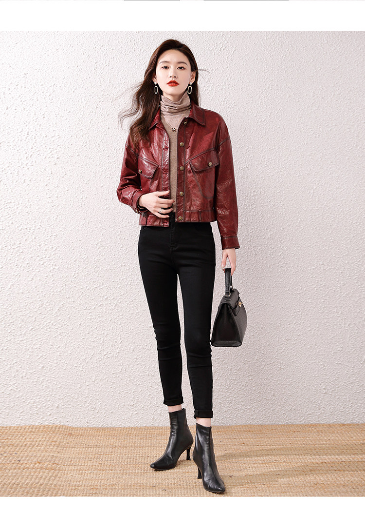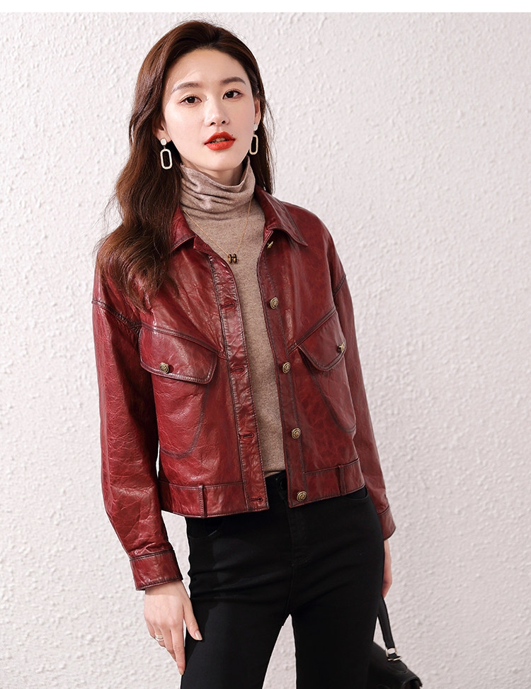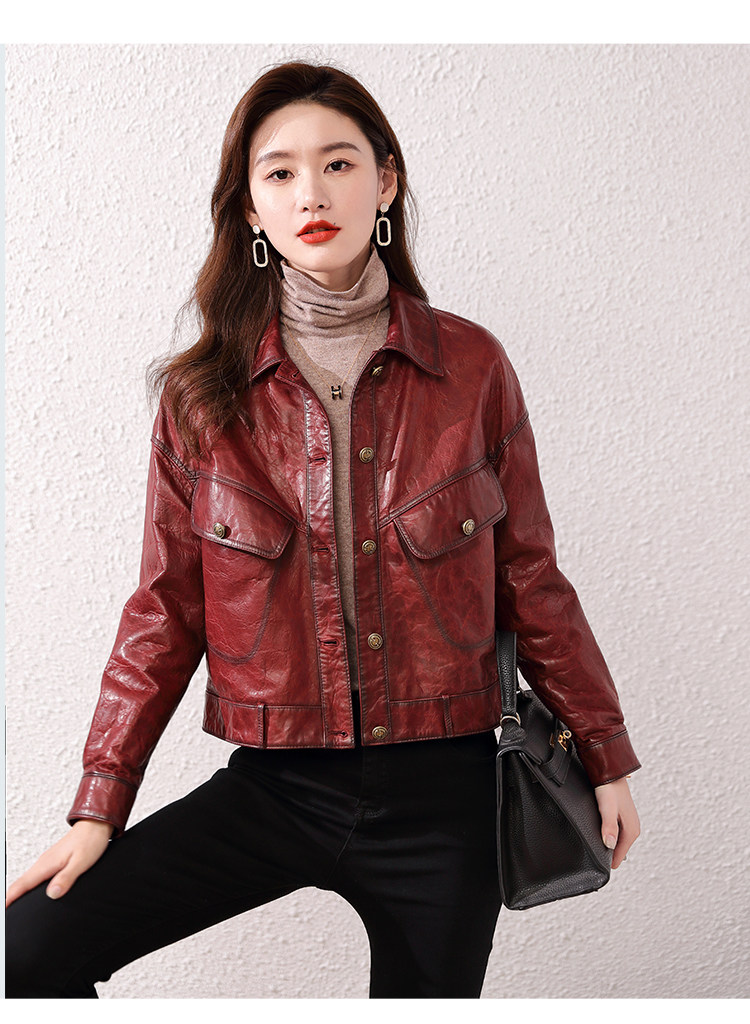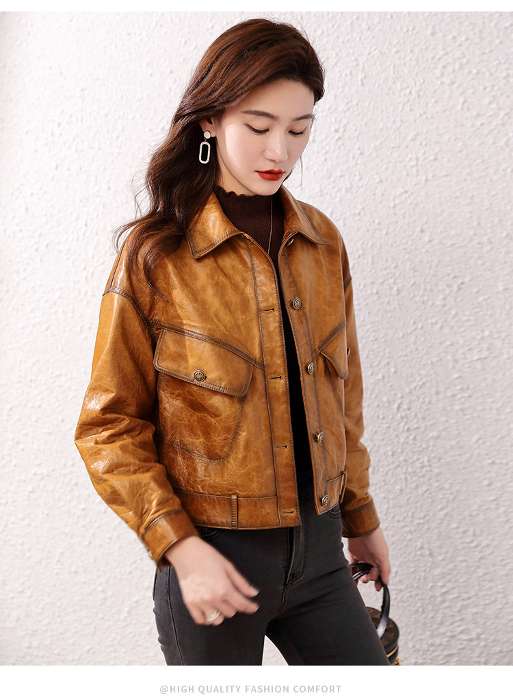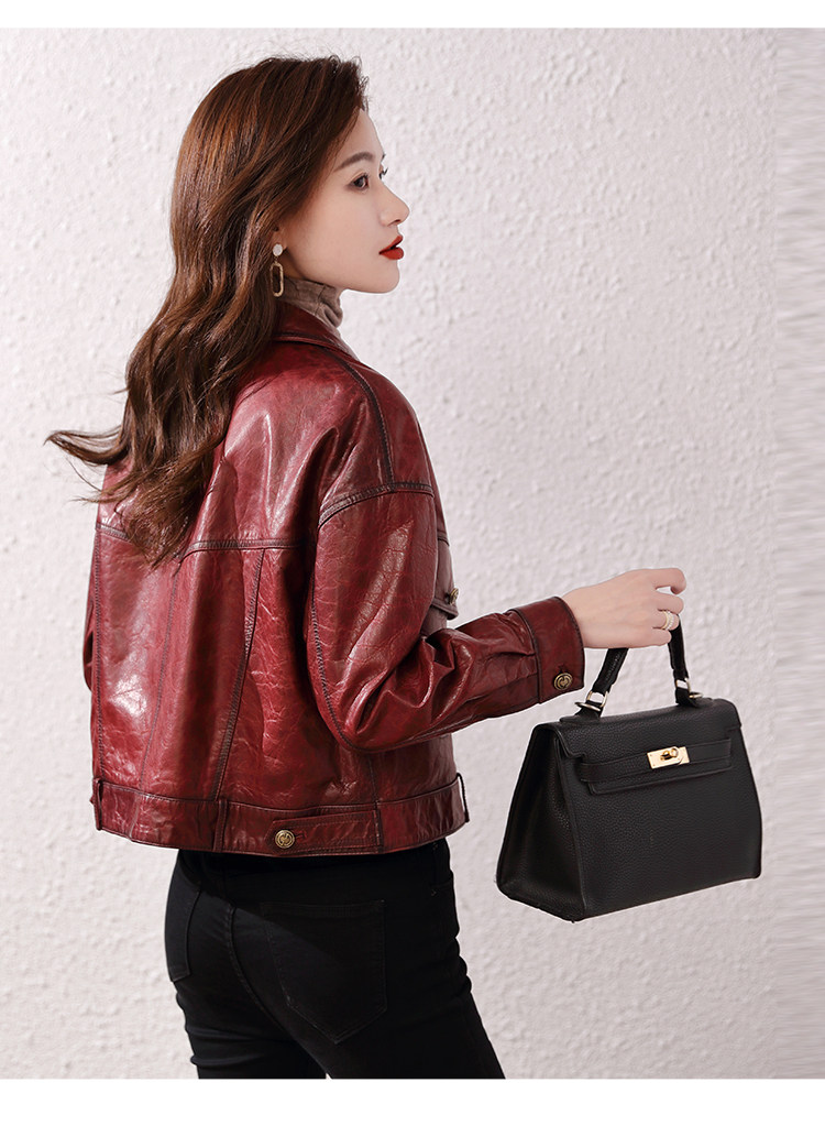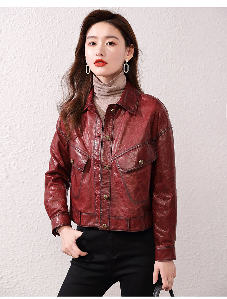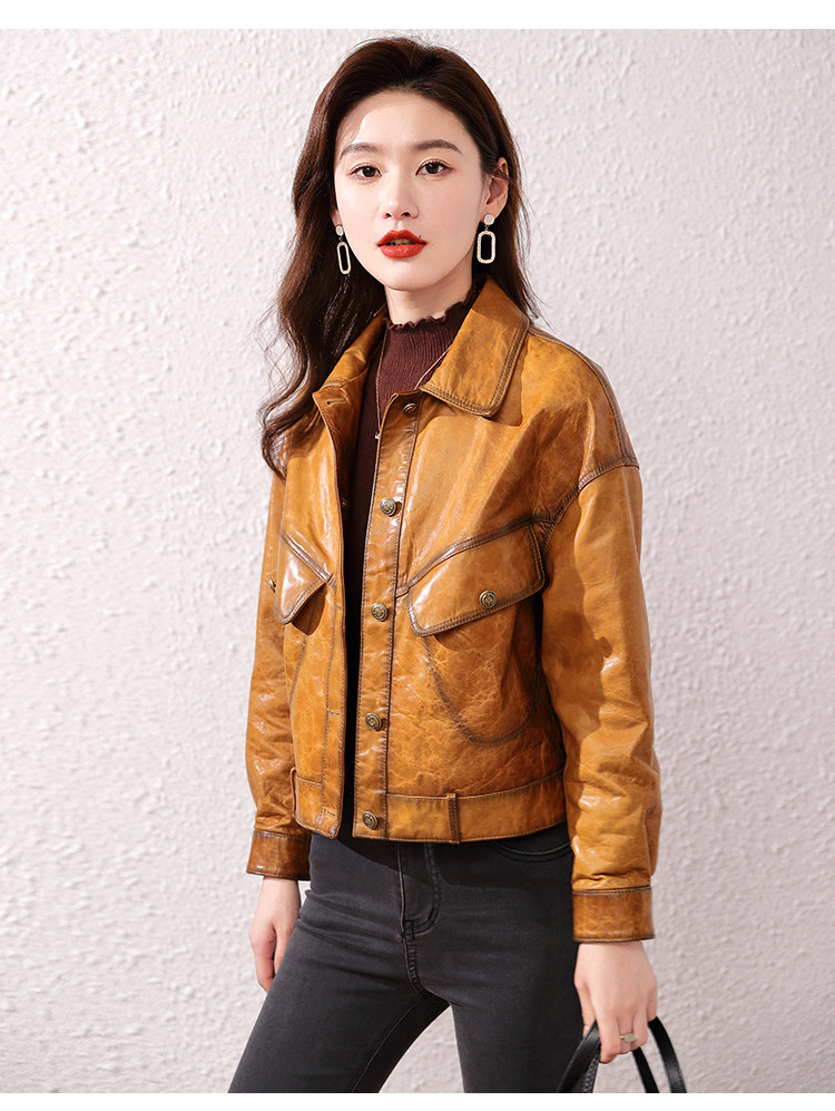 2026 신형 허닝 천연 가죽 여성용 짧은 오일왁스 양가죽 캐주얼 라펠 가죽 재킷