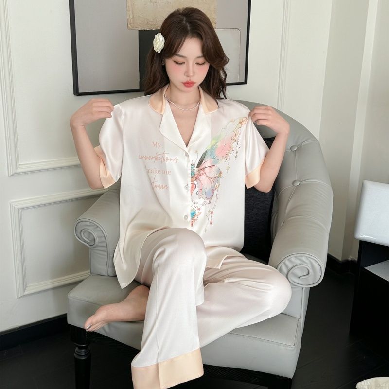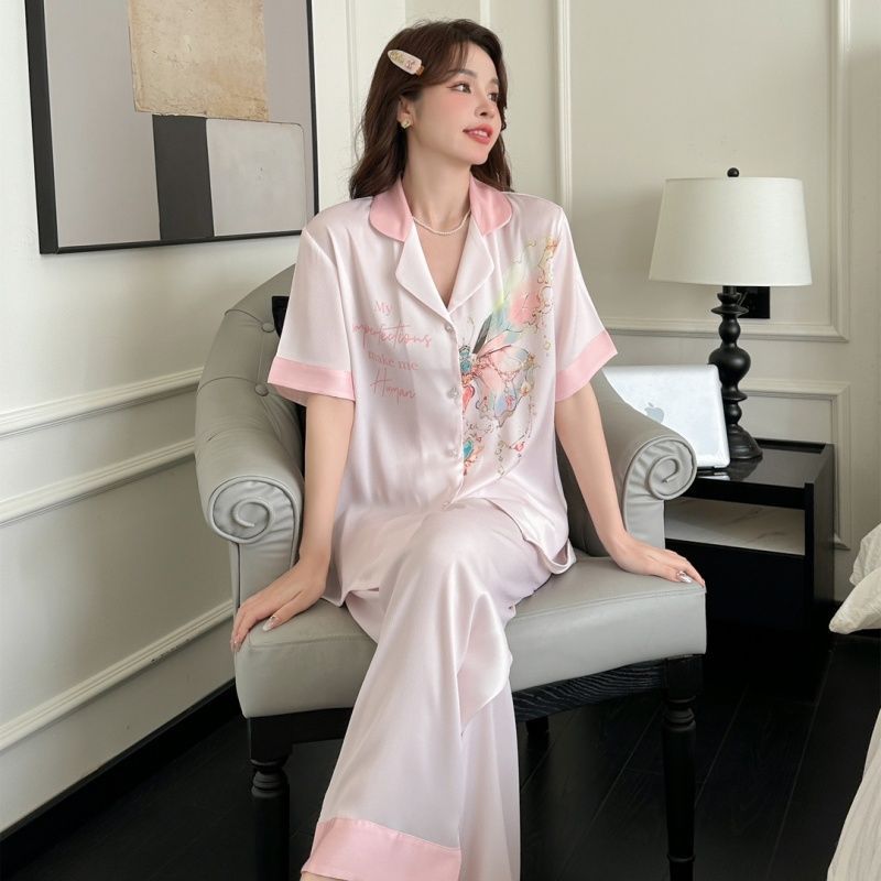 2026년 신상 V넥 네트워크 라이브 방송용 50수 모조 실크 단색 긴팔 긴바지 여성용 얇은 잠옷 및 홈웨어