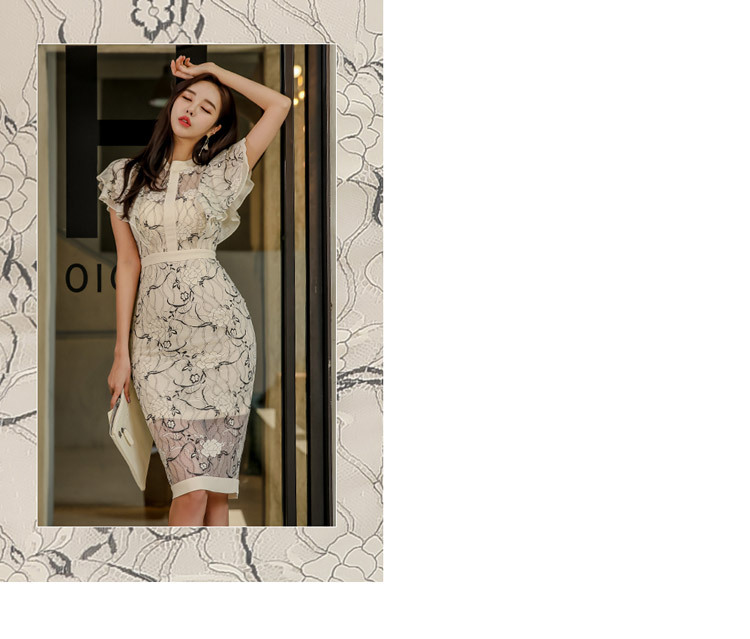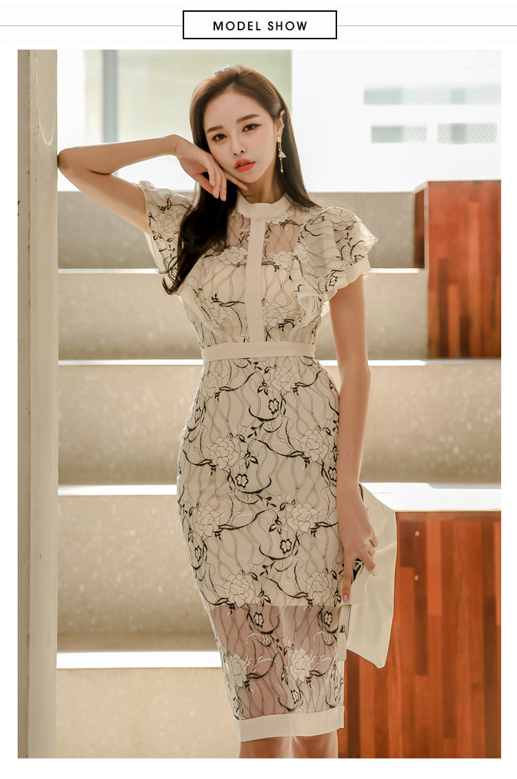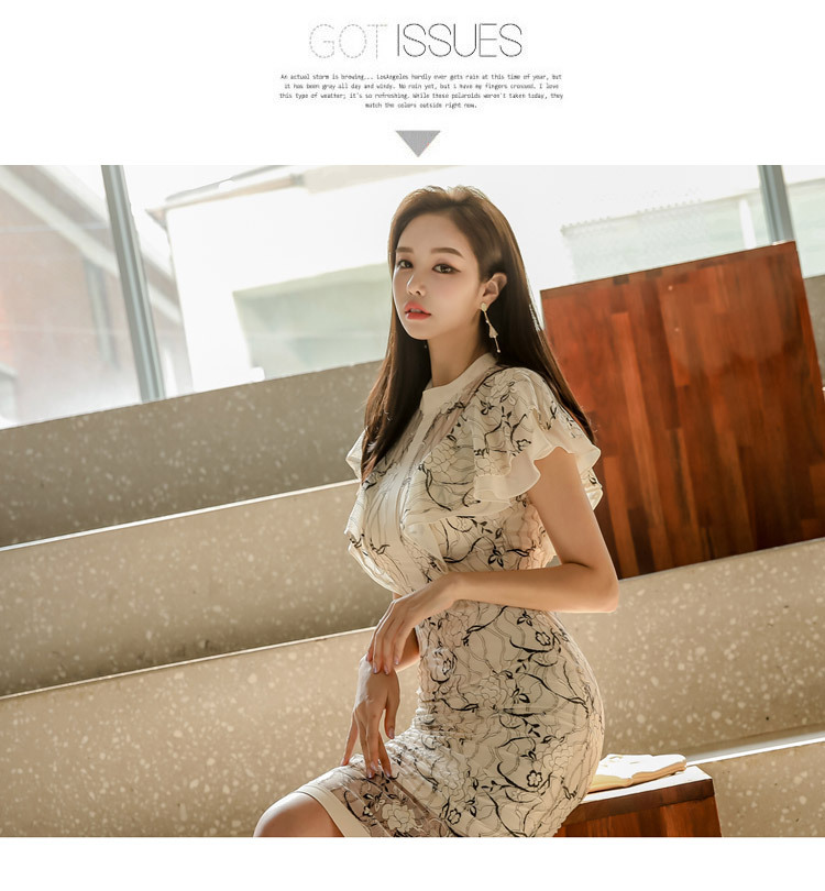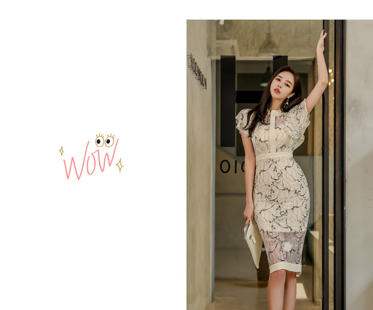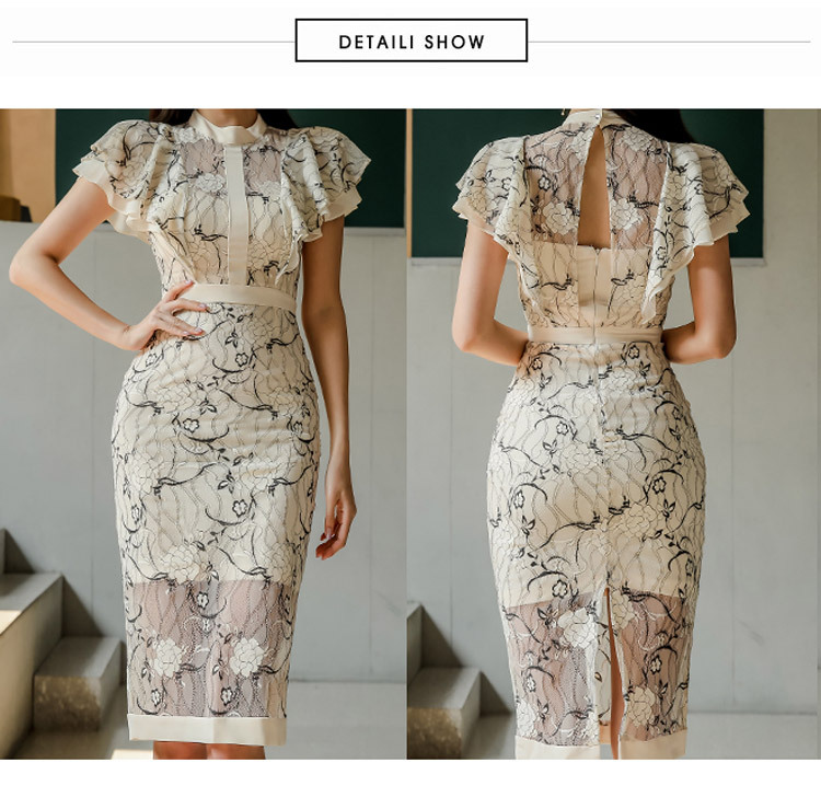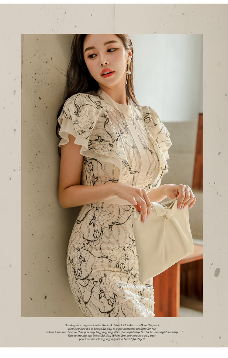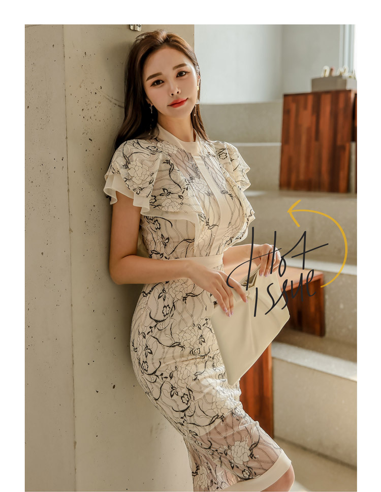 여름 새로운 한국 스타일 OL 우아한 슬림 핏 스티치 연잎 소매 패션 레이스 엉덩이 원피스스토어 가기