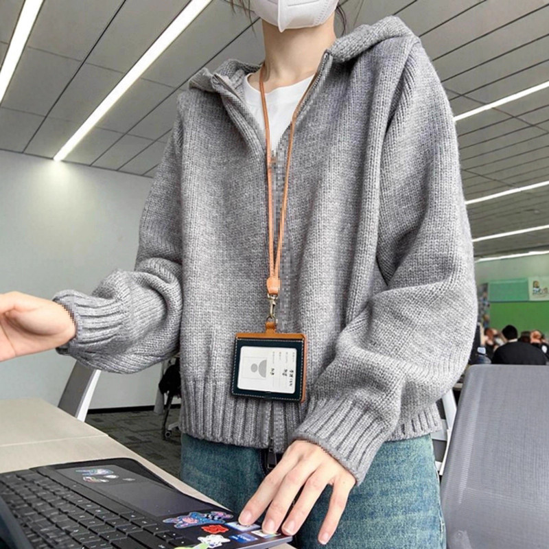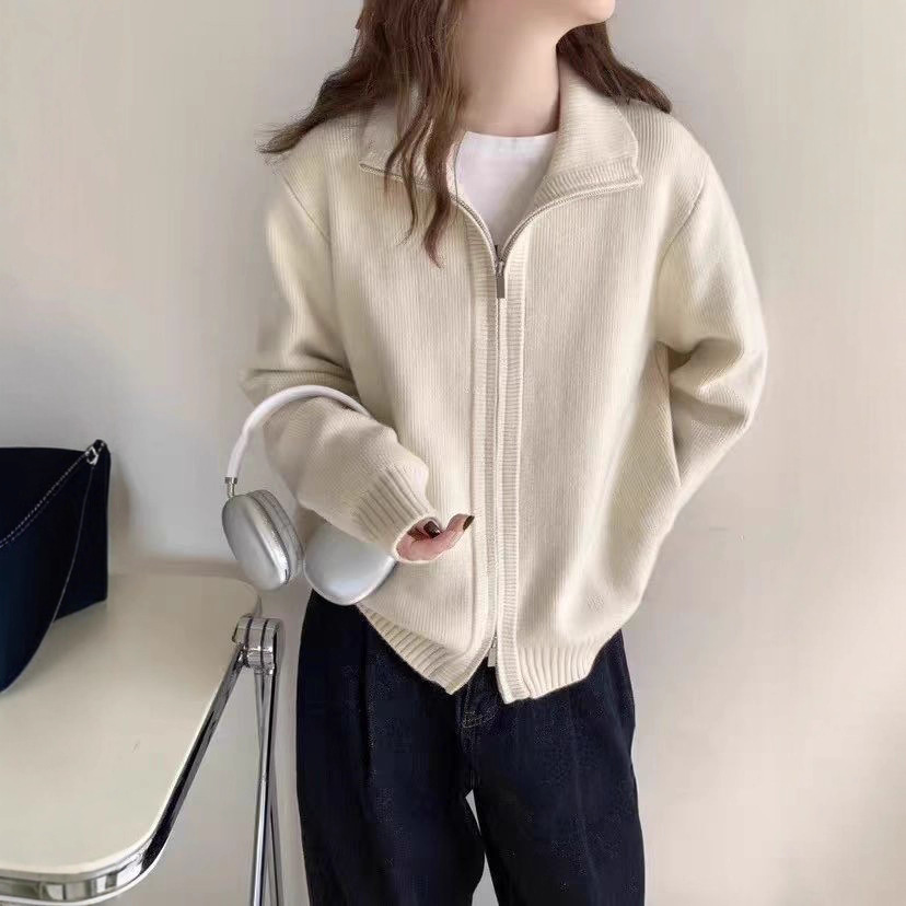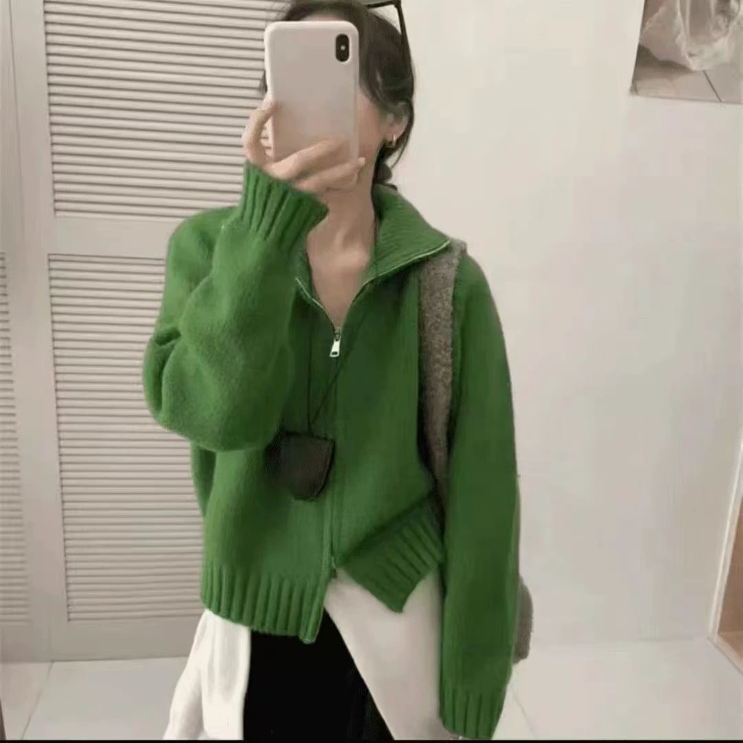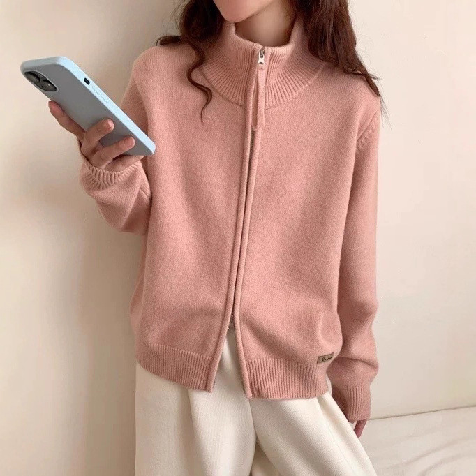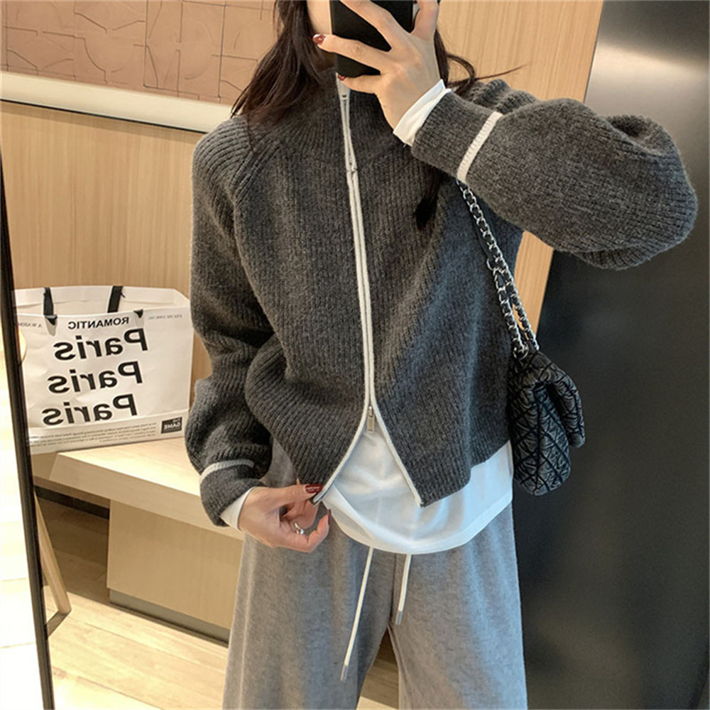 韩系秋冬新款双拉链立领慵懒风宽松显瘦高级感毛衣女外套针织开衫