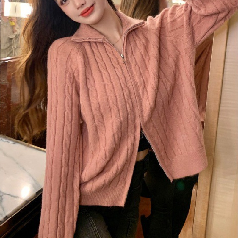 2025韩国新款高级感翻领双拉链麻花纯色毛衣女软糯针织衫开衫外套
