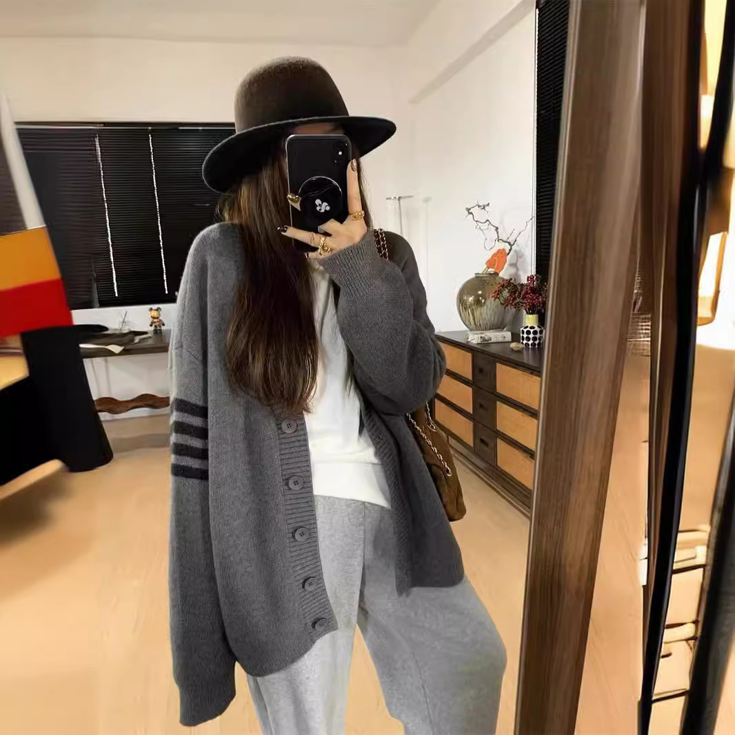 日系减龄学院风拼色条纹V领针织开衫女秋冬慵懒宽松百搭毛衣外套
