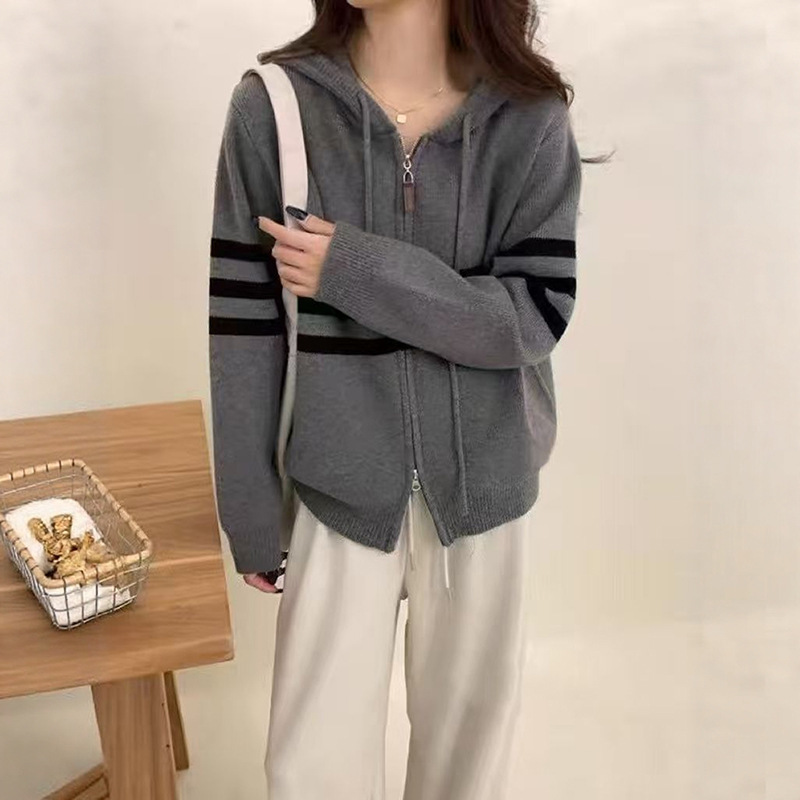 韩系条纹连帽慵懒风双拉链针织衫开衫女装25秋季显瘦简约毛衣外套