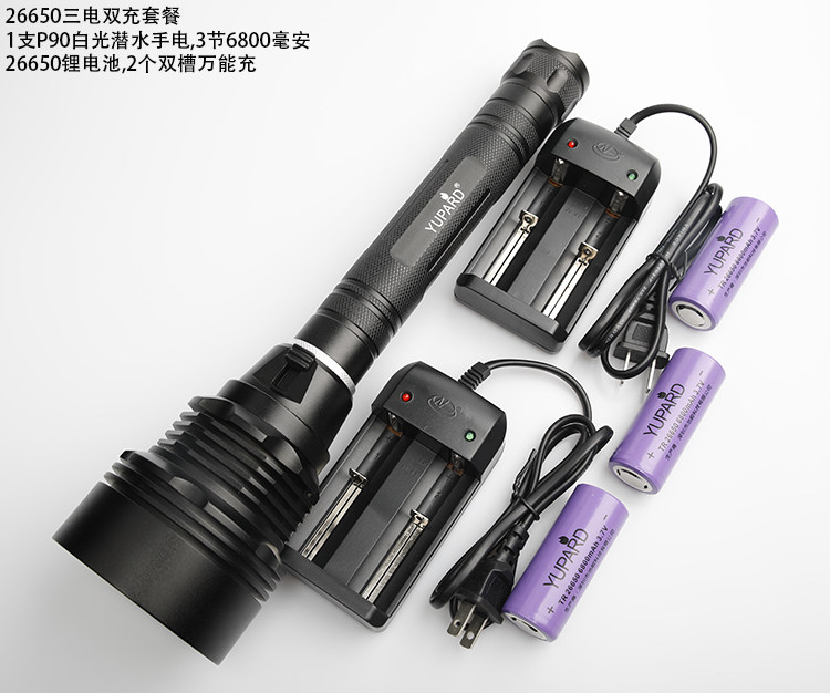 亲们:26650三电双充套餐是指1支P90潜水手电,3节6800毫安26650锂电池,2个双槽万能充。