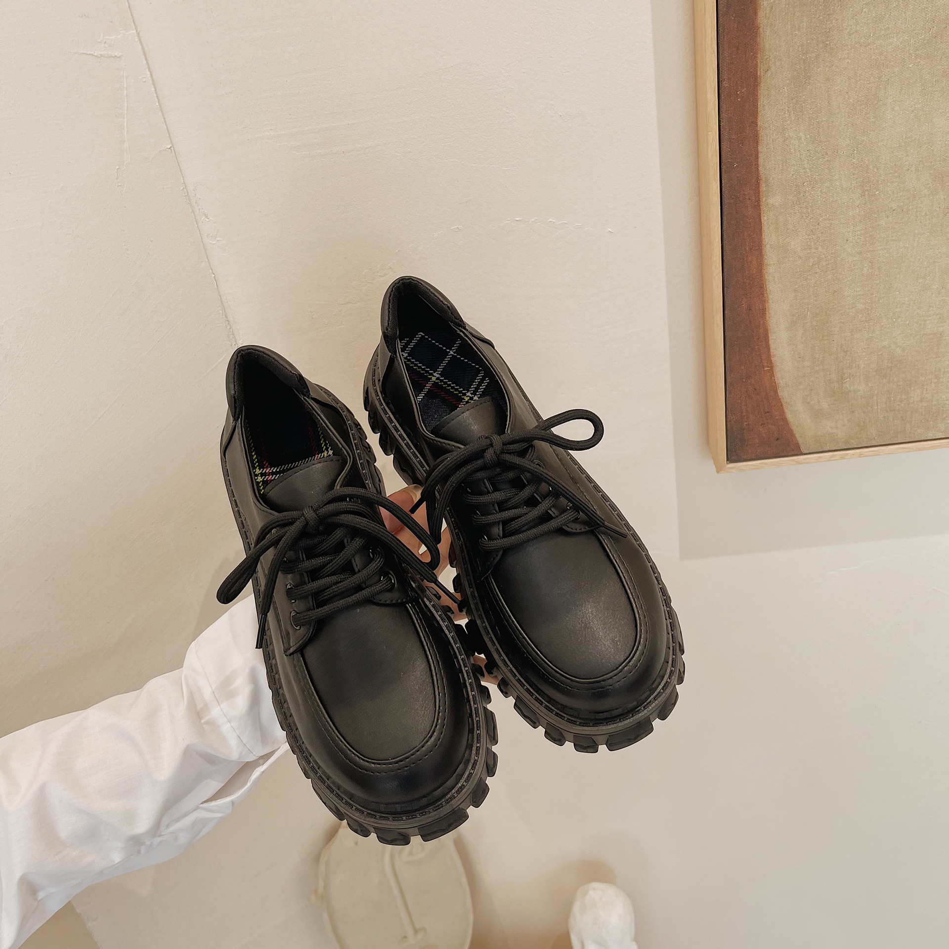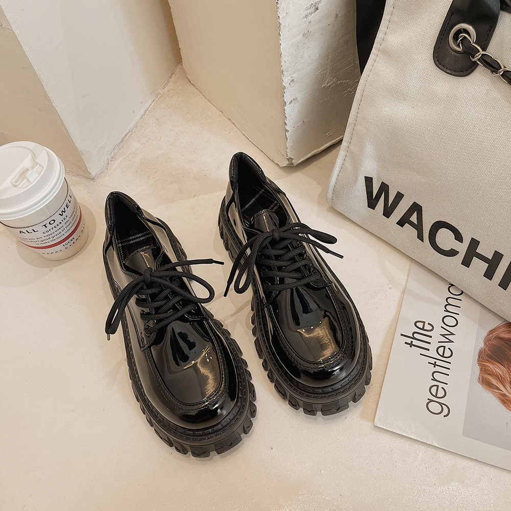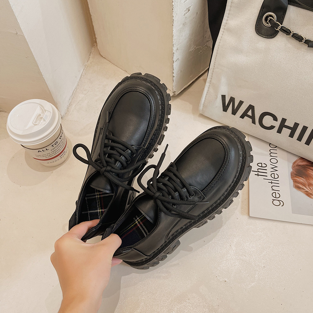 2022 여름 신상품 블랙 모든 매치 플랫폼 캐주얼 신발 여성의 복고풍 영국 스타일 패션 레이스 업 신발 jk College스토어 가기