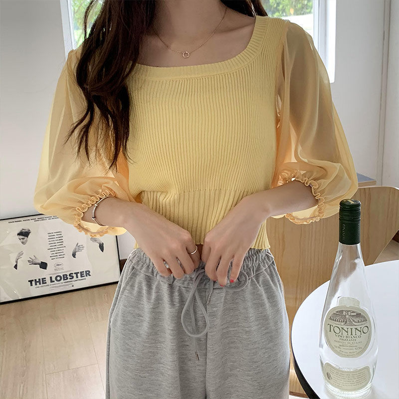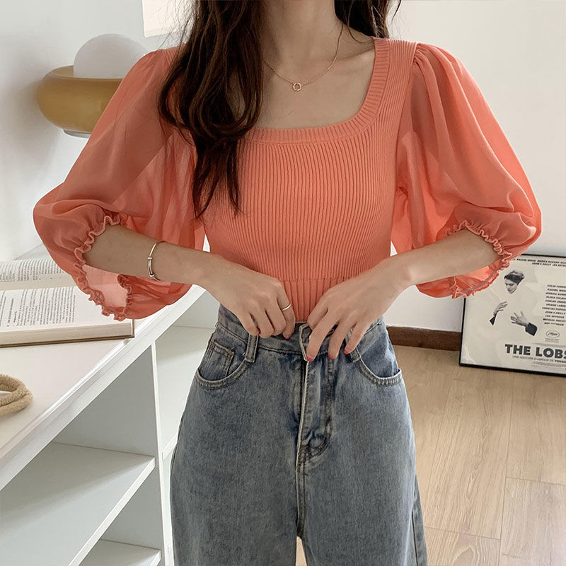 2025년 여름 신상 한국 스타일 스퀘어넥 솔리드 컬러 배색 쉬폰 중간 소매 니트 얇은 탈지니스 슬림핏 여성 상의스토어 가기